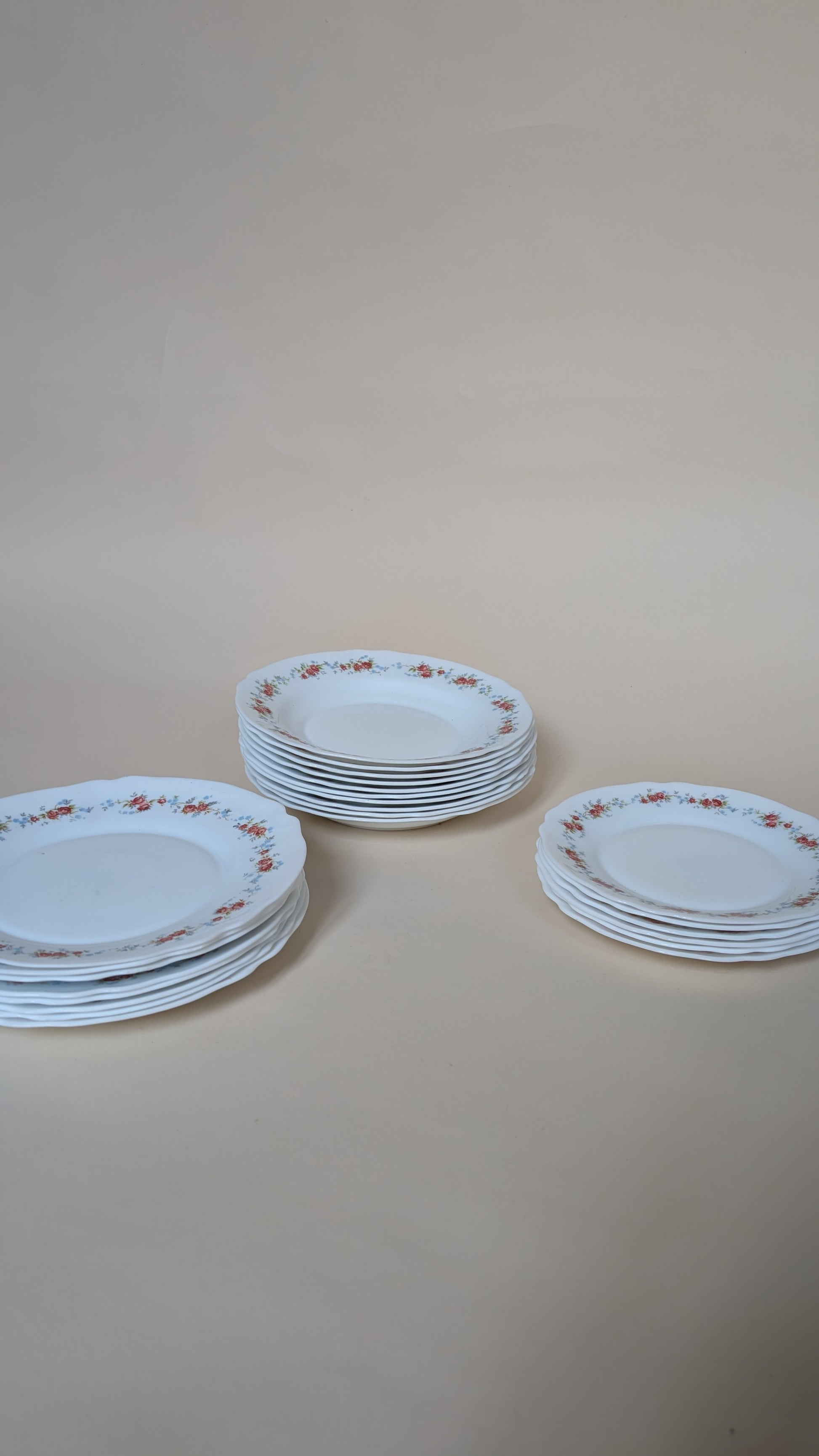 Lot de dix assiettes creuses Arcopal est fabriqué en verre opale blanc très résistant. Elles présentent un bord légèrement festonné et sont décorées d'un motif de petites roses rouges et de feuillage autour du bord. Ces assiettes sont idéales pour les soupes, les pâtes ou les plats en sauce.