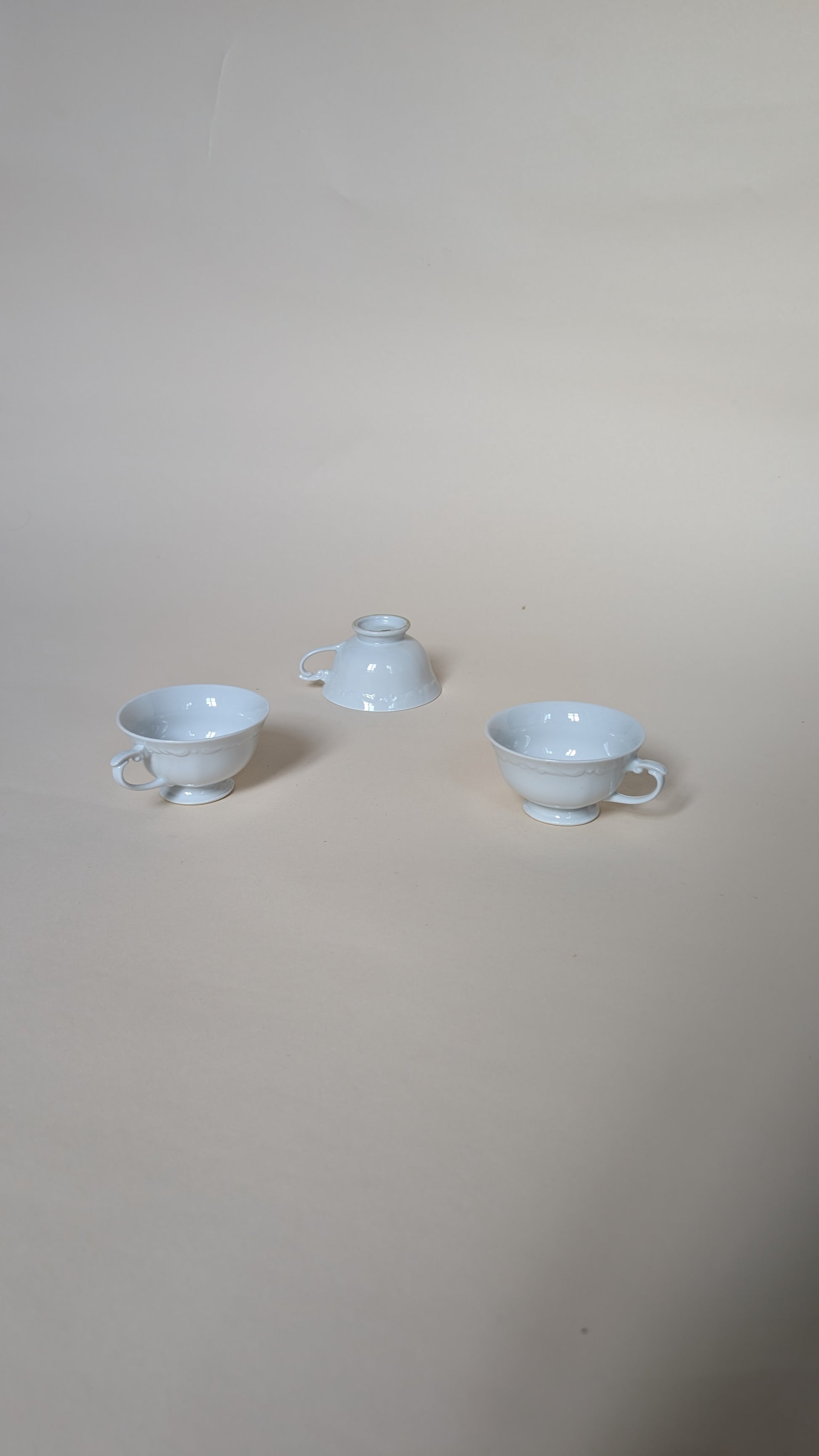 Lot de trois tasses blanches est fabriqué en céramique fine (porcelaine ou faïence). Elles présentent une forme sur pied classique et sont décorées d'un motif délicat en relief sous le bord. Parfait pour un service de thé ou de café élégant et intemporel.