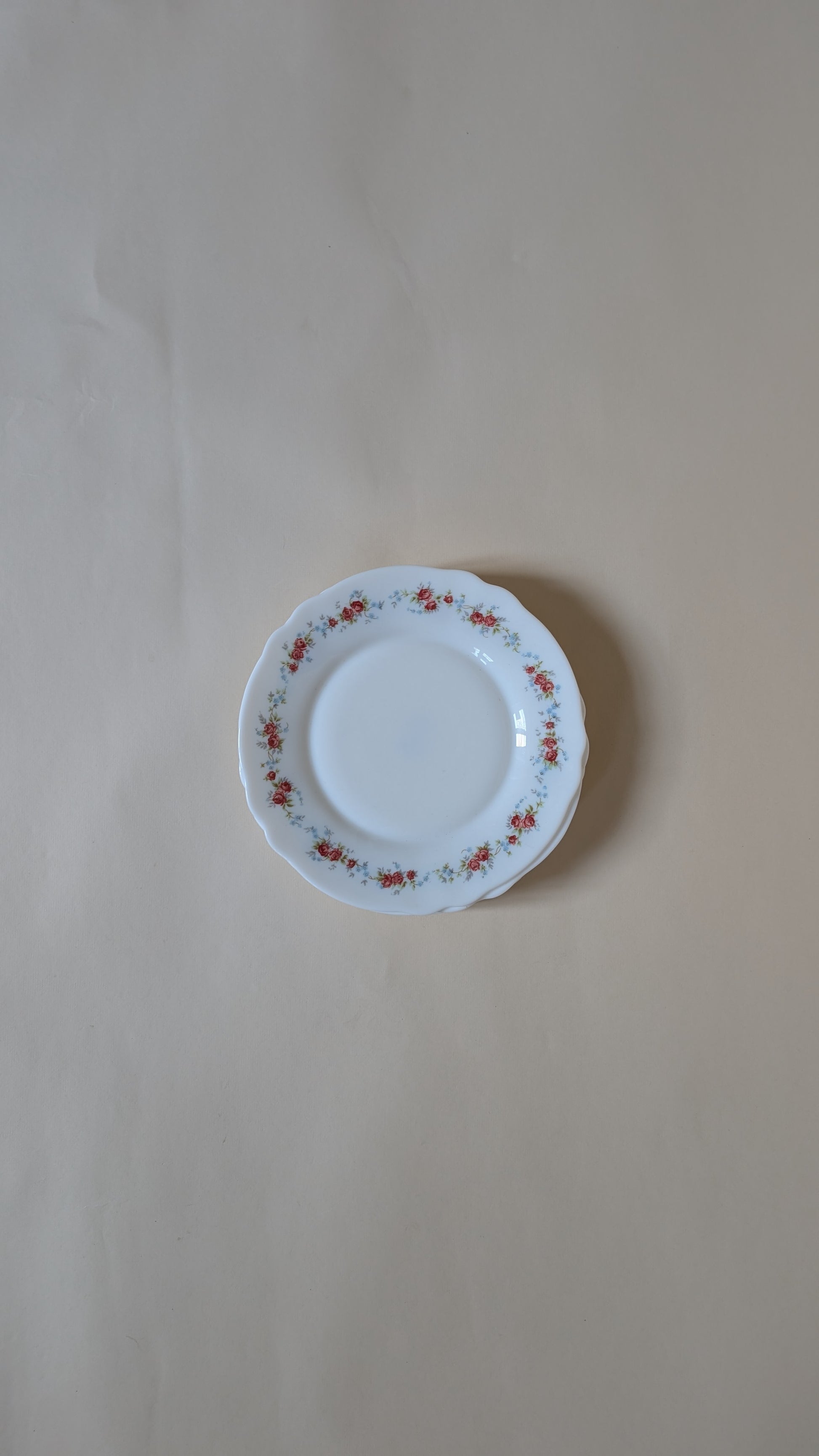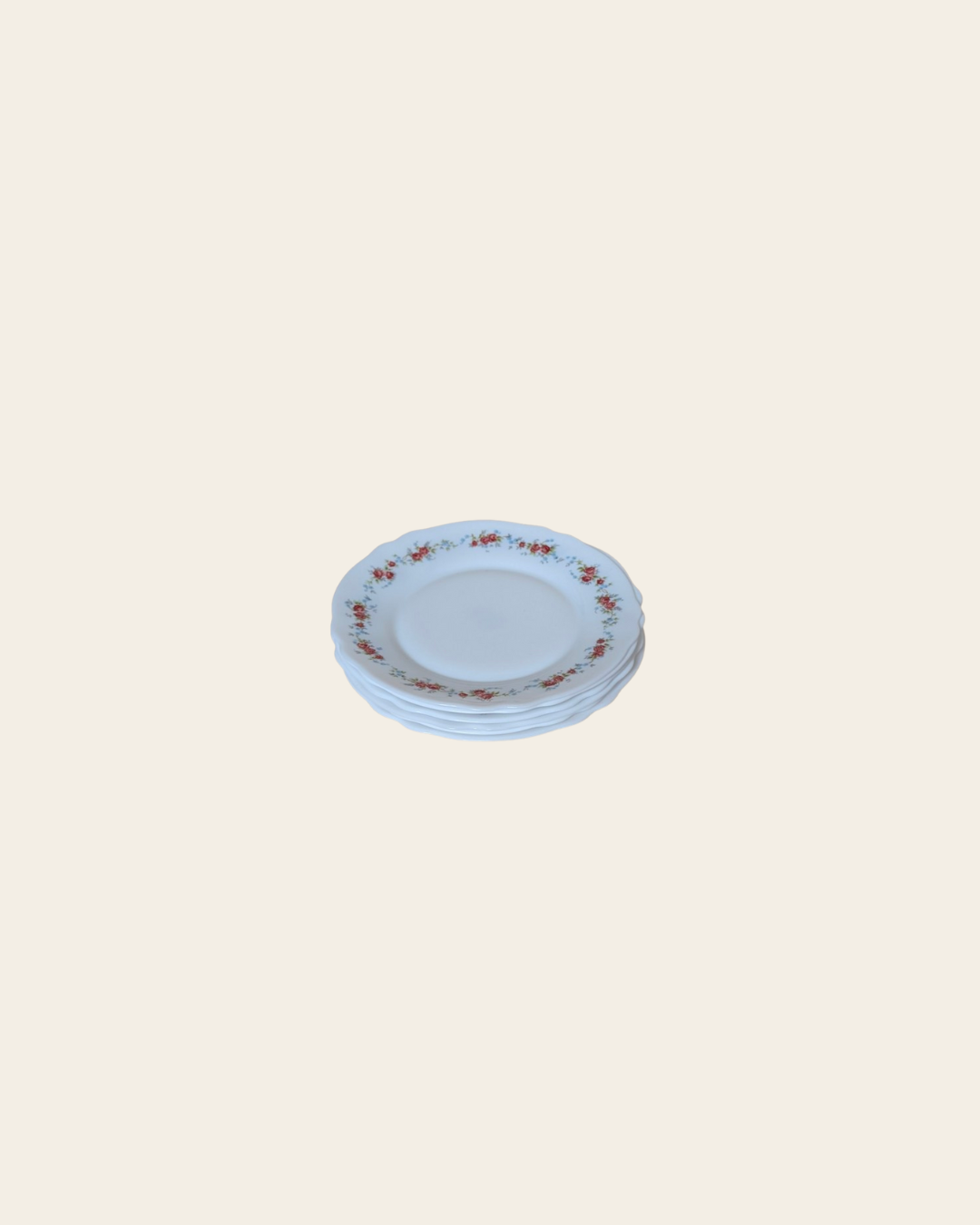 Ce lot de six assiettes à dessert de la marque Arcopal est fabriqué en verre opale très résistant. Elles ont un bord festonné et sont décorées d'un charmant motif de petites roses rouges.