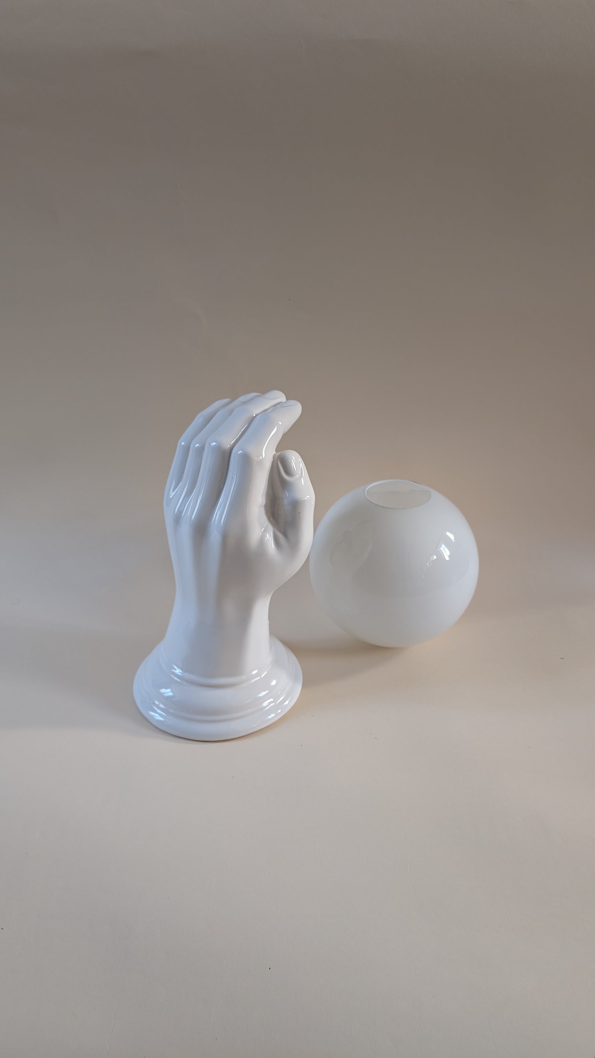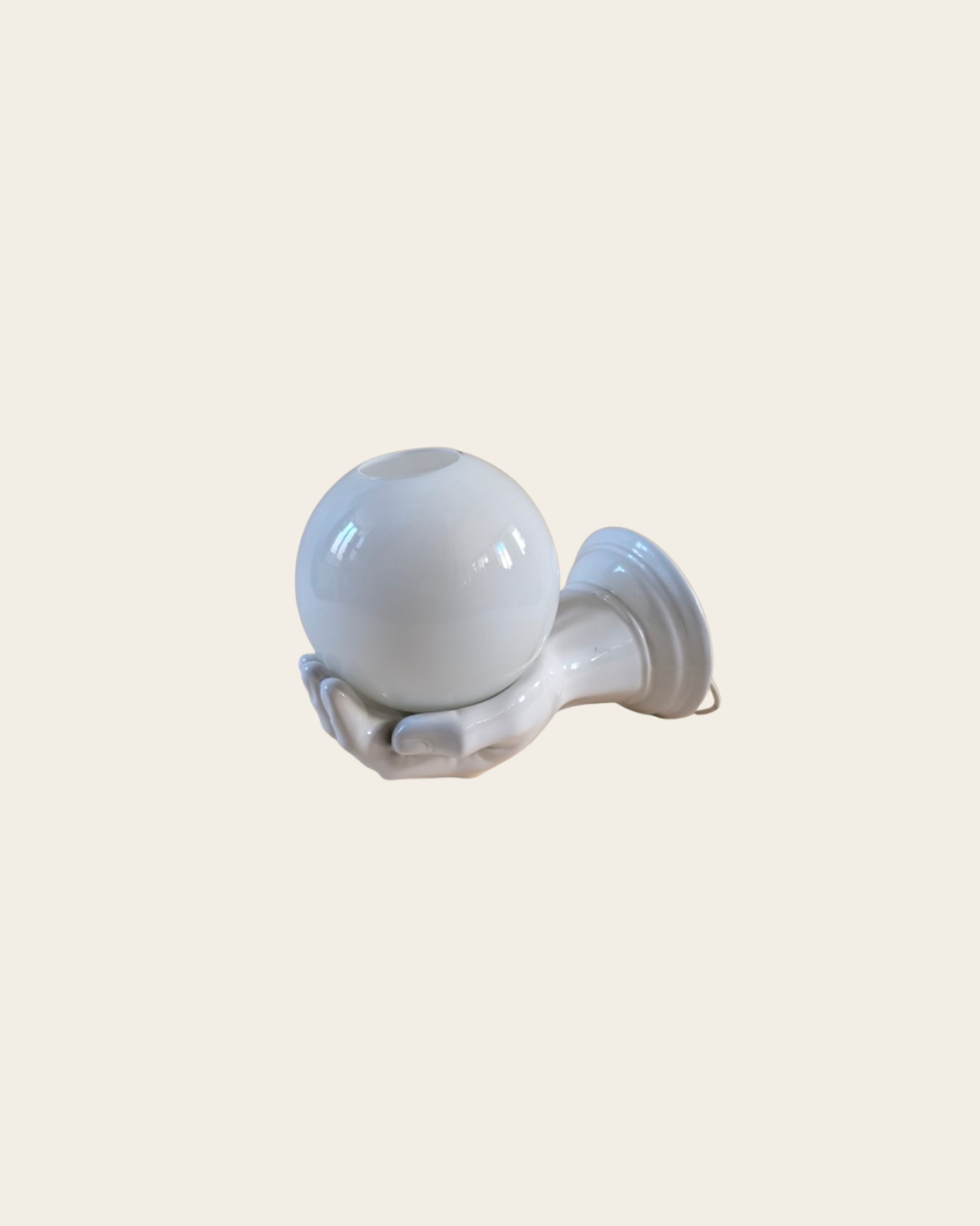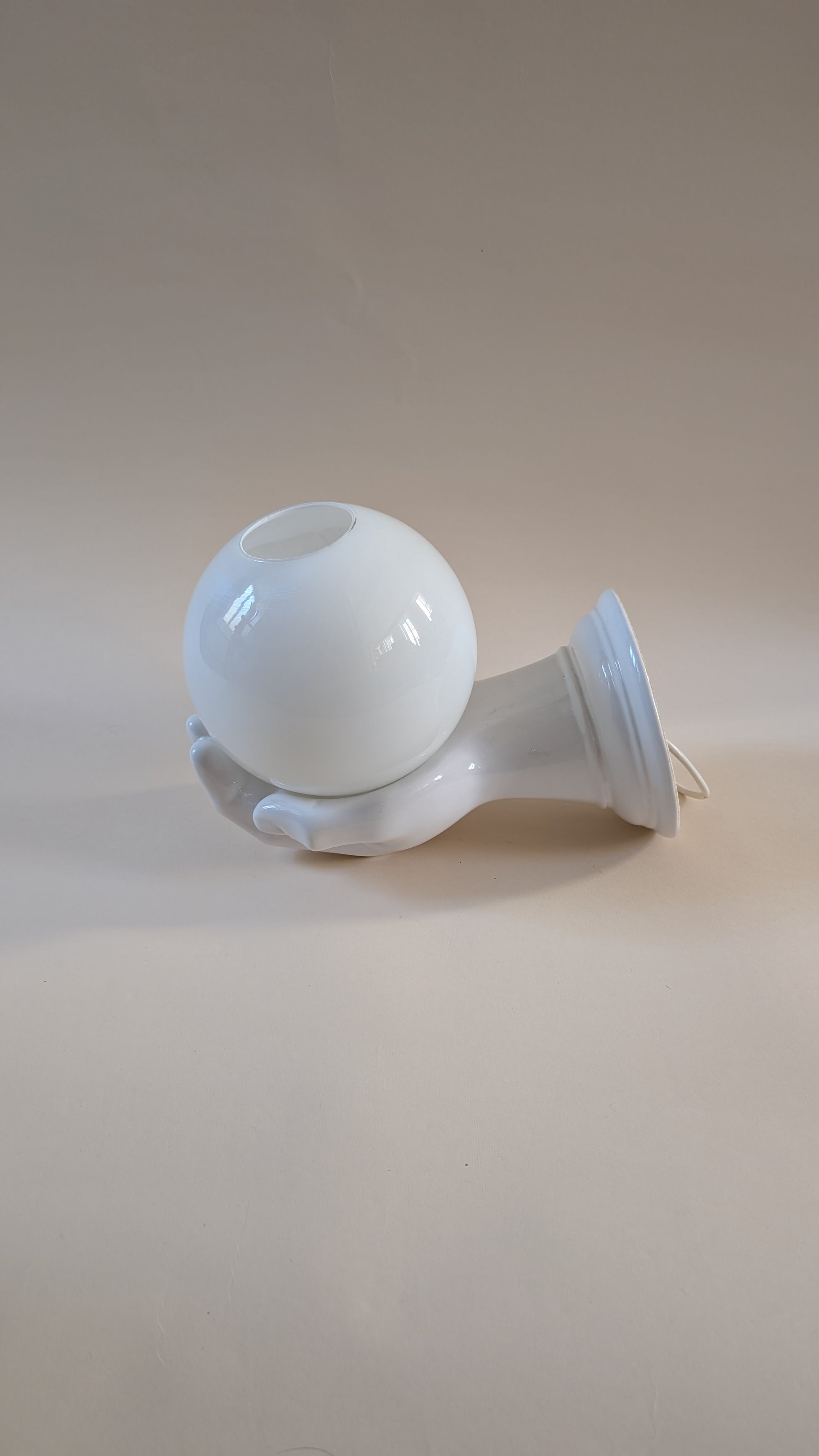 La base en céramique blanche est en parfait état, sans aucun éclat ni fissure, tandis que le globe en verre conserve toute sa transparence et sa brillance d’origine.