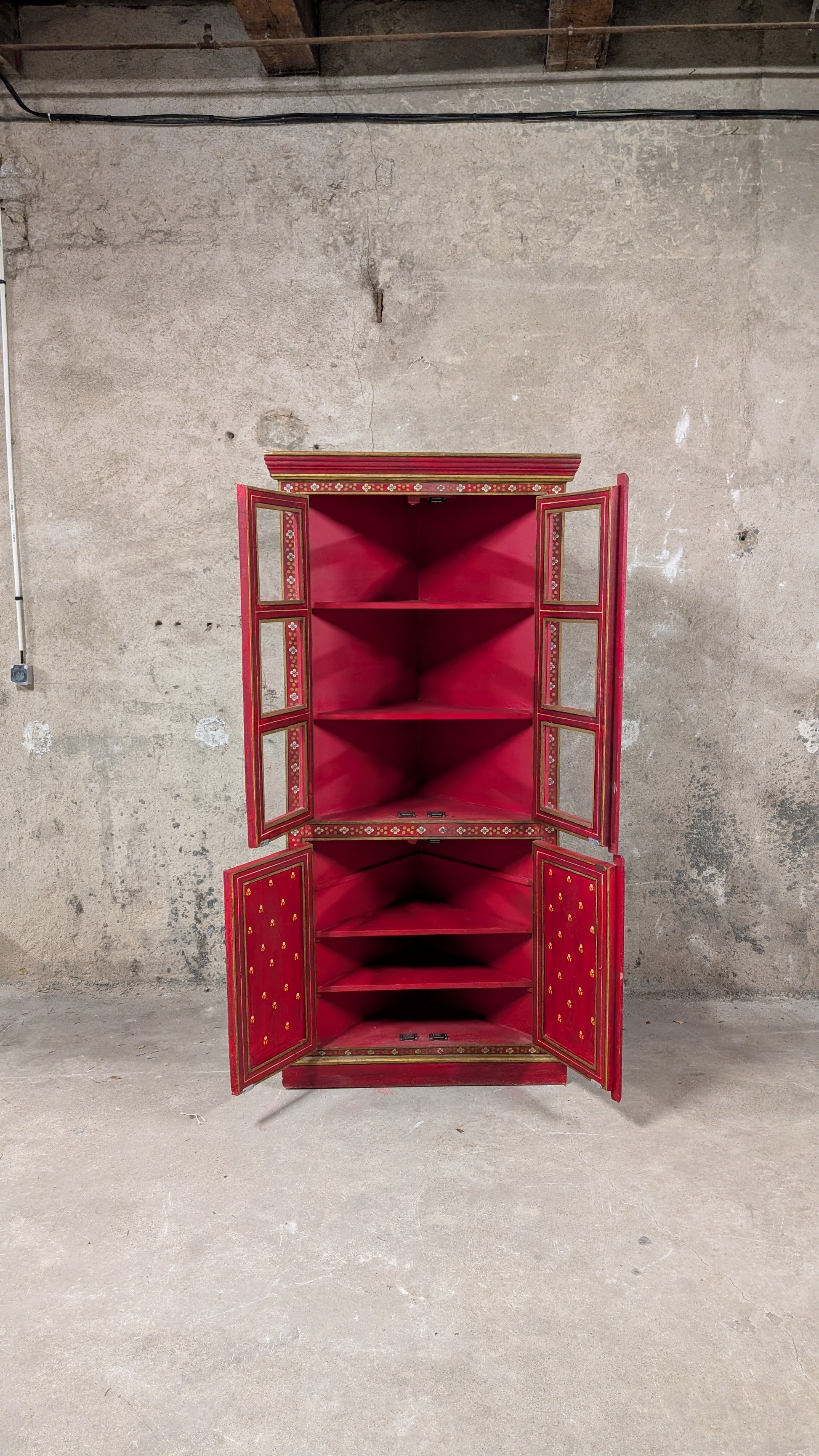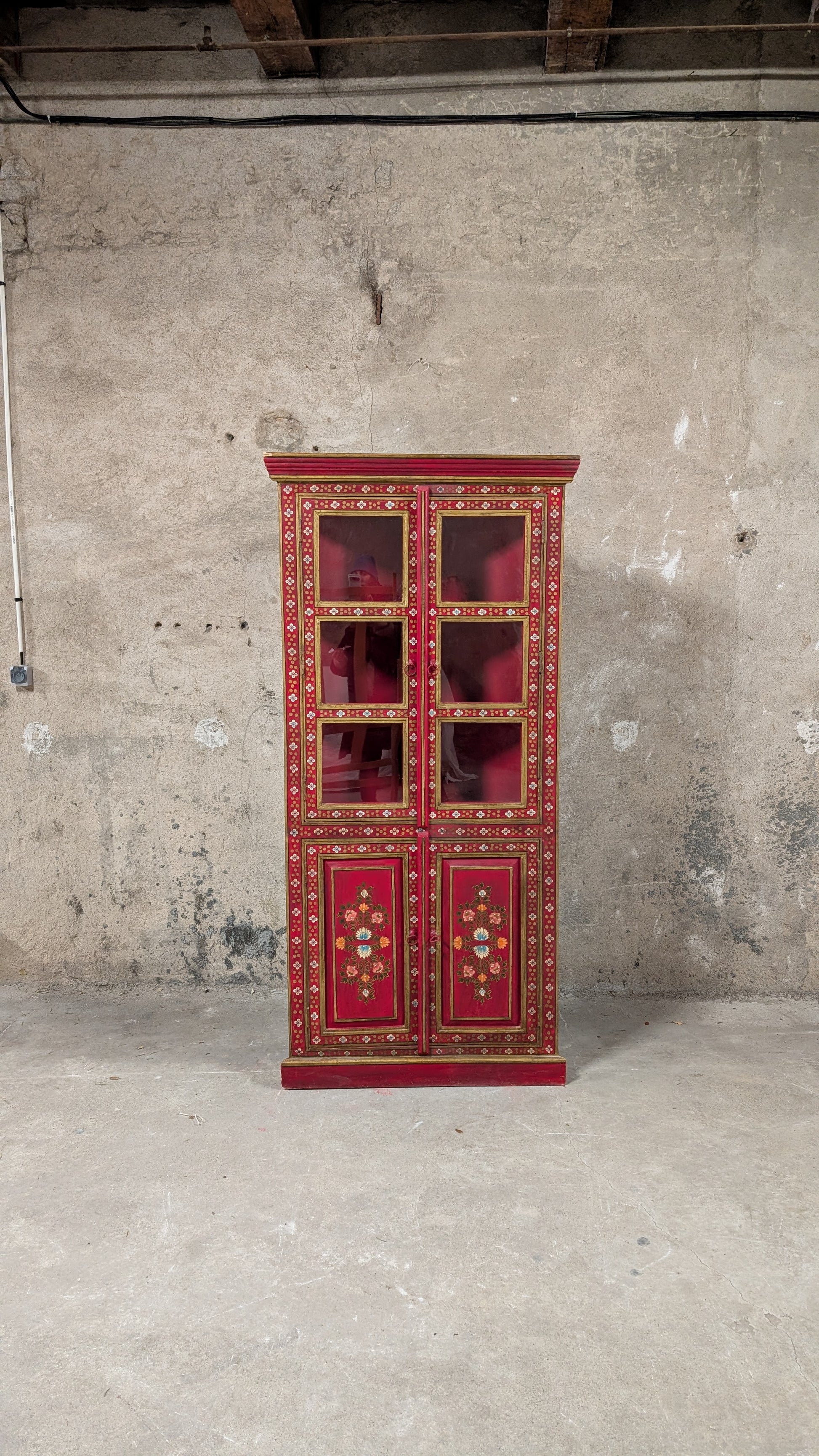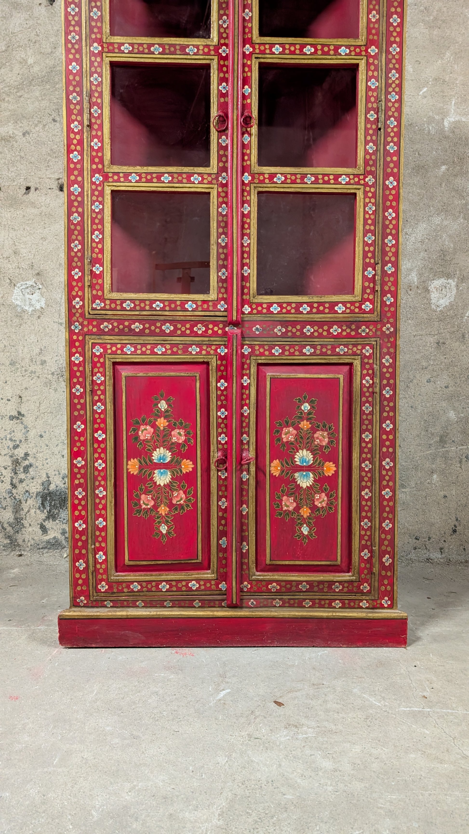 Bibliothèque vitrine d'inspiration indienne, en bois peint d'un rouge profond et chaleureux. Ce meuble de caractère se distingue par ses détails raffinés : des frises de fleurs blanches délicatement peintes à la main encadrent les vitres, tandis que les panneaux inférieurs sont ornés de bouquets floraux colorés. Un véritable objet d'artisanat qui apporte une touche d'évasion et d'élégance bohème à votre intérieur.