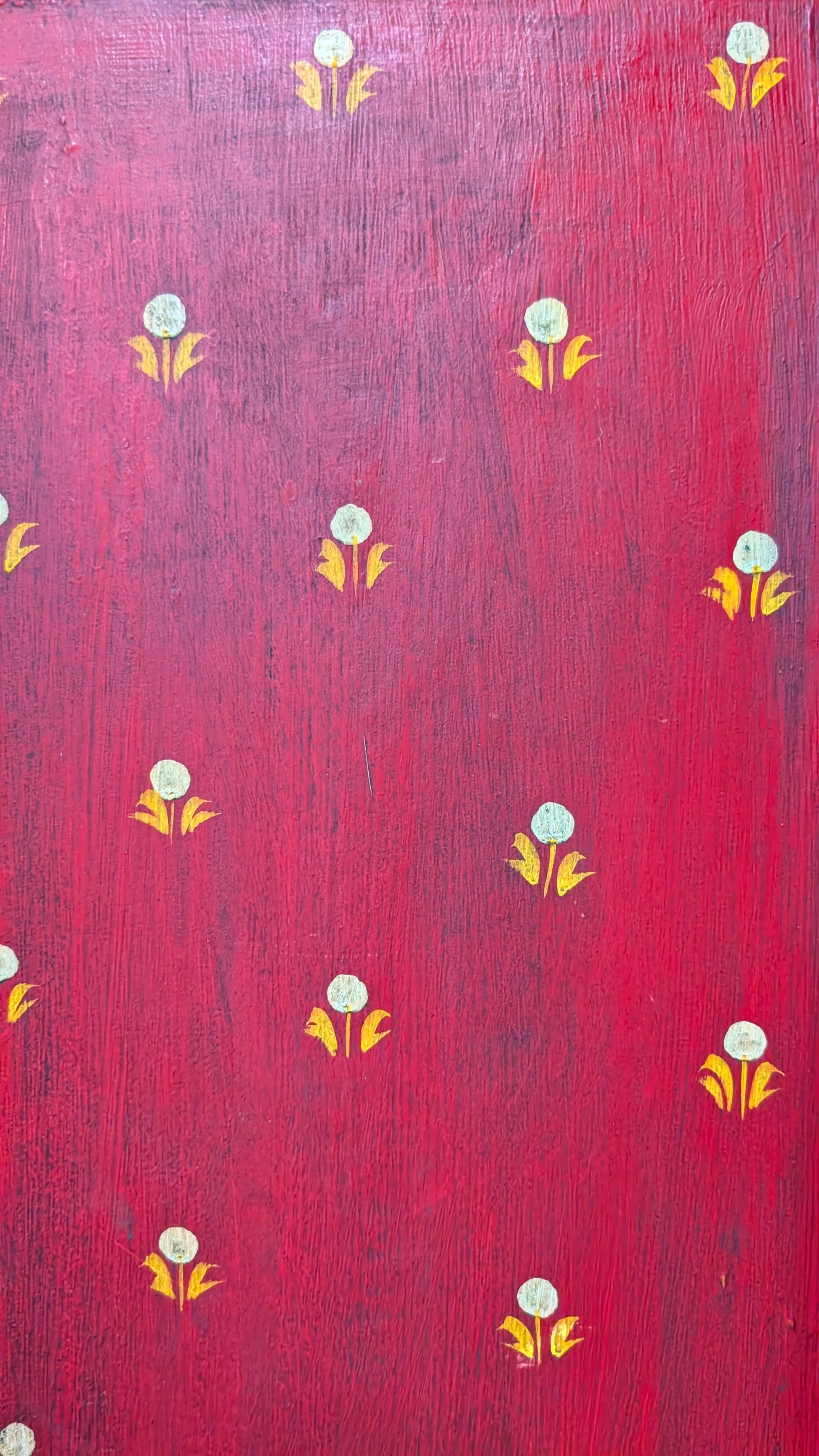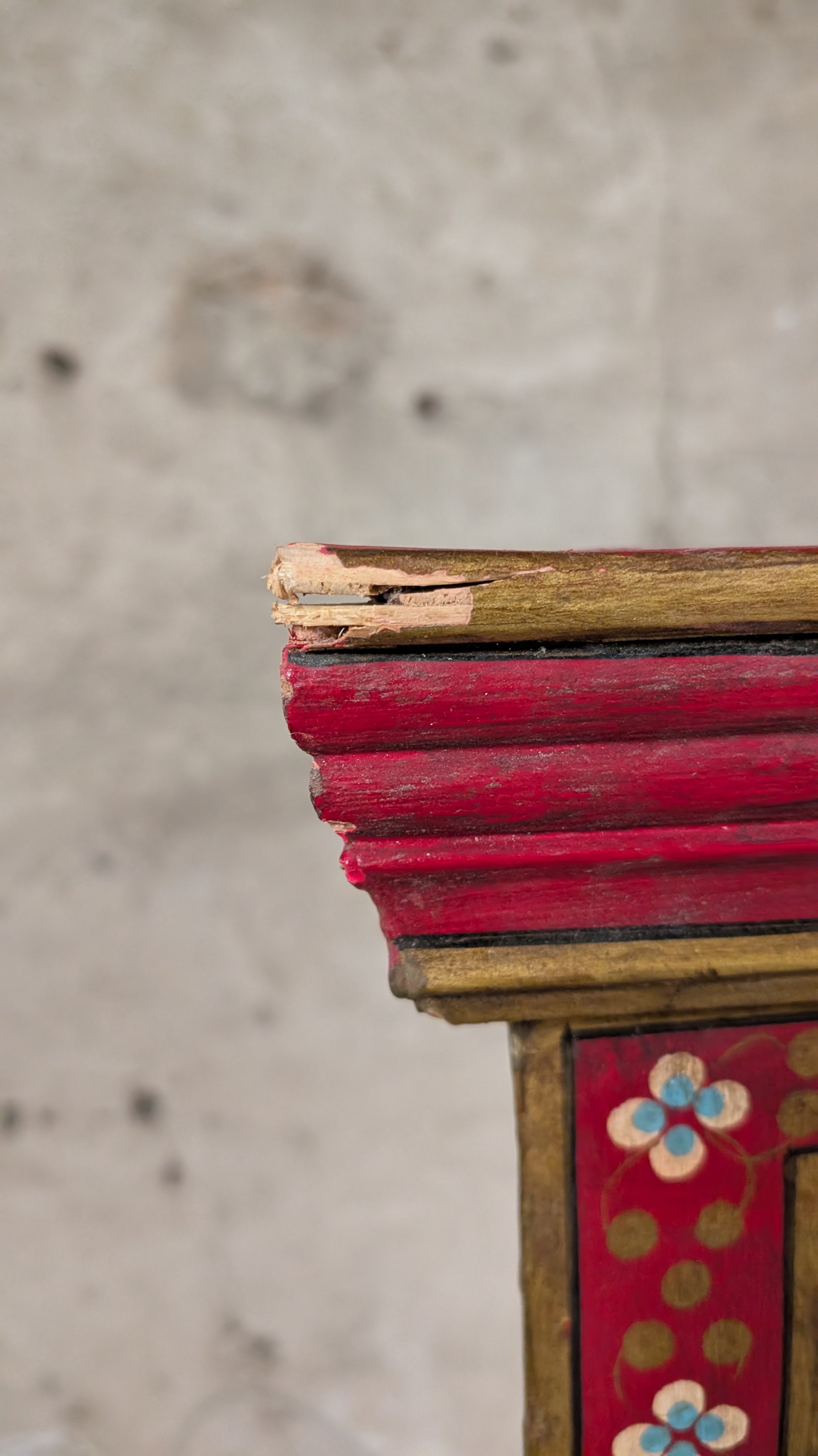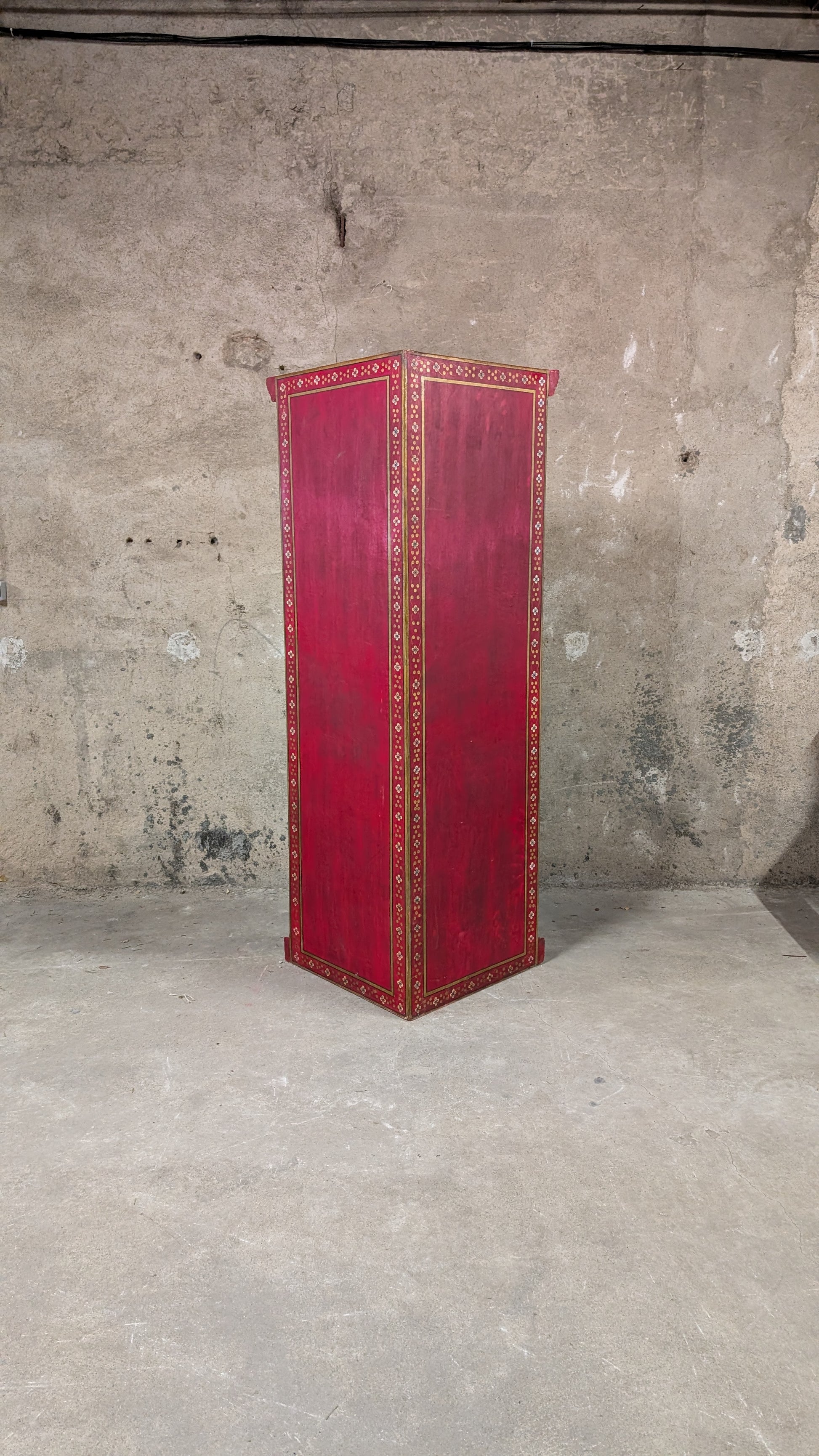 Bibliothèque vitrine d'inspiration indienne, en bois peint d'un rouge profond et chaleureux. Ce meuble de caractère se distingue par ses détails raffinés : des frises de fleurs blanches délicatement peintes à la main encadrent les vitres, tandis que les panneaux inférieurs sont ornés de bouquets floraux colorés. Un véritable objet d'artisanat qui apporte une touche d'évasion et d'élégance bohème à votre intérieur.