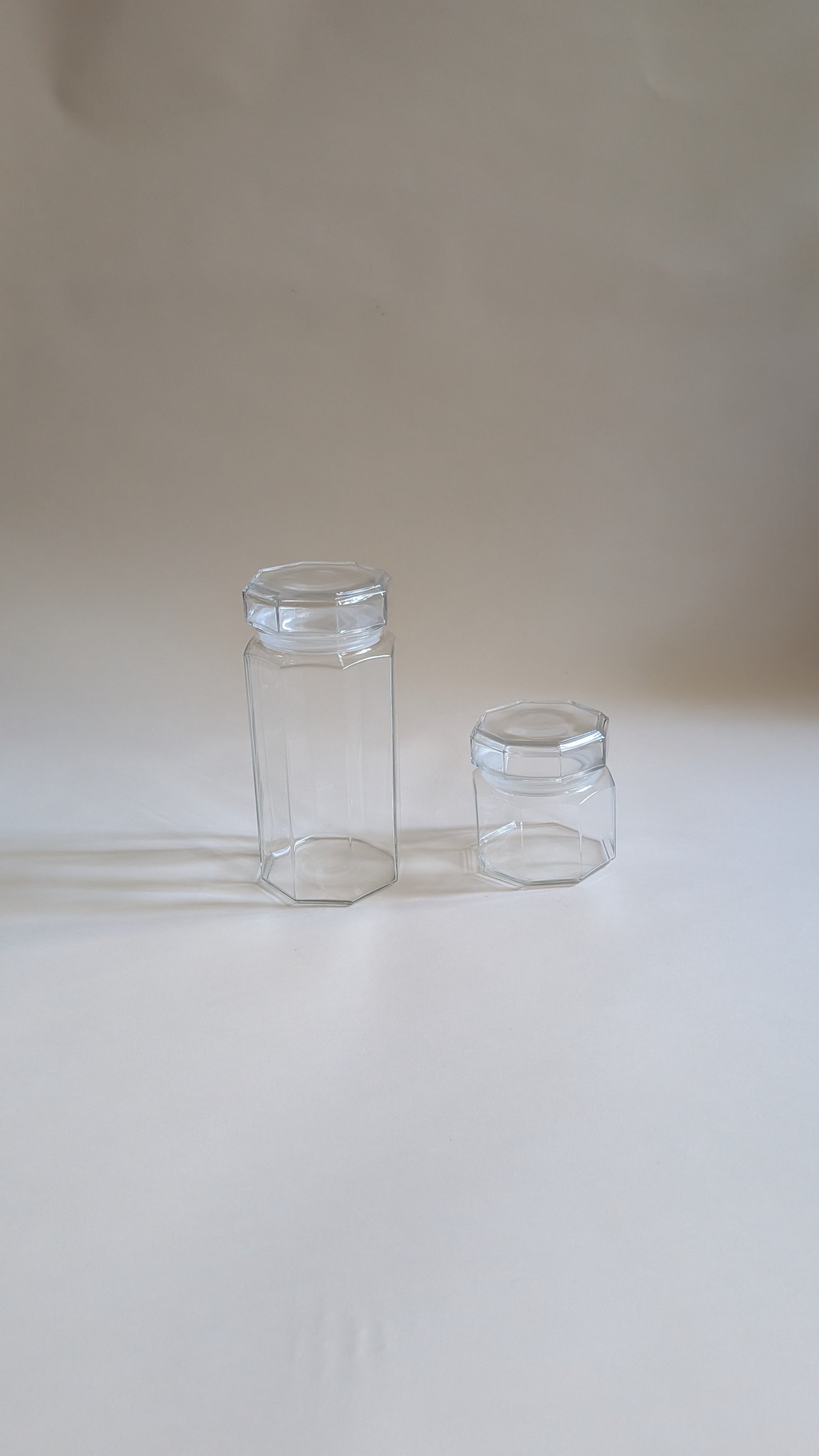 Boîtes de rangement en verre, de forme octogonale, parfaites pour organiser vos ingrédients. Leur transparence permet de voir le contenu d’un coup d’œil, tout en apportant une touche raffinée à votre plan de travail ou à vos étagères. Idéales pour le thé, le café, les épices, les biscuits ou autres petites gourmandises.