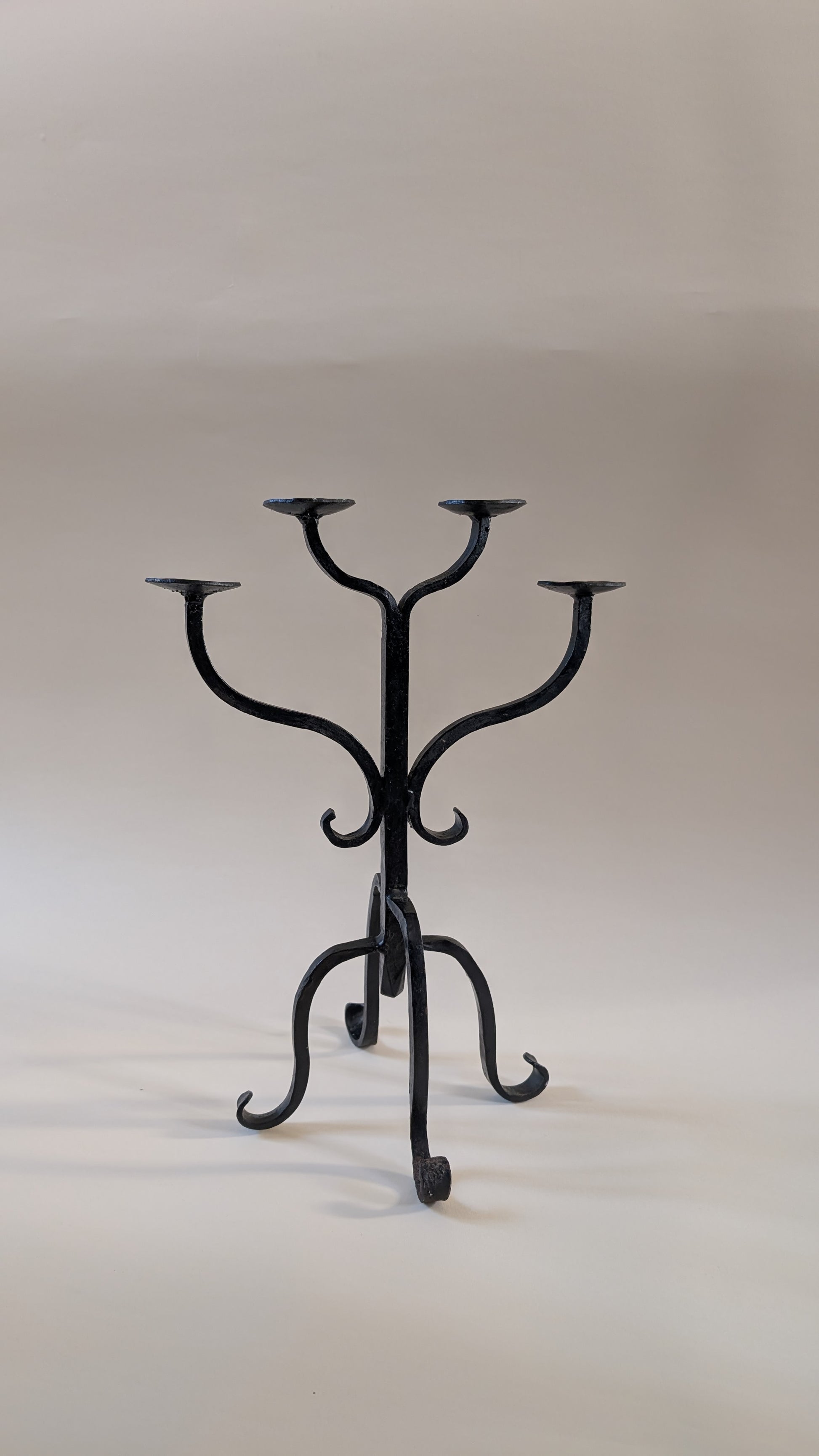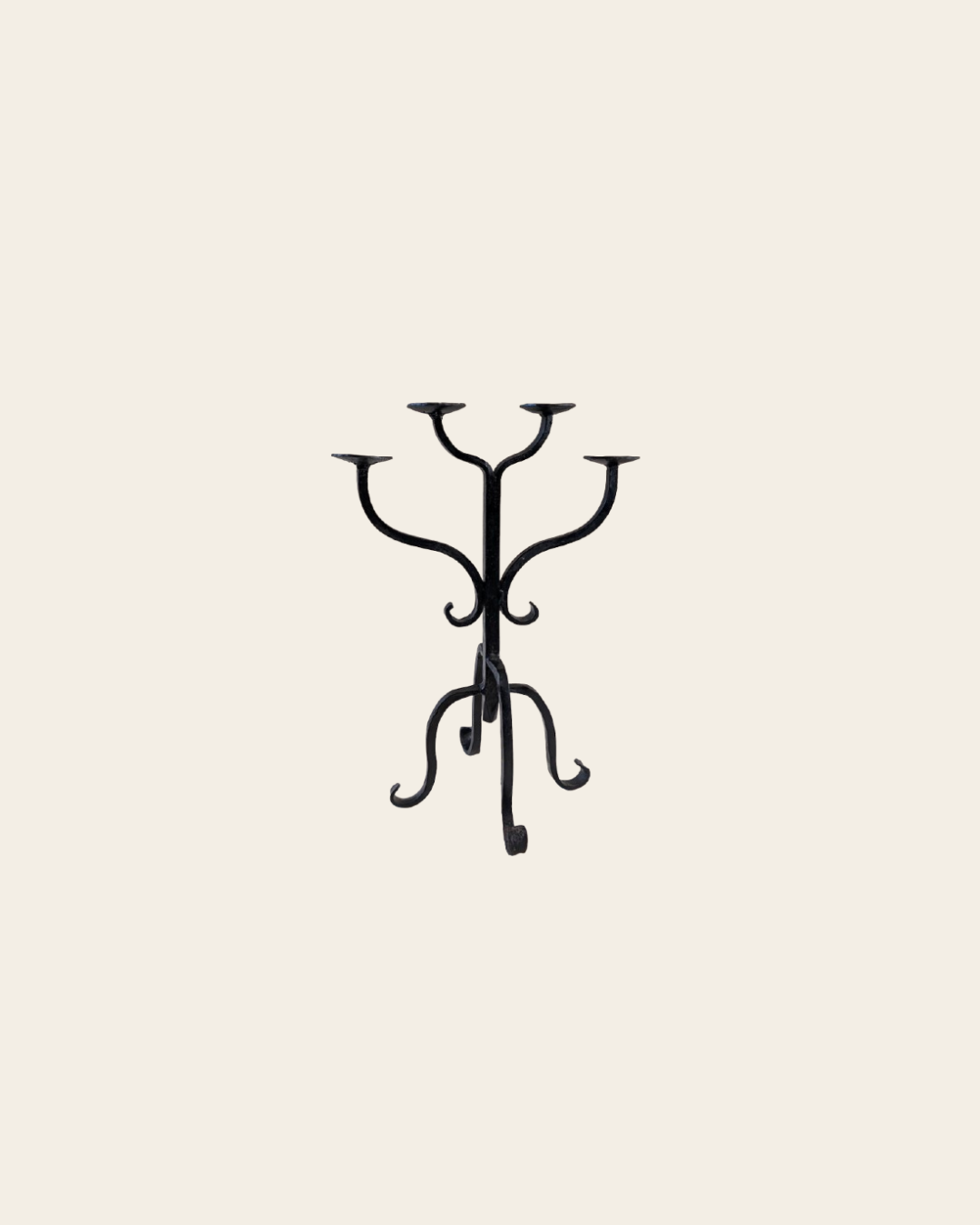 Chandelier en fer forgé artisanal, il dispose de quatre bras courbés pouvant accueillir autant de bougies, pour créer une ambiance chaleureuse et authentique.