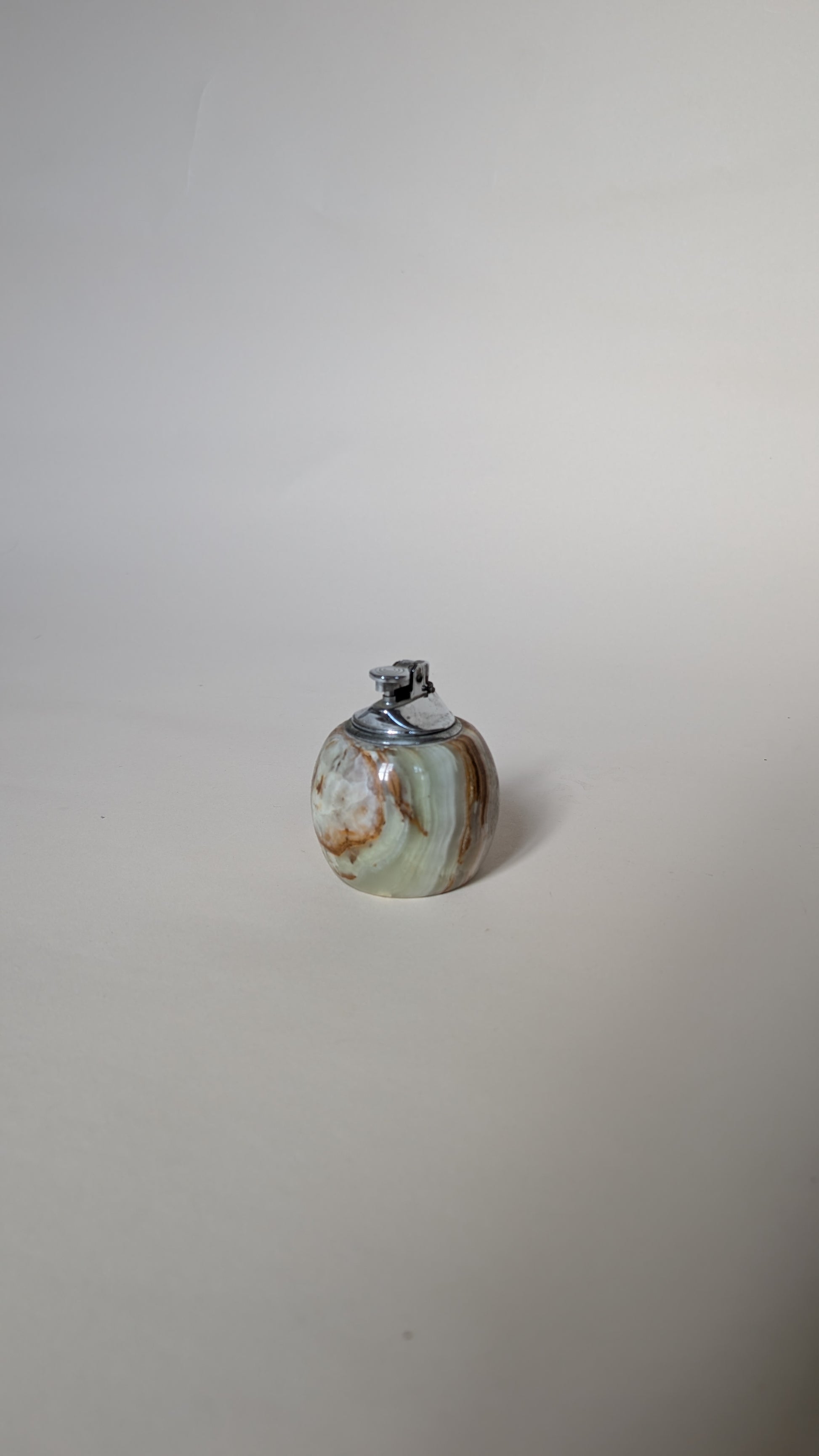 briquet de table décoratif est fabriqué en onyx véritable, une pierre caractérisée par ses riches veines marbrées (vert, brun, crème). De forme ronde et surmonté d'un mécanisme métallique, il est à la fois lourd et élégant. Parfait pour une décoration vintage ou pour collection.