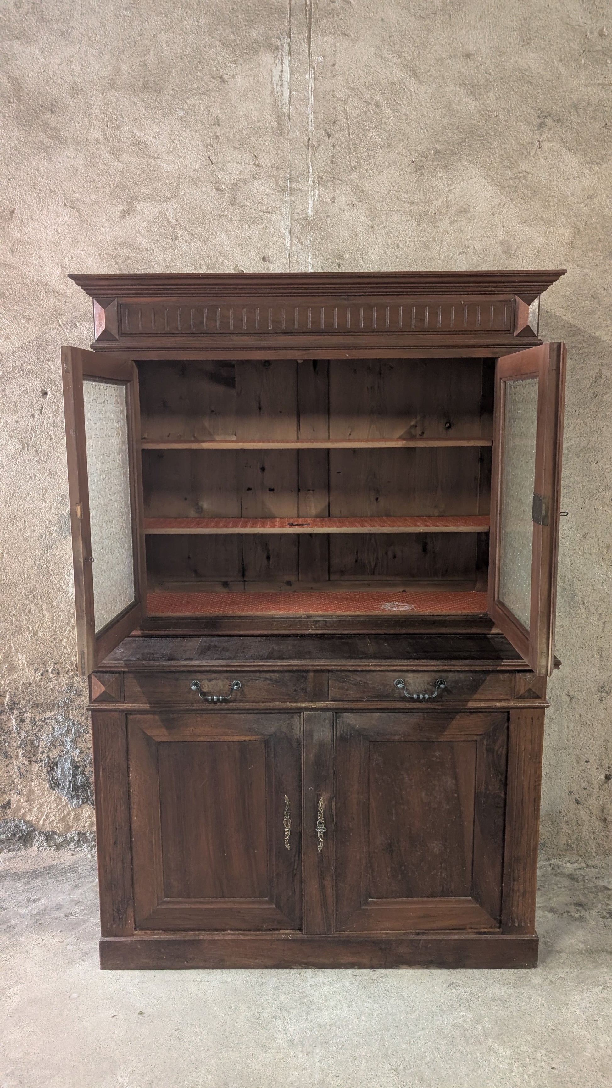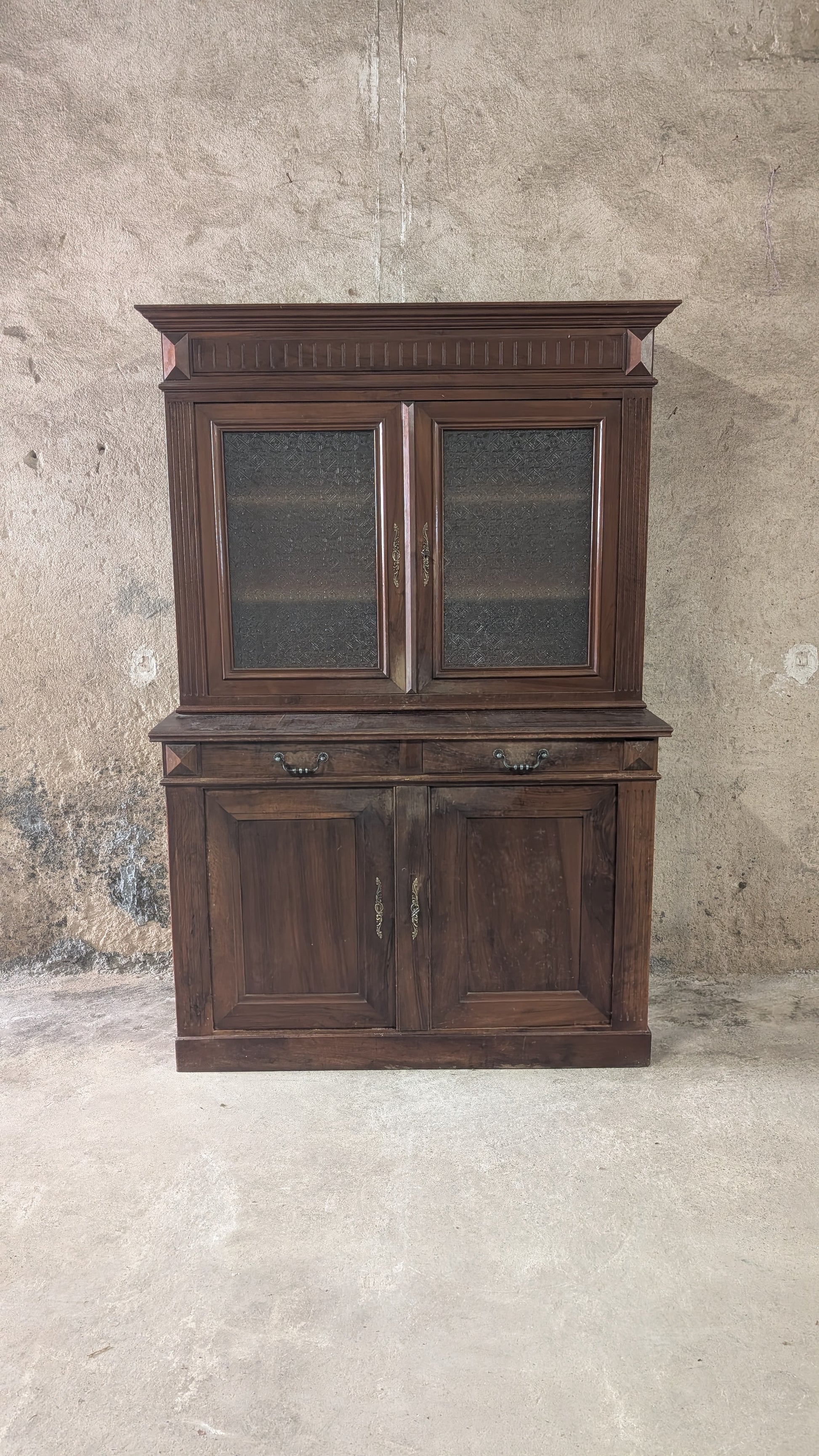 Ce meuble robuste et en très bon état général se compose de deux parties distinctes, alliant espace de rangement et mise en valeur de vos objets.