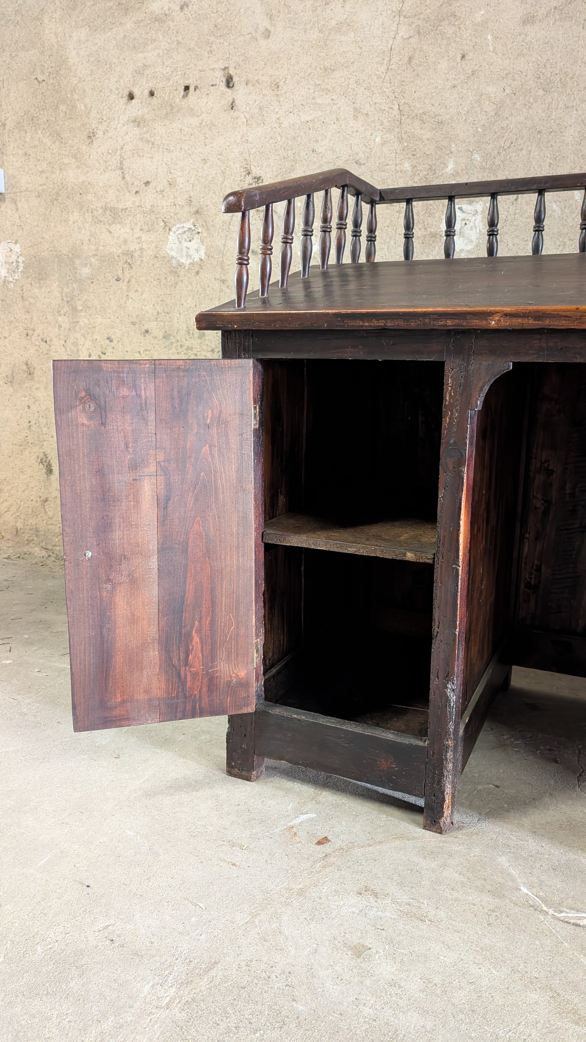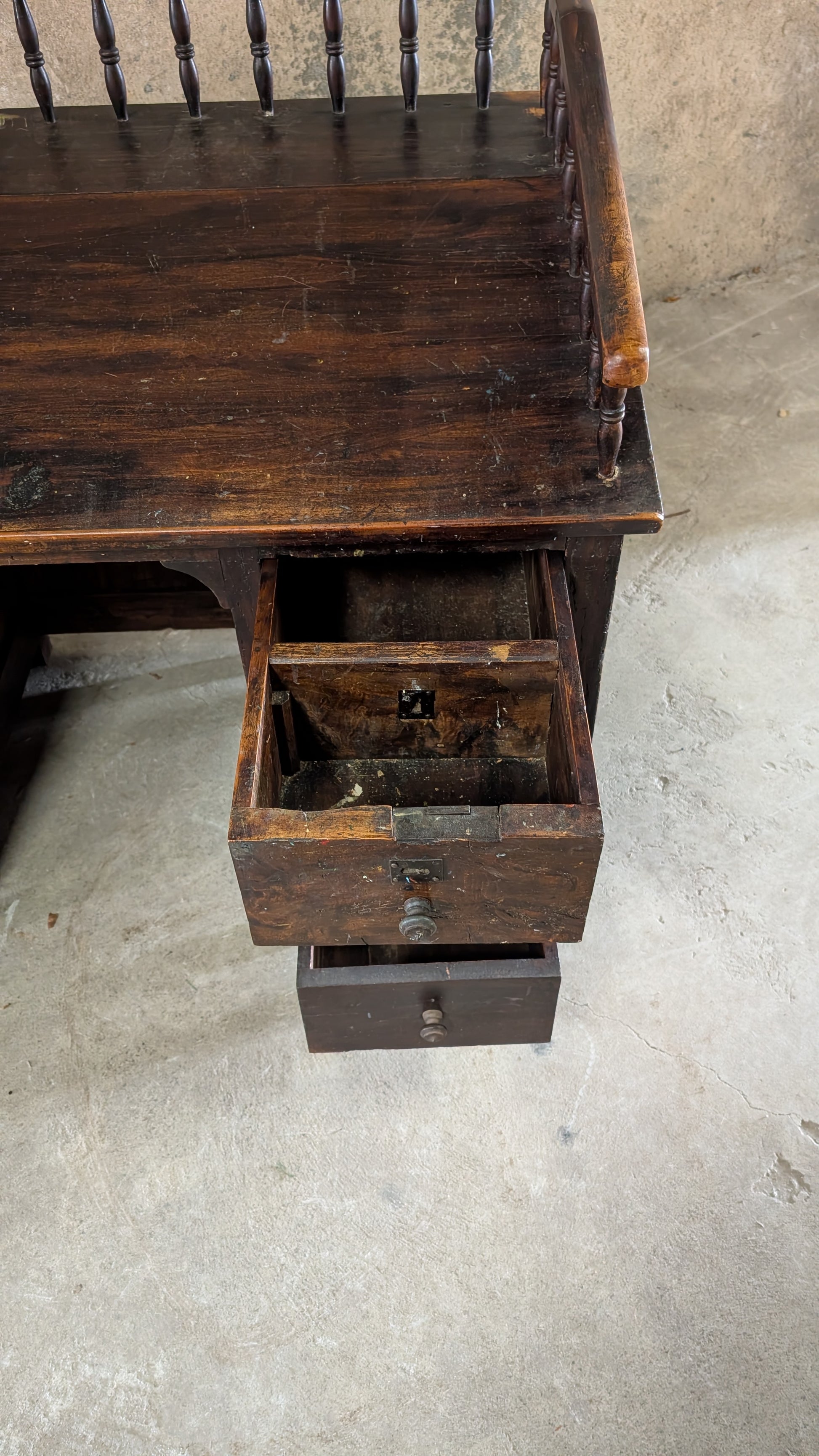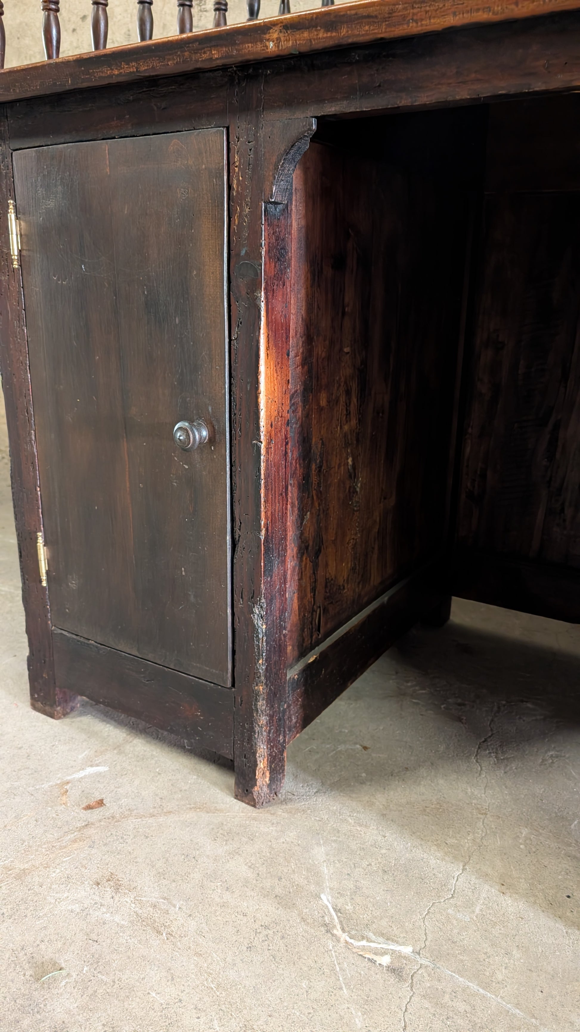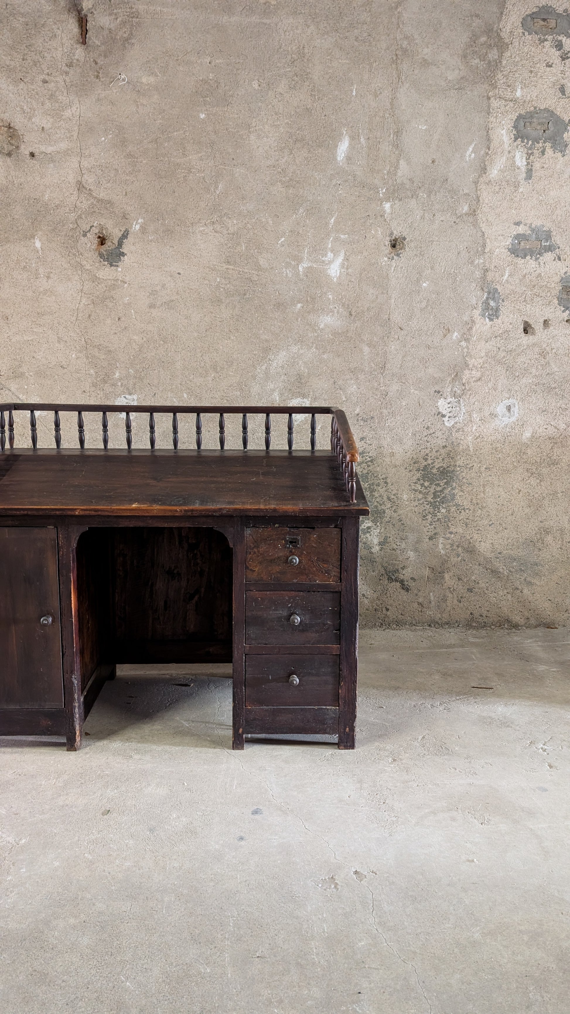 Sa structure est classique : un espace de travail central pour les jambes, avec un caisson à porte d'un côté et un caisson à tiroirs de l'autre. Le plateau est rehaussé d'une élégante rambarde à balustres qui entoure les trois côtés, offrant un style distinctif. C'est une pièce de mobilier idéale pour un bureau, une bibliothèque ou un salon.