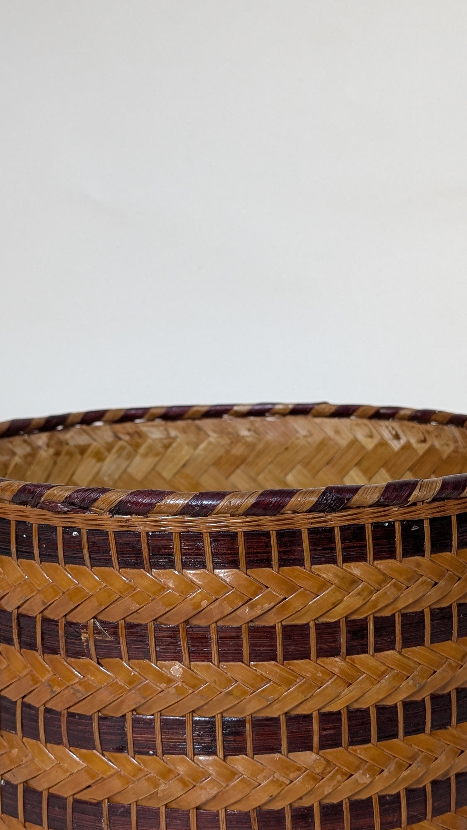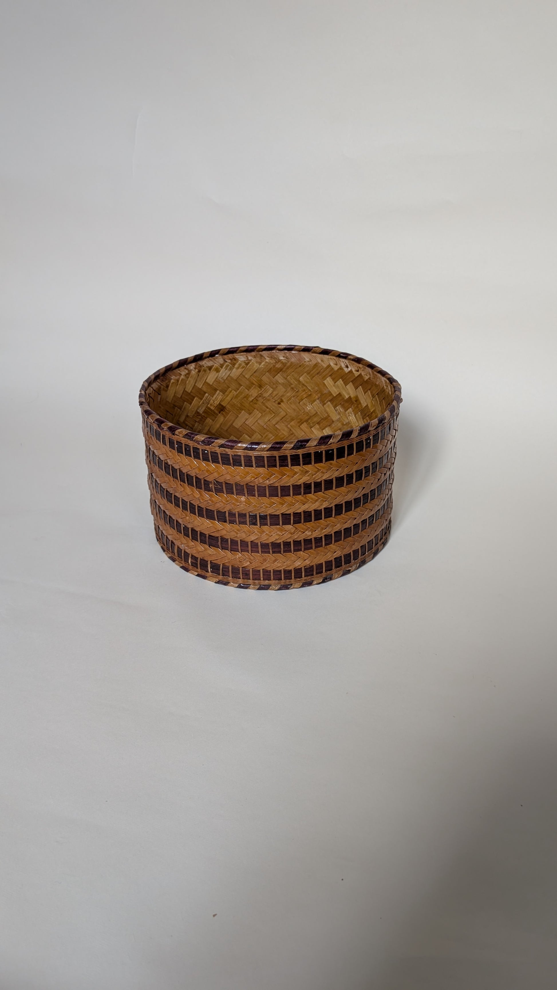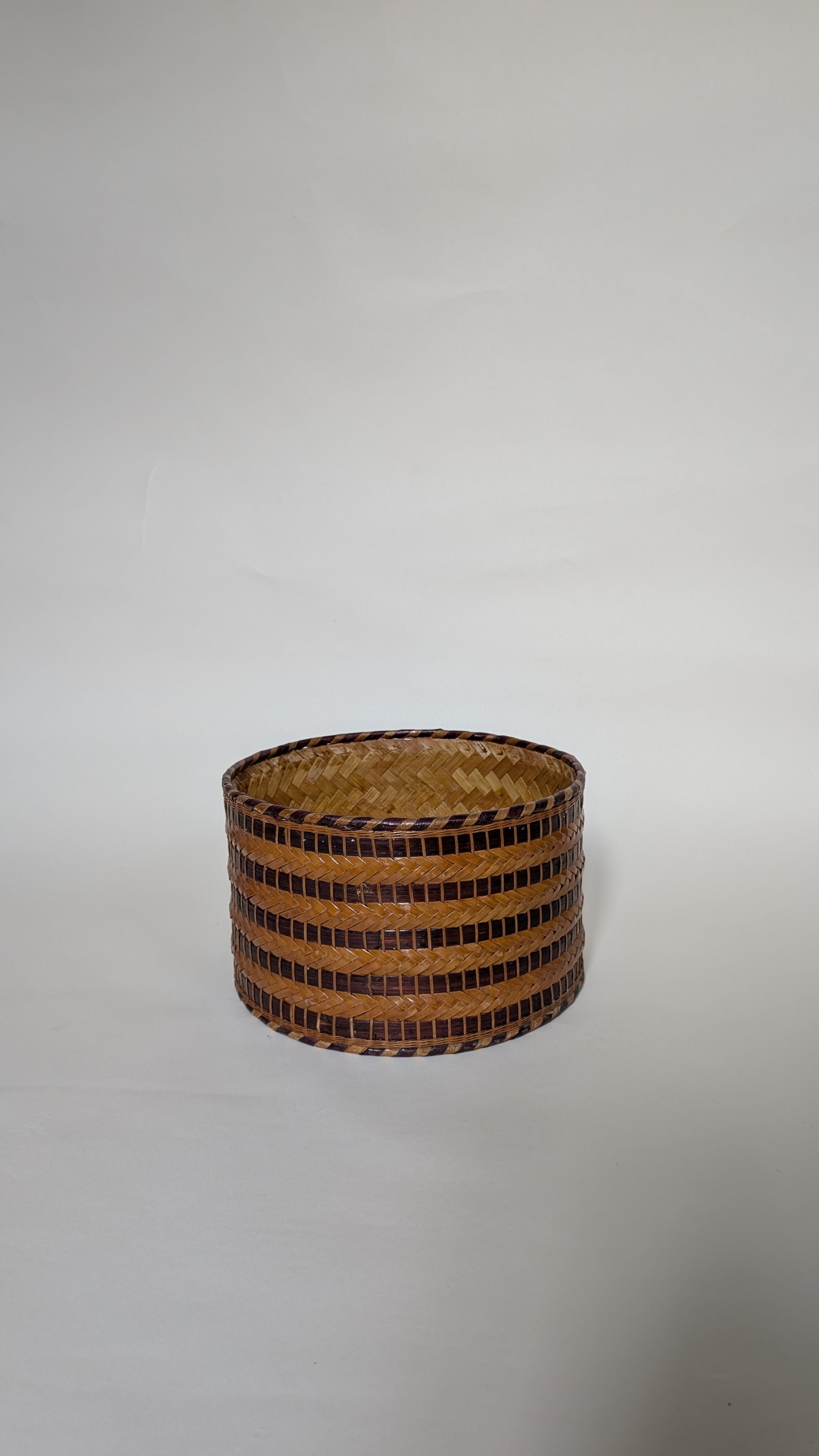 Cache-pot tressé présente une forme cylindrique et un motif graphique bicolore (bandes claires et foncées) créé par un tressage artisanal. Il est idéal pour les plantes ou le rangement. Il mesure 18 cm de hauteur et 29 cm de diamètre.