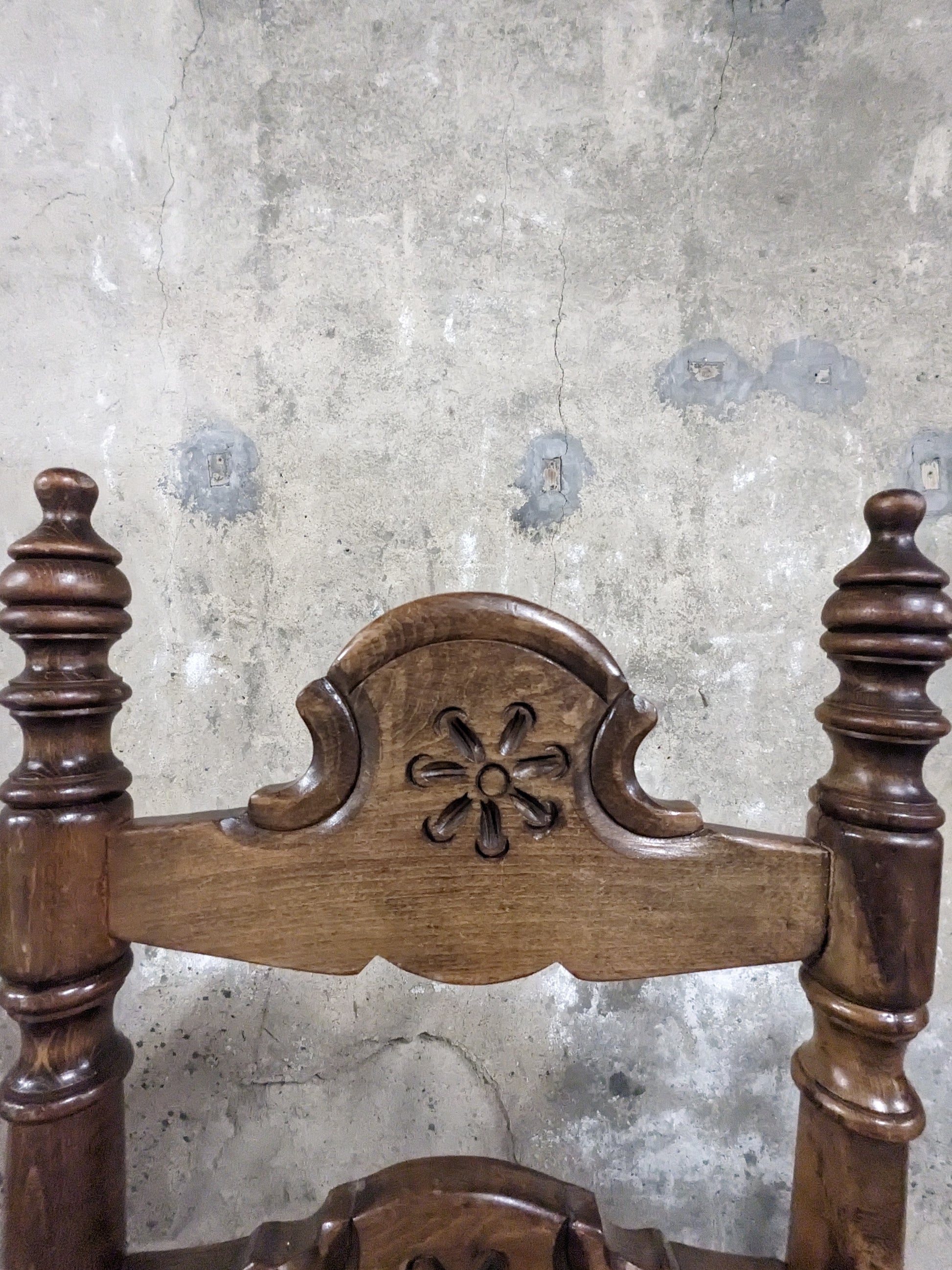 Ensemble de 4 chaises espagnoles en en bois et assise en paille. Les dossiers en forme d’échelle mis en valeur par des montants tournés ornés de fleurs. Les pieds avant, tournés et terminés par des sphères, sont solidement reliés par un châssis sculpté d'une fleur au centre. Des traverses latérales renforcent la structure pour assurer une excellente stabilité.