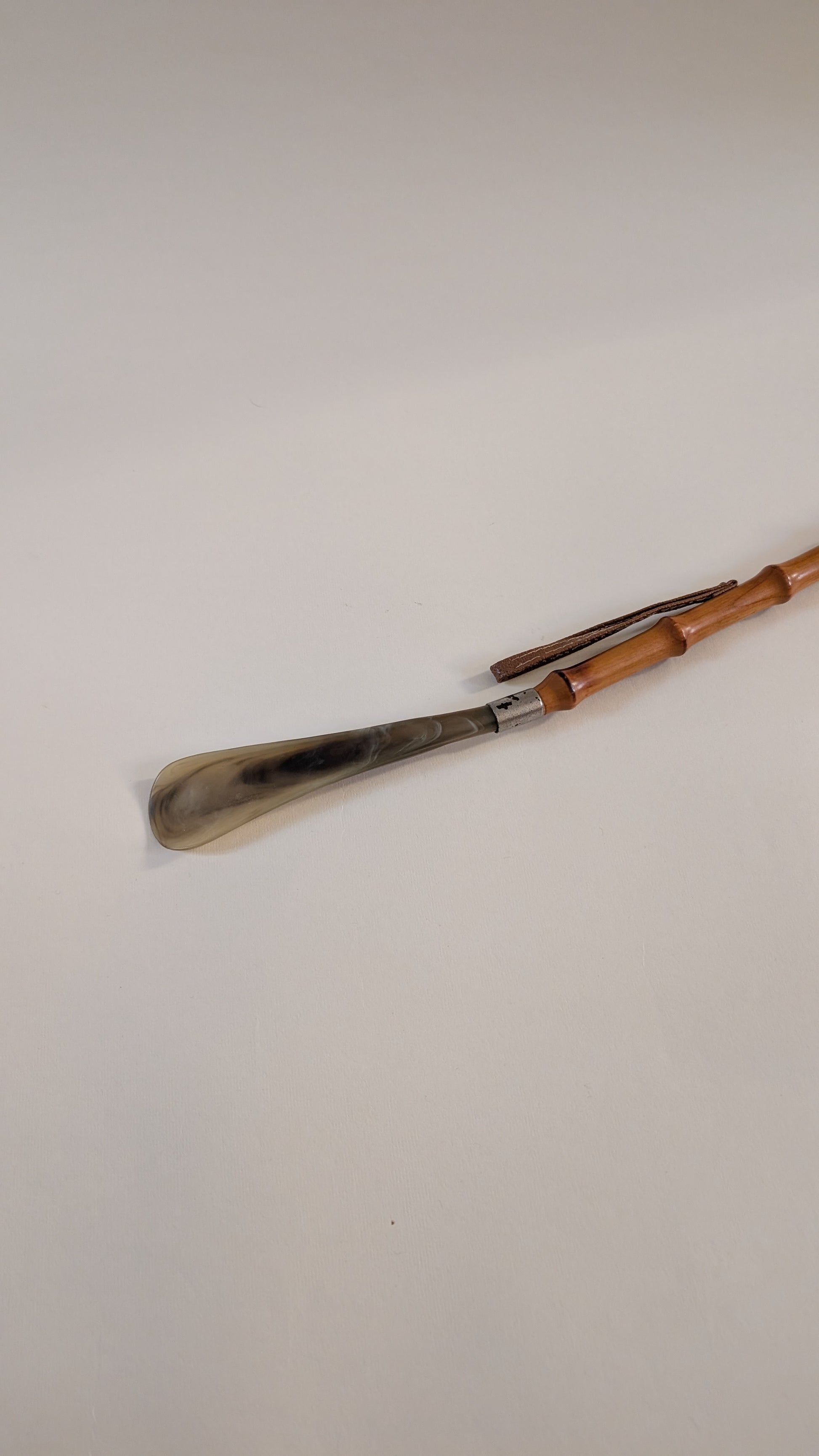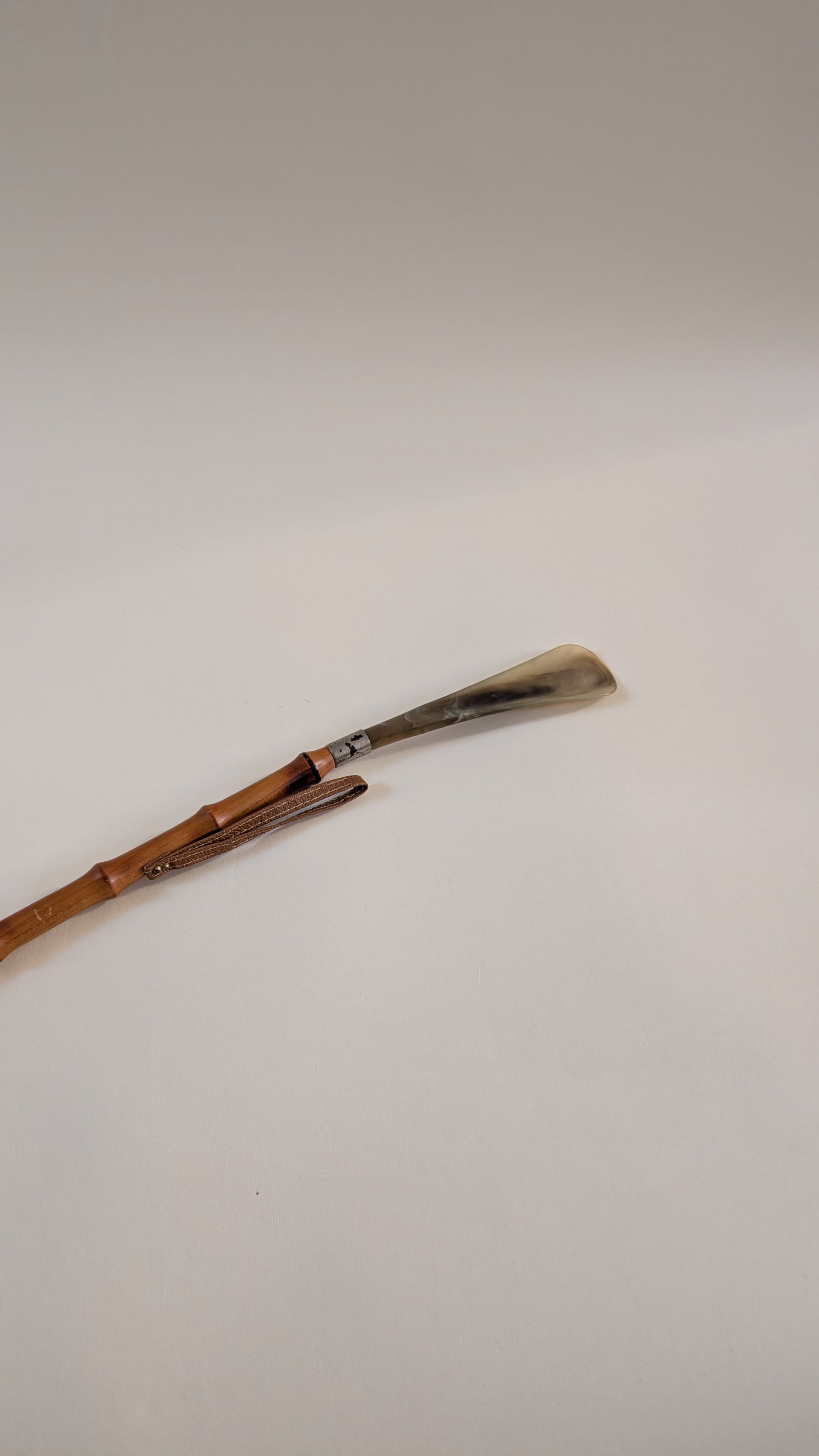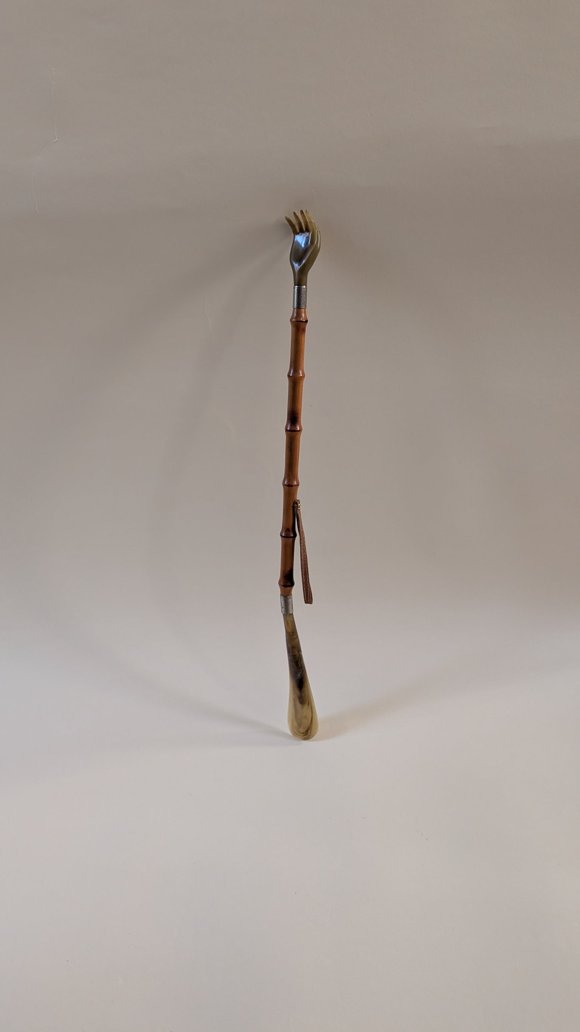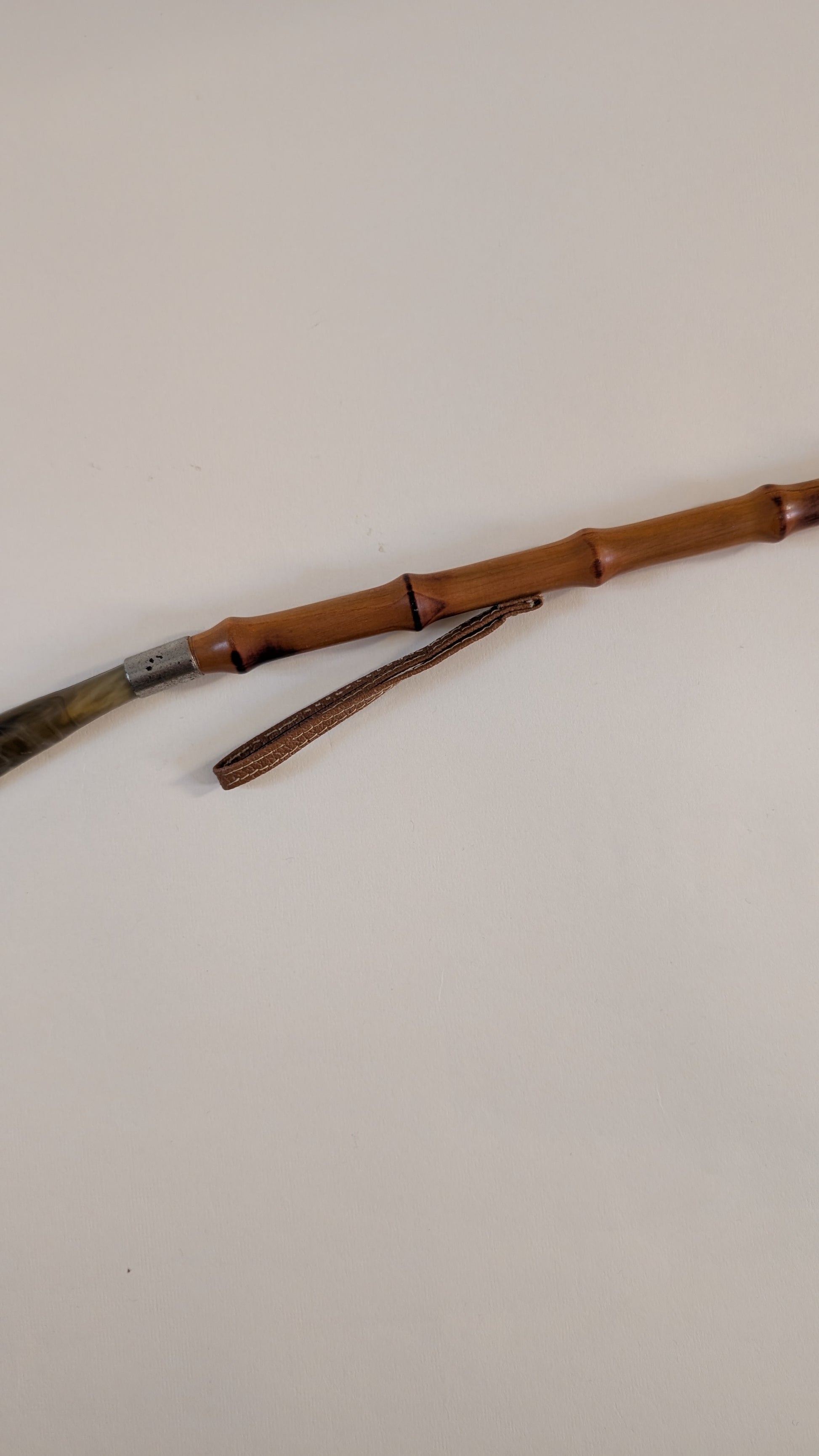 Fabriqué avec un manche en bambou naturel, il est à la fois léger, robuste et esthétique. Les extrémités sont réalisées en corne (ou matériau imitant la corne), un cordon en cuir permet de le suspendre facilement.