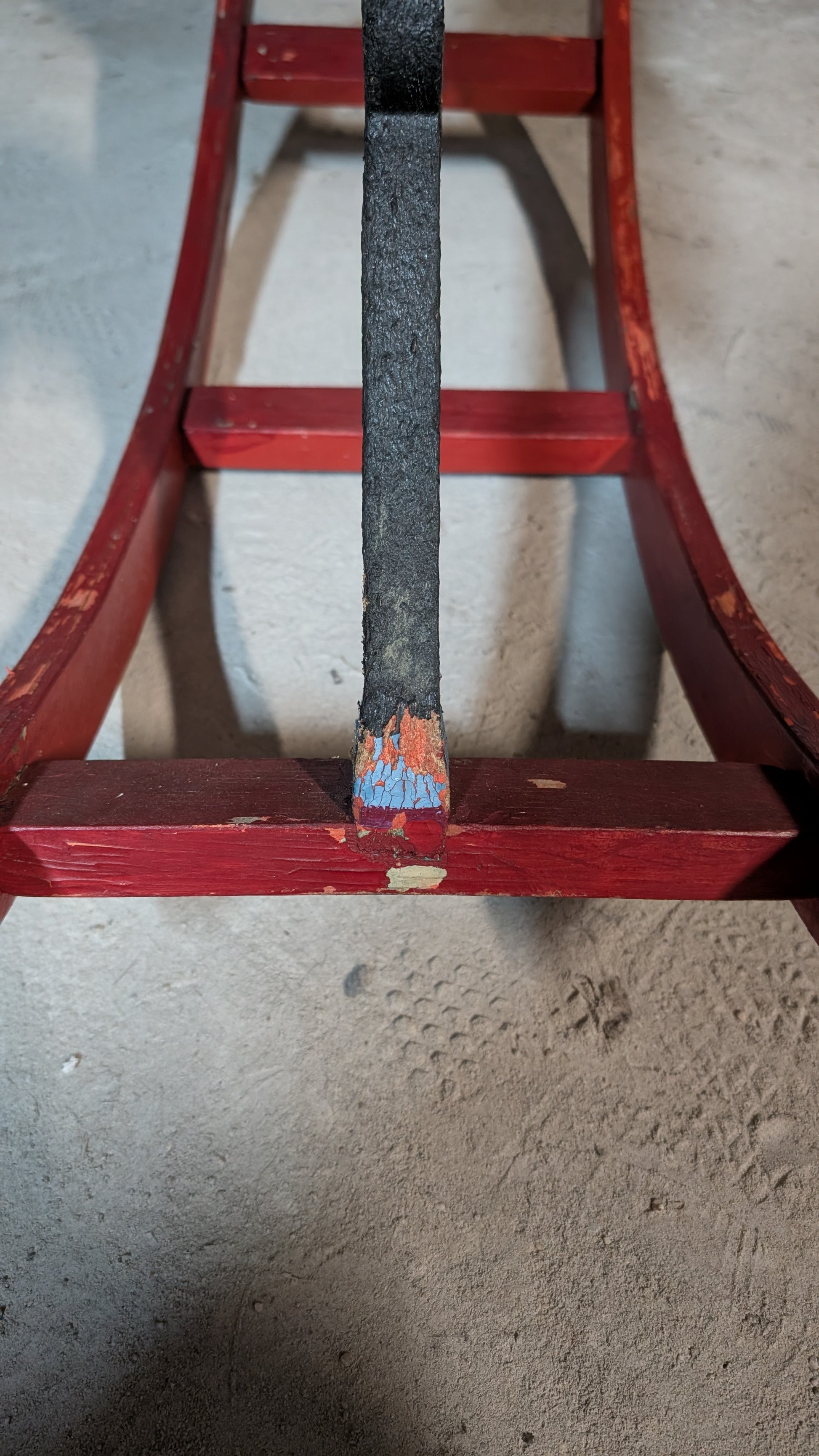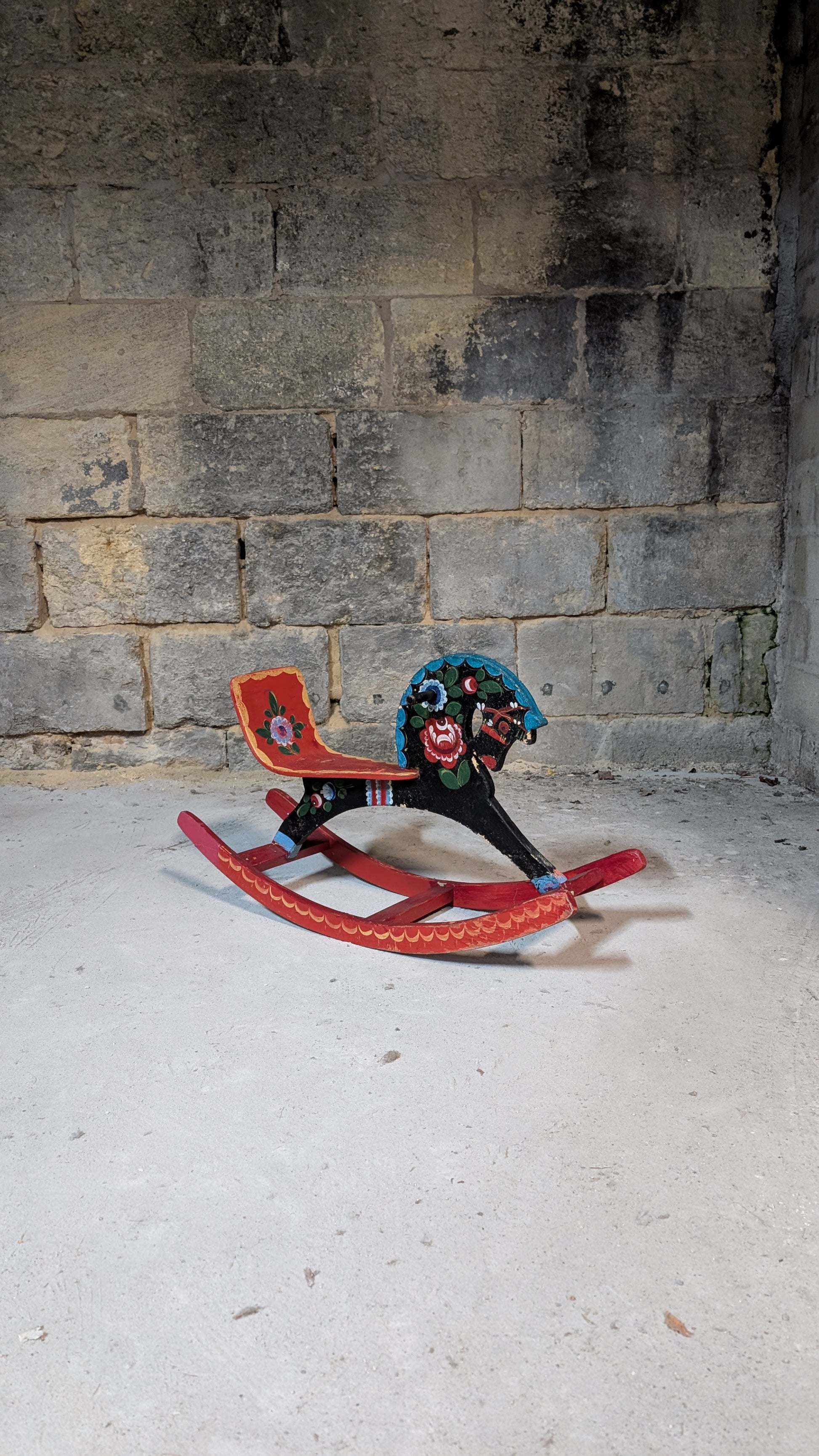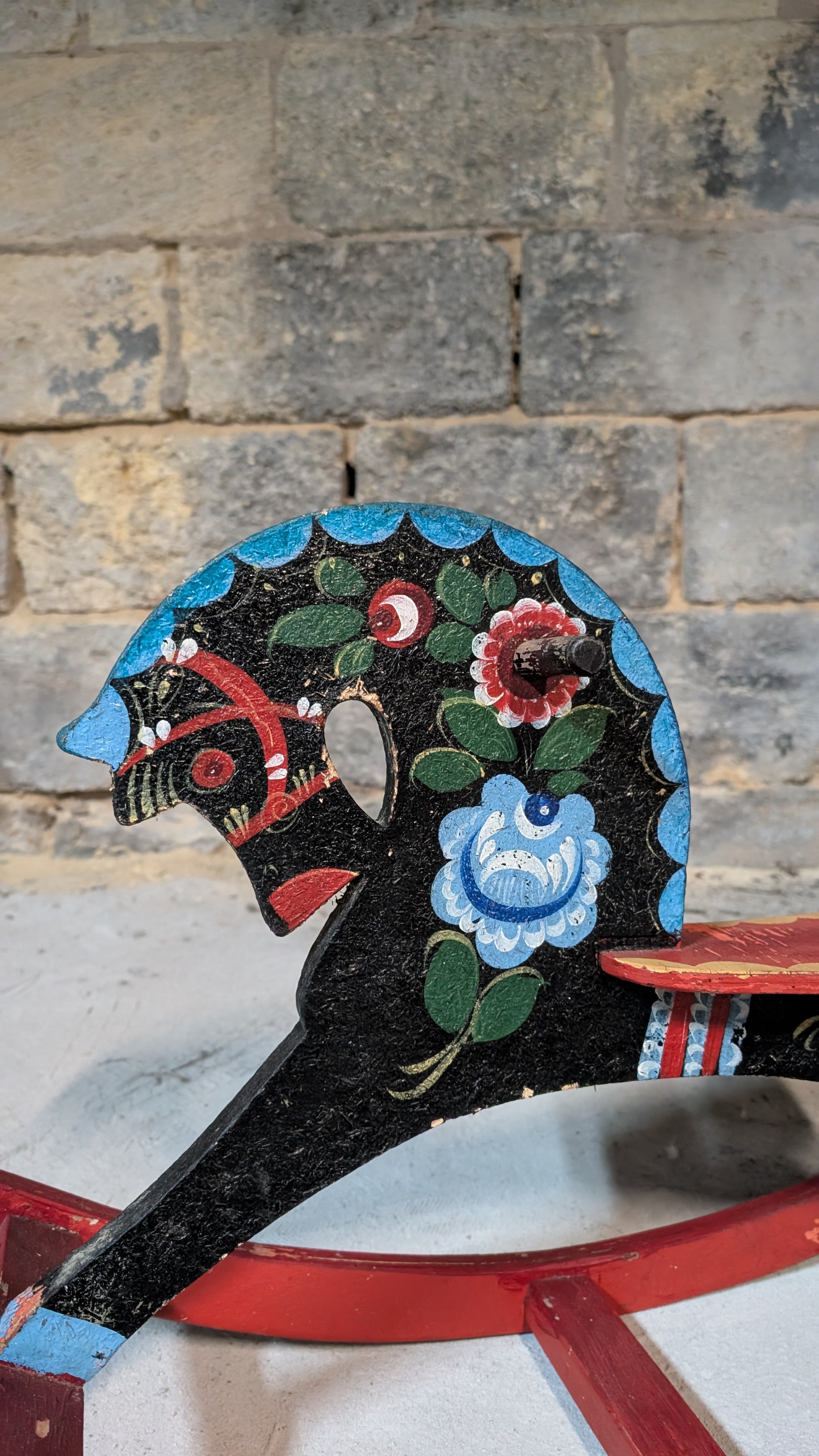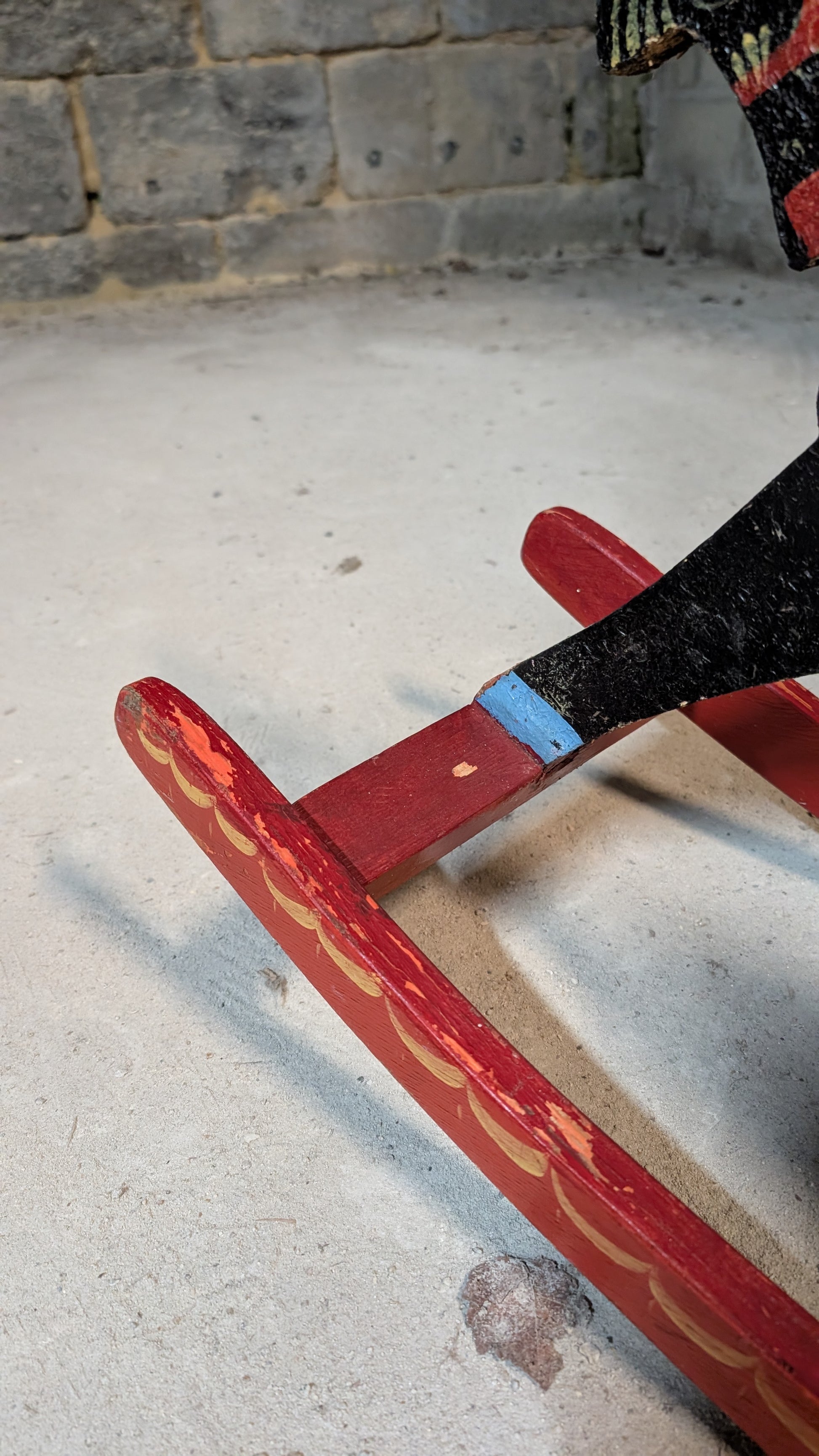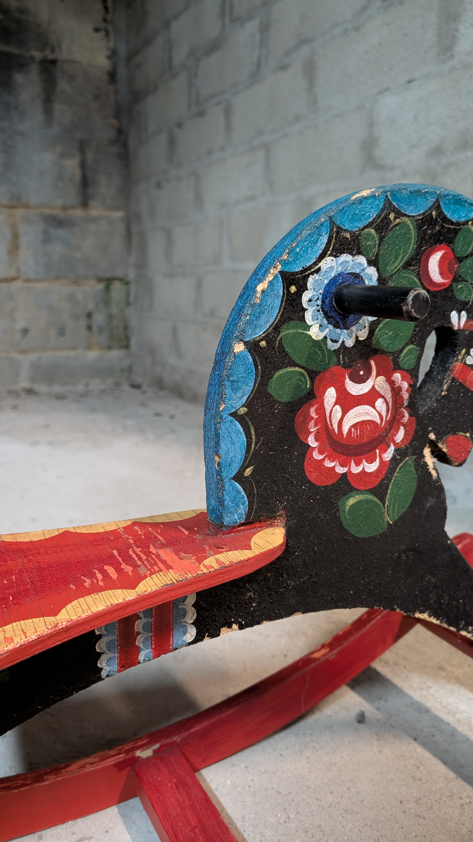 Cheval à bascule en bois peint, décoré de motifs floraux polychromes. Objet ancien au charme authentique, présenté dans son jus, avec traces du temps qui témoignent de son histoire. Une pièce décorative pleine de caractère, idéale pour une ambiance vintage ou bohème.