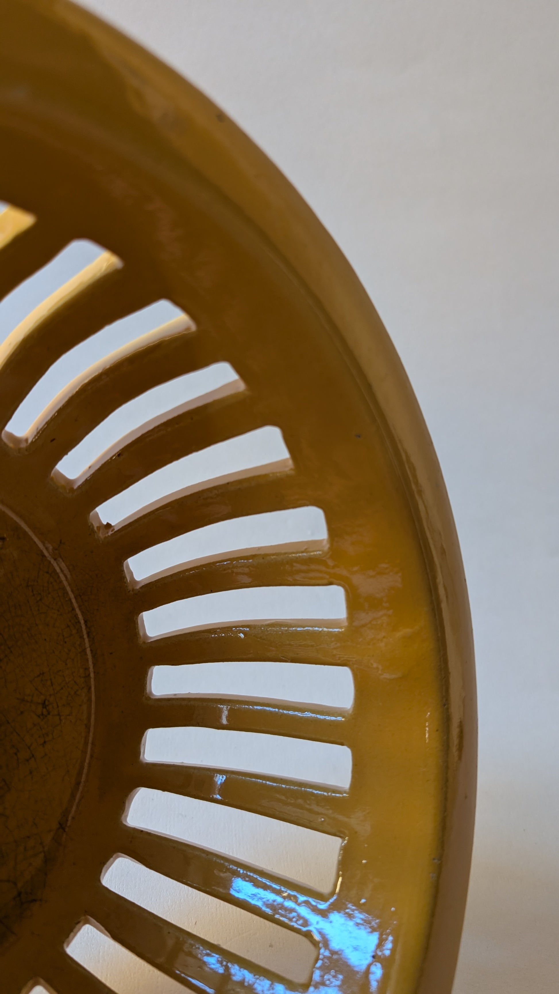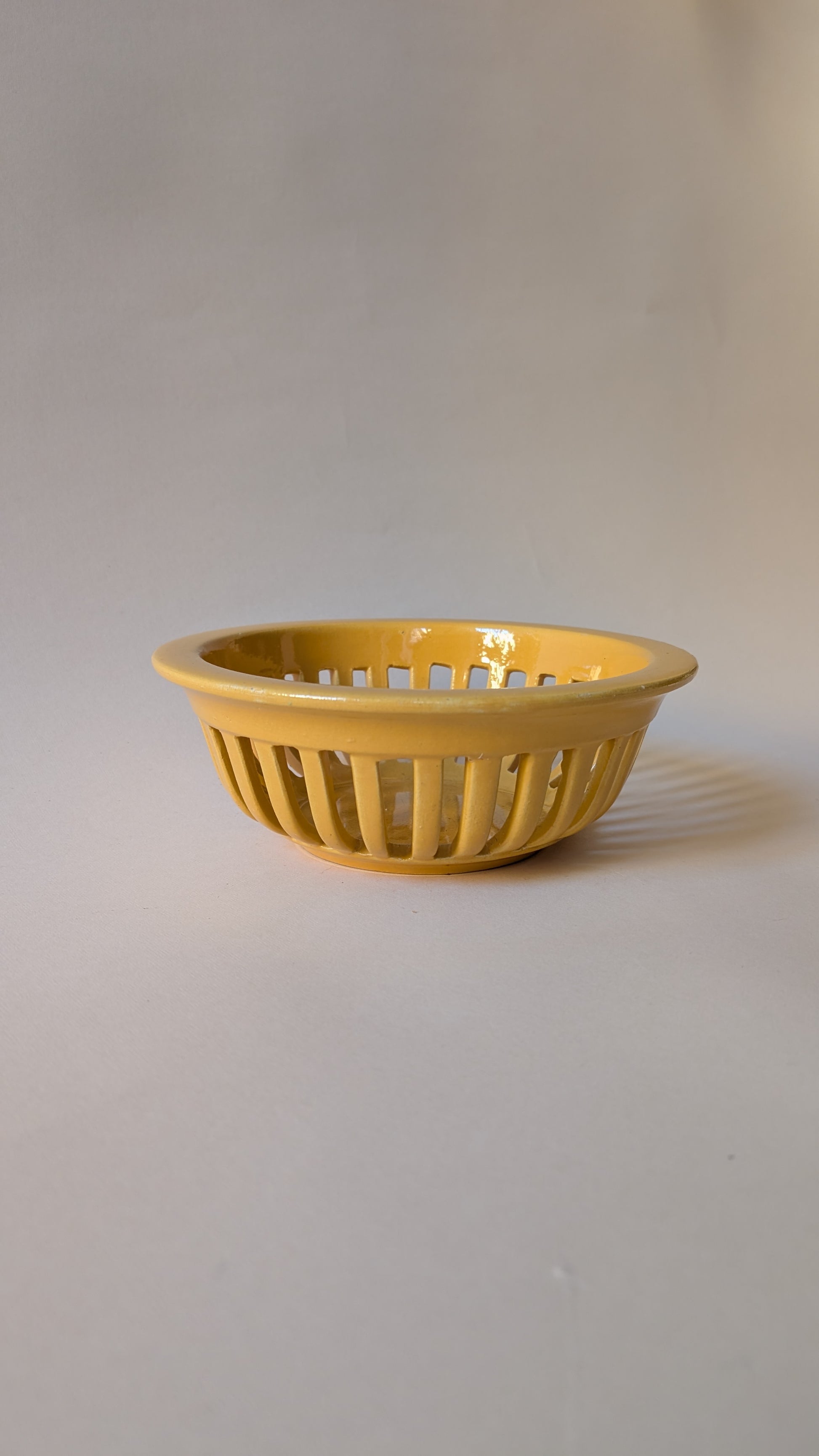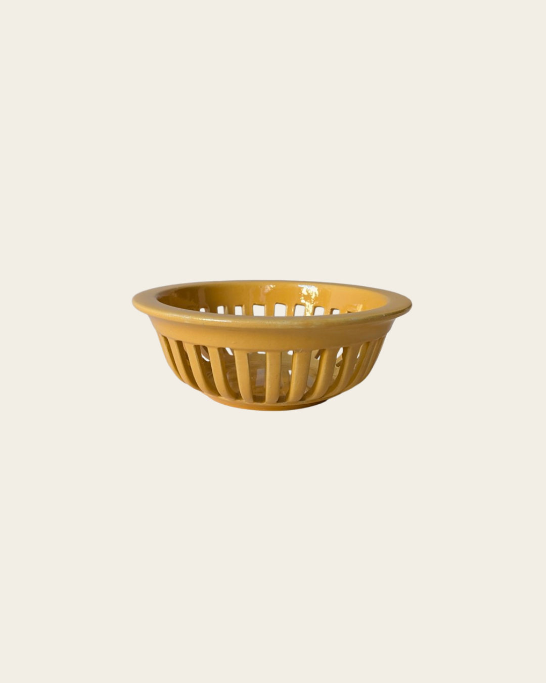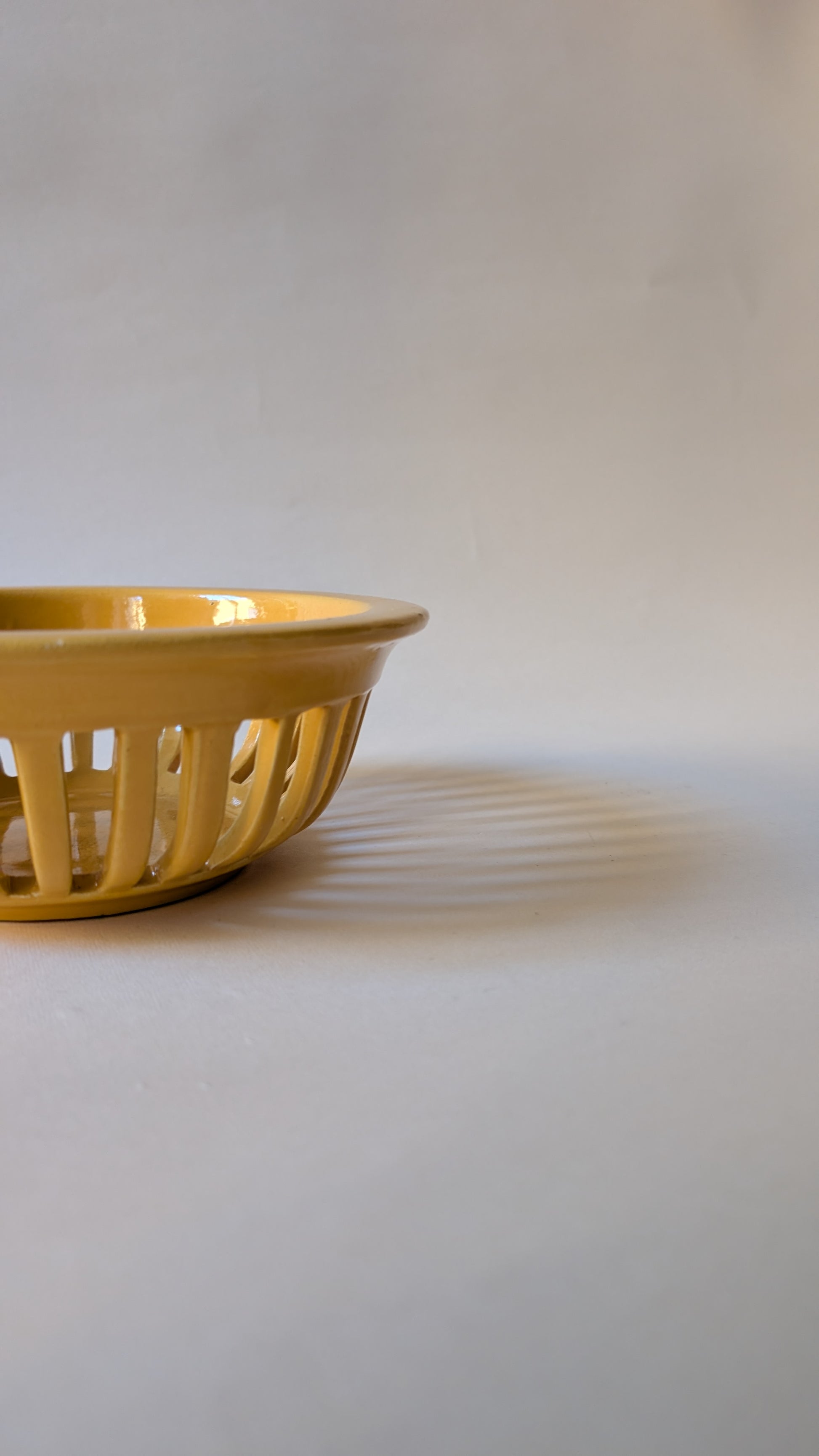 Corbeille en céramique jaune, au design ajouré typique des paniers anciens, avec une finition brillante qui met en valeur sa couleur chaleureuse. Une pièce décorative et fonctionnelle, parfaite pour les fruits ou le service. Hauteur : 8,5 cm, diamètre : 22,5 cm. Poids : 0,8 kg.