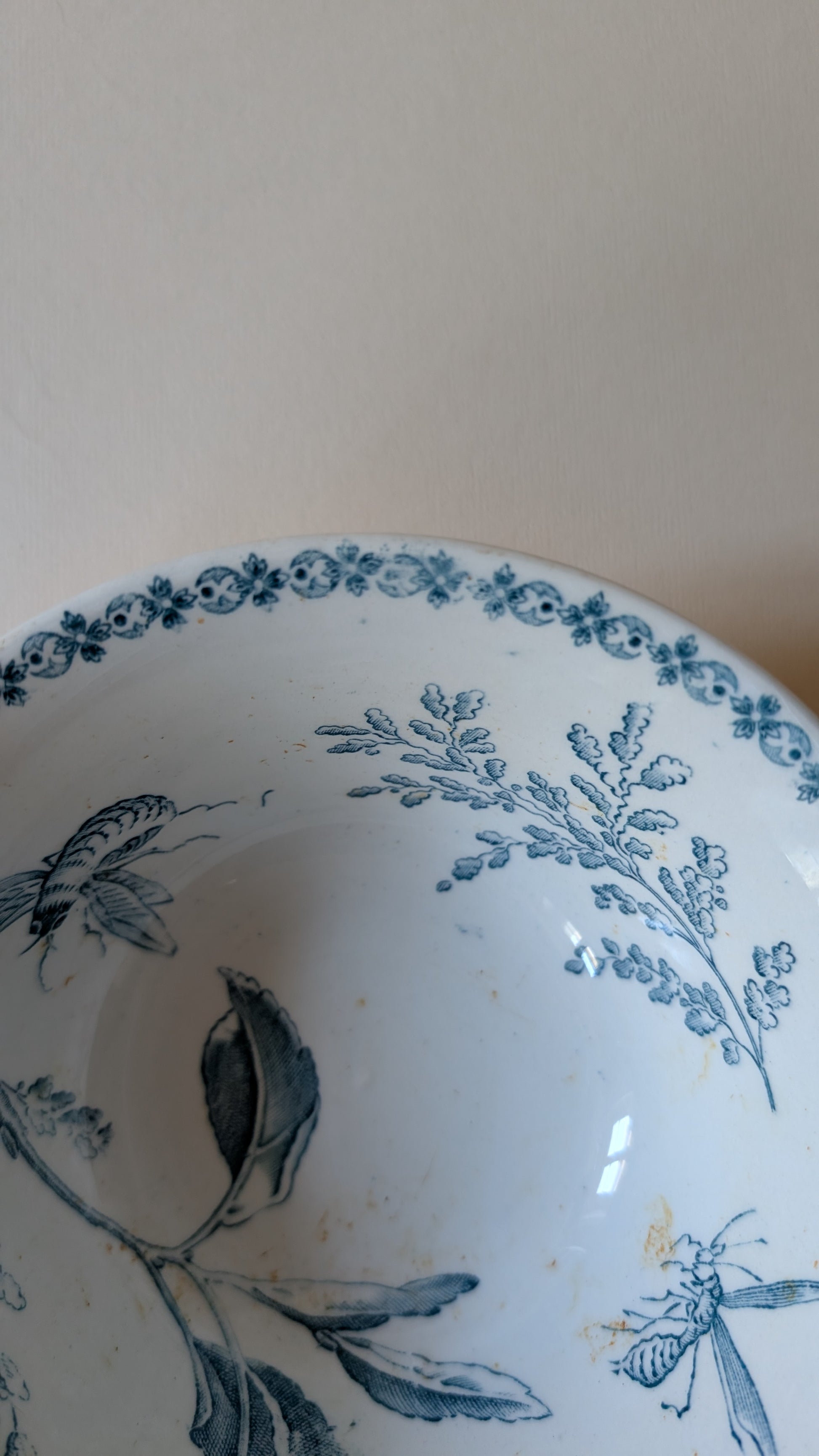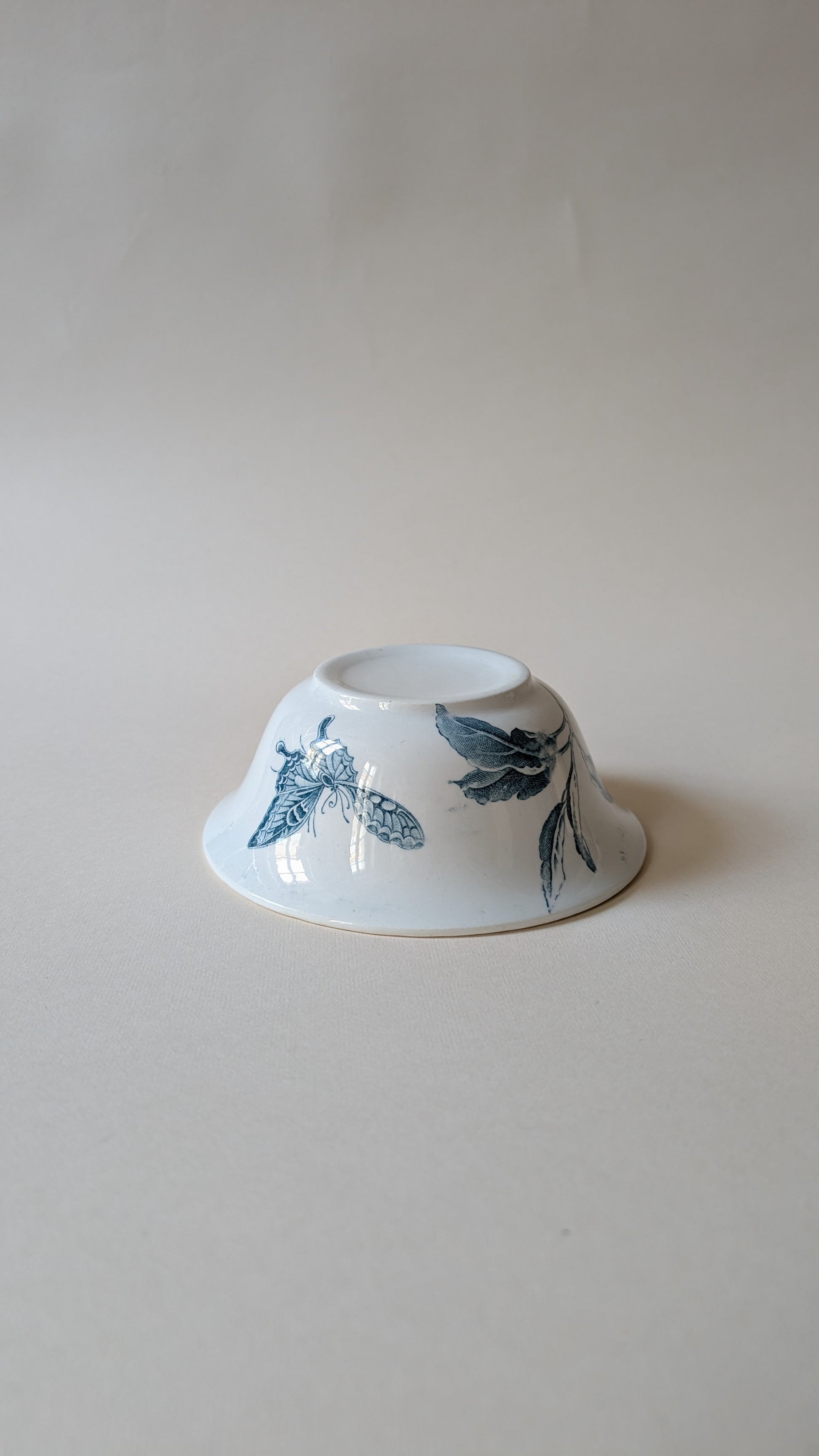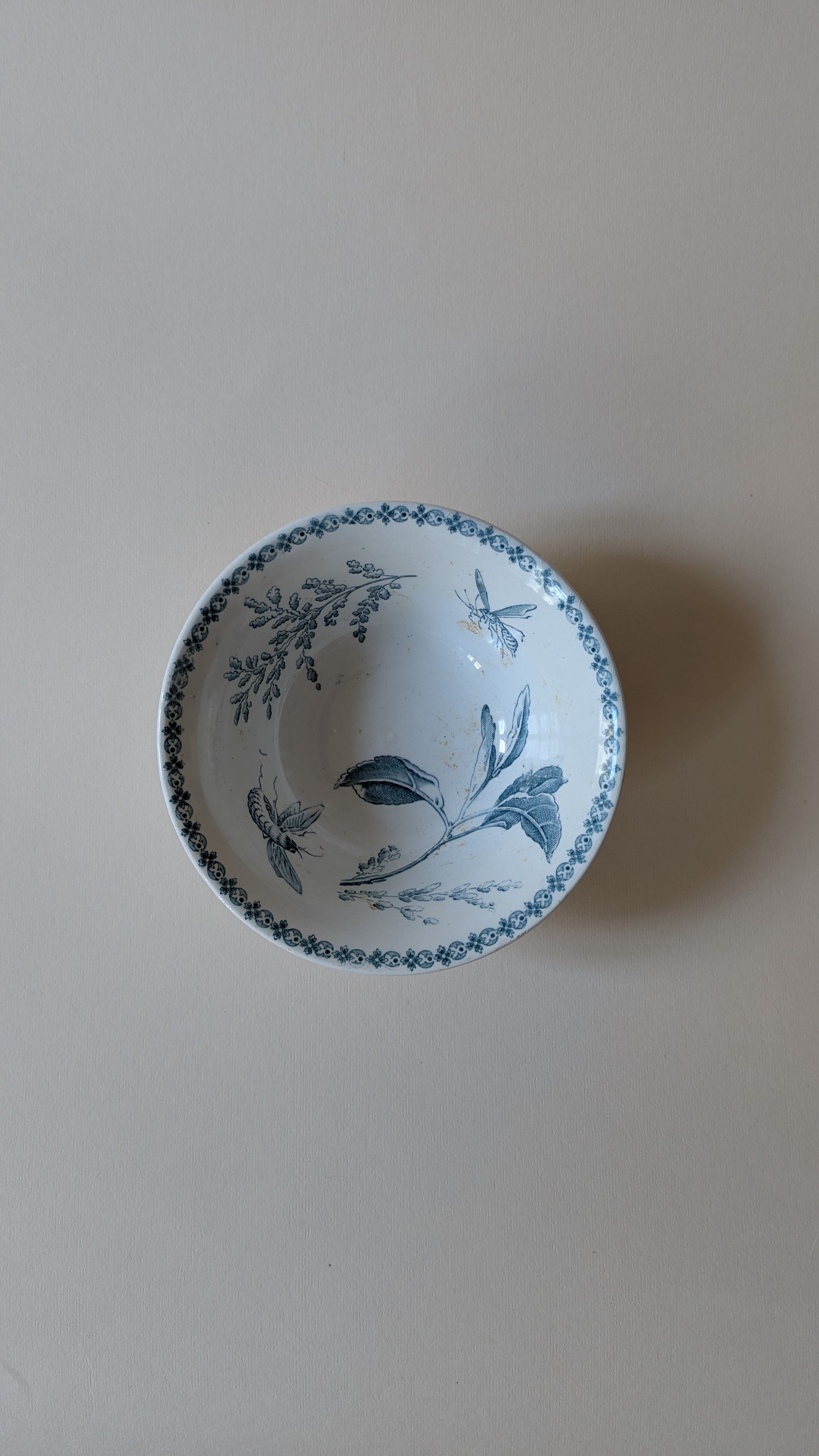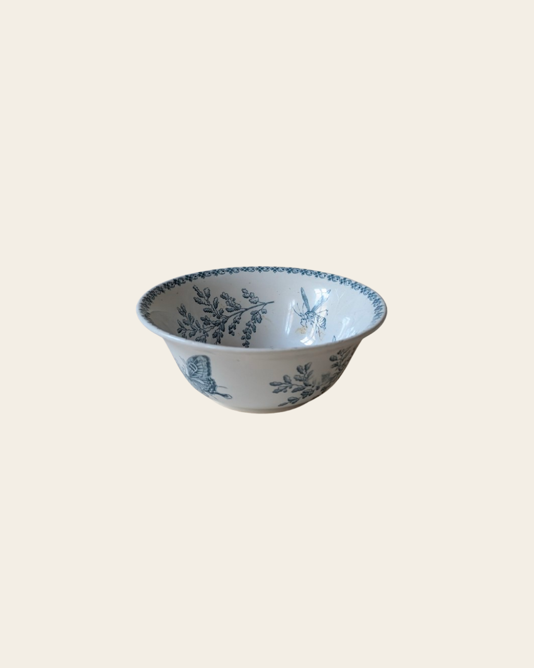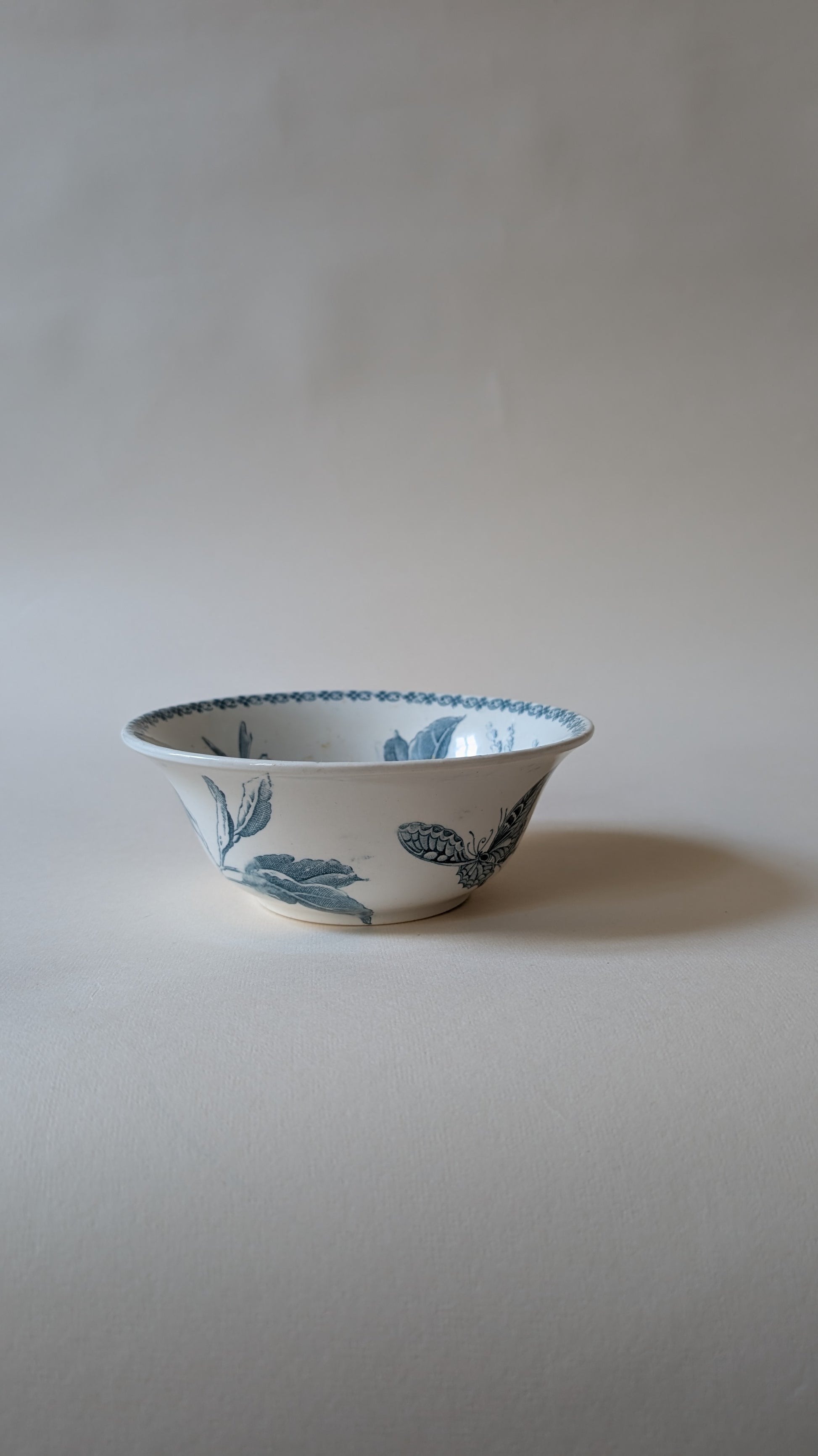 Coupelle ancienne en faïence blanche, ornée d’un décor bleu délicat représentant feuillages et papillon finement dessiné. La bordure intérieure est soulignée d’un motif floral raffiné, typique des décors XIXᵉ / début XXᵉ.
