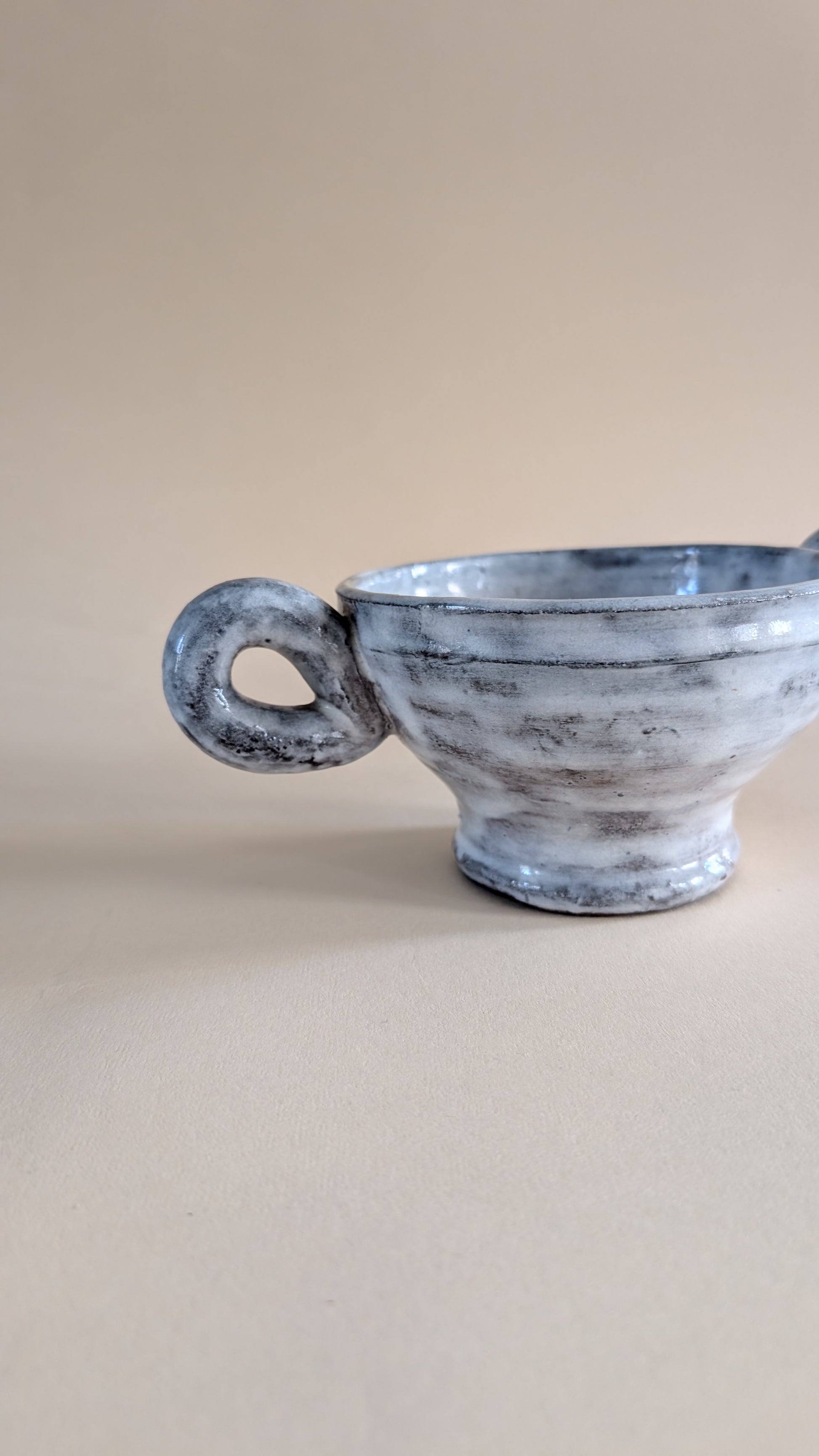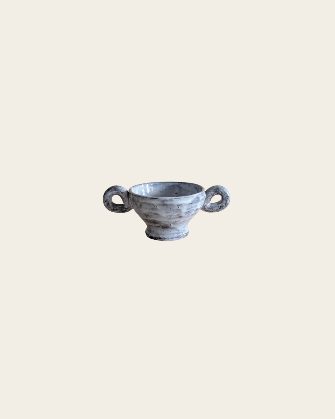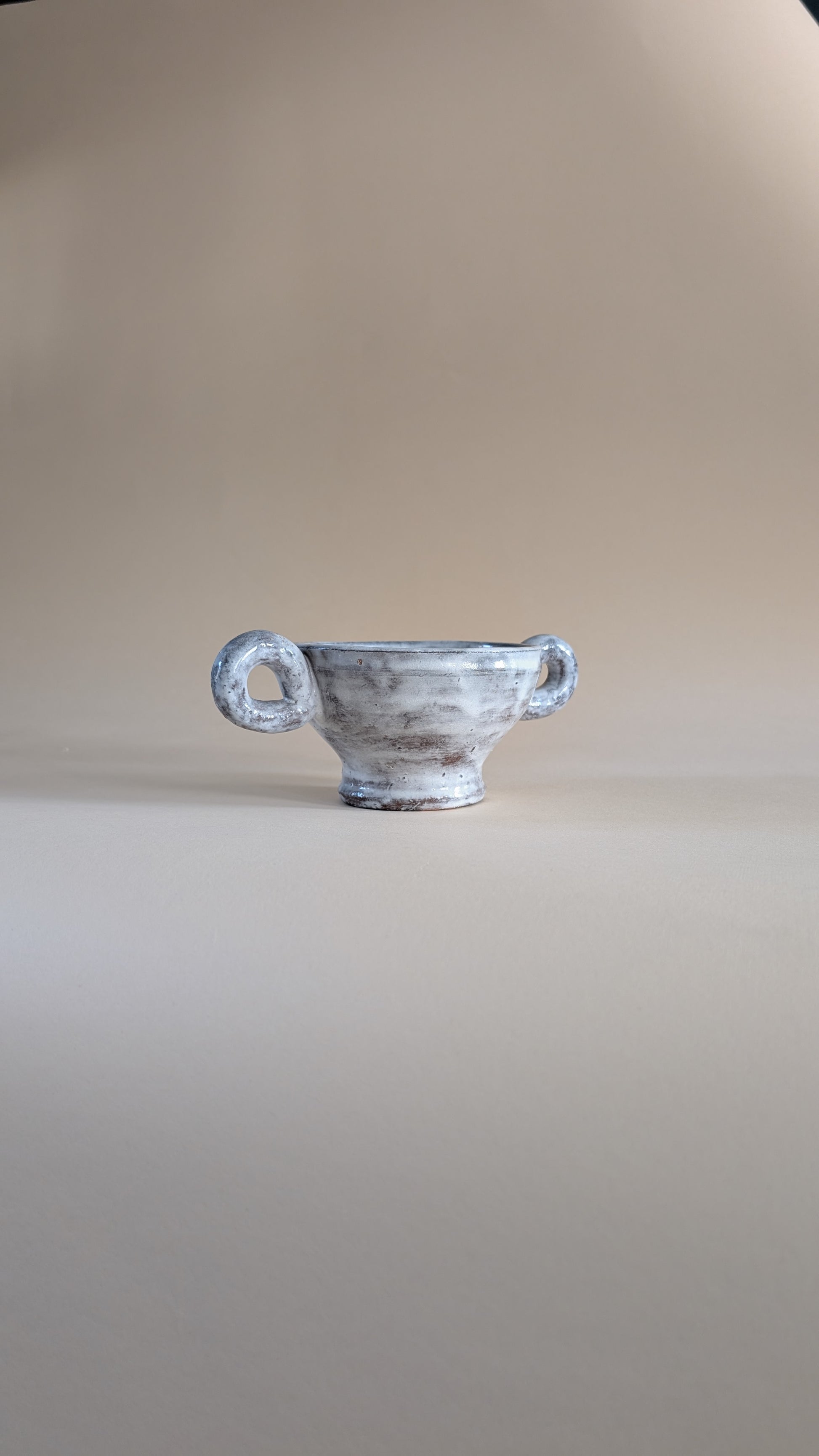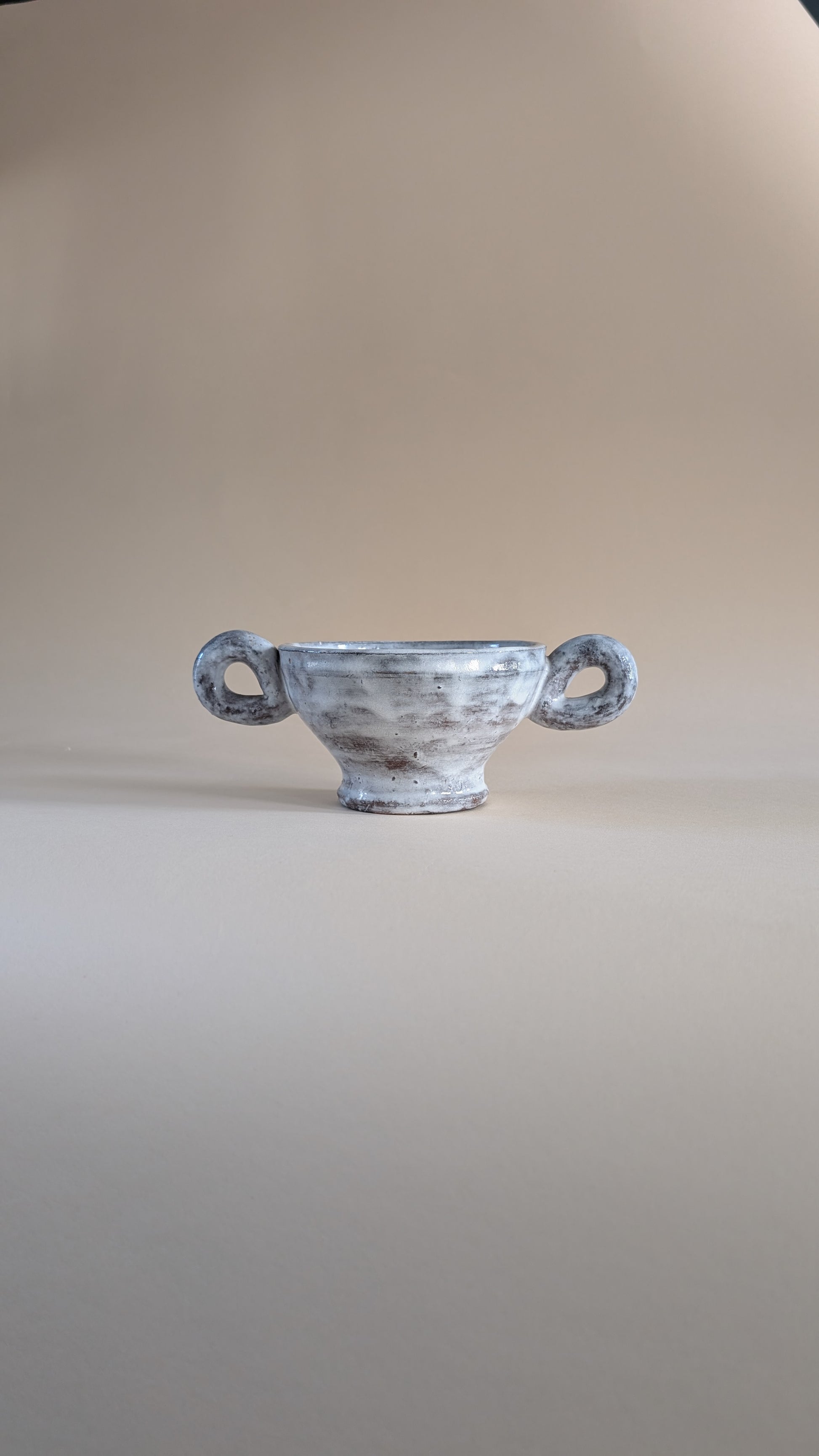 Coupe en céramique émaillée de couleur gris clair avec effet marbré. Elle possède deux grandes anses latérales en forme de boucle. La longueur totale, anses comprises, est de 24 cm. Le diamètre de l’ouverture est de 14 cm, celui du pied mesure 8 cm. Le poids est d’environ 700 grammes.