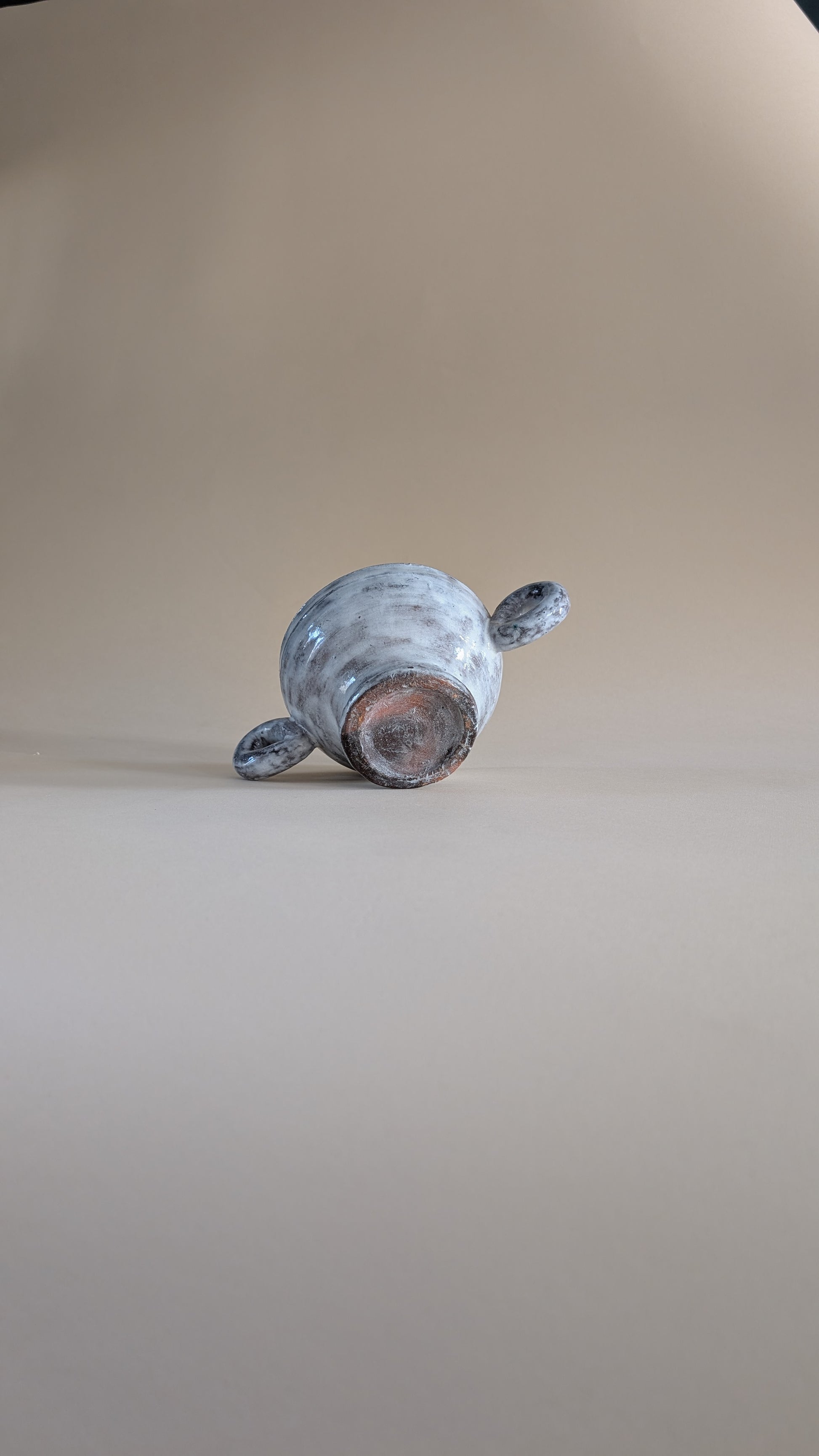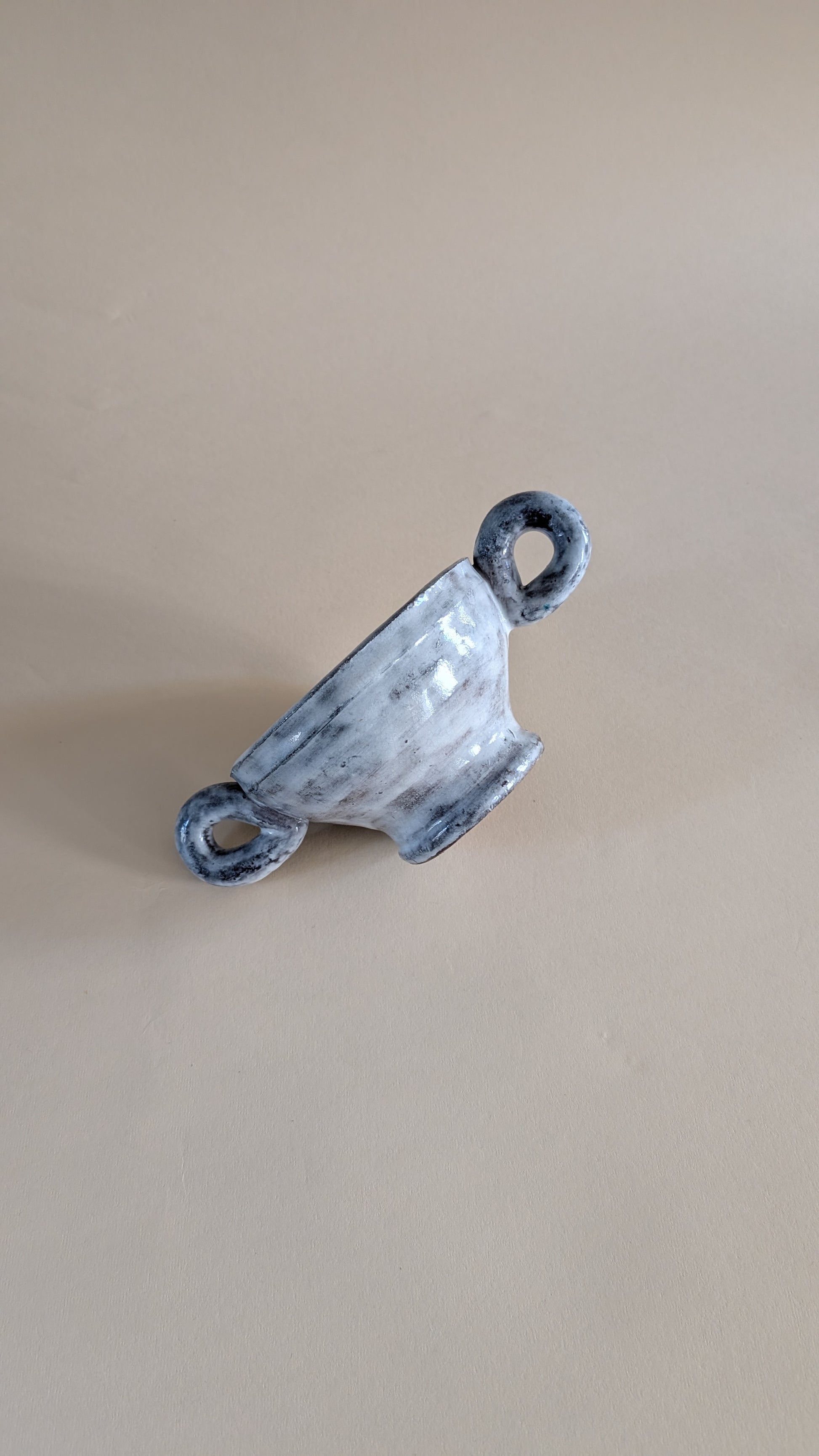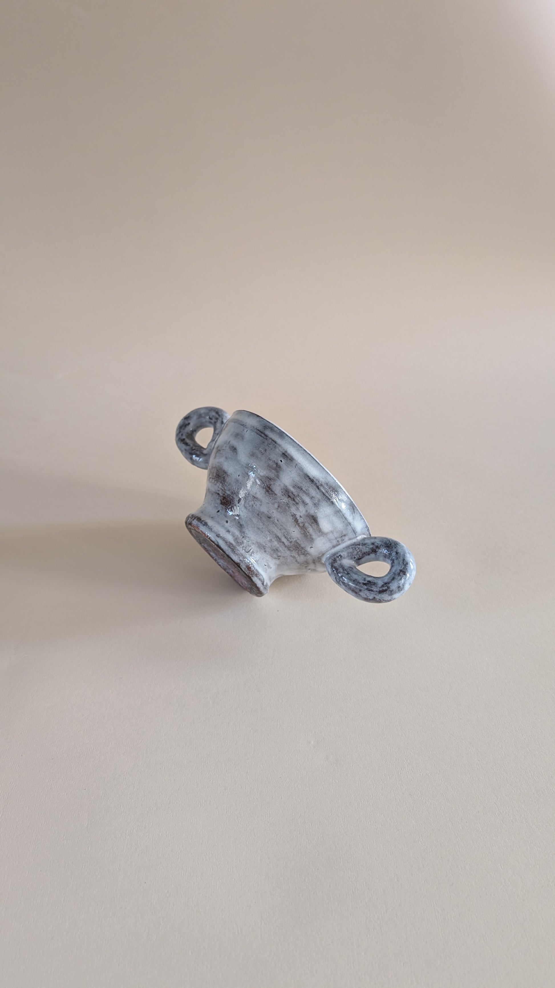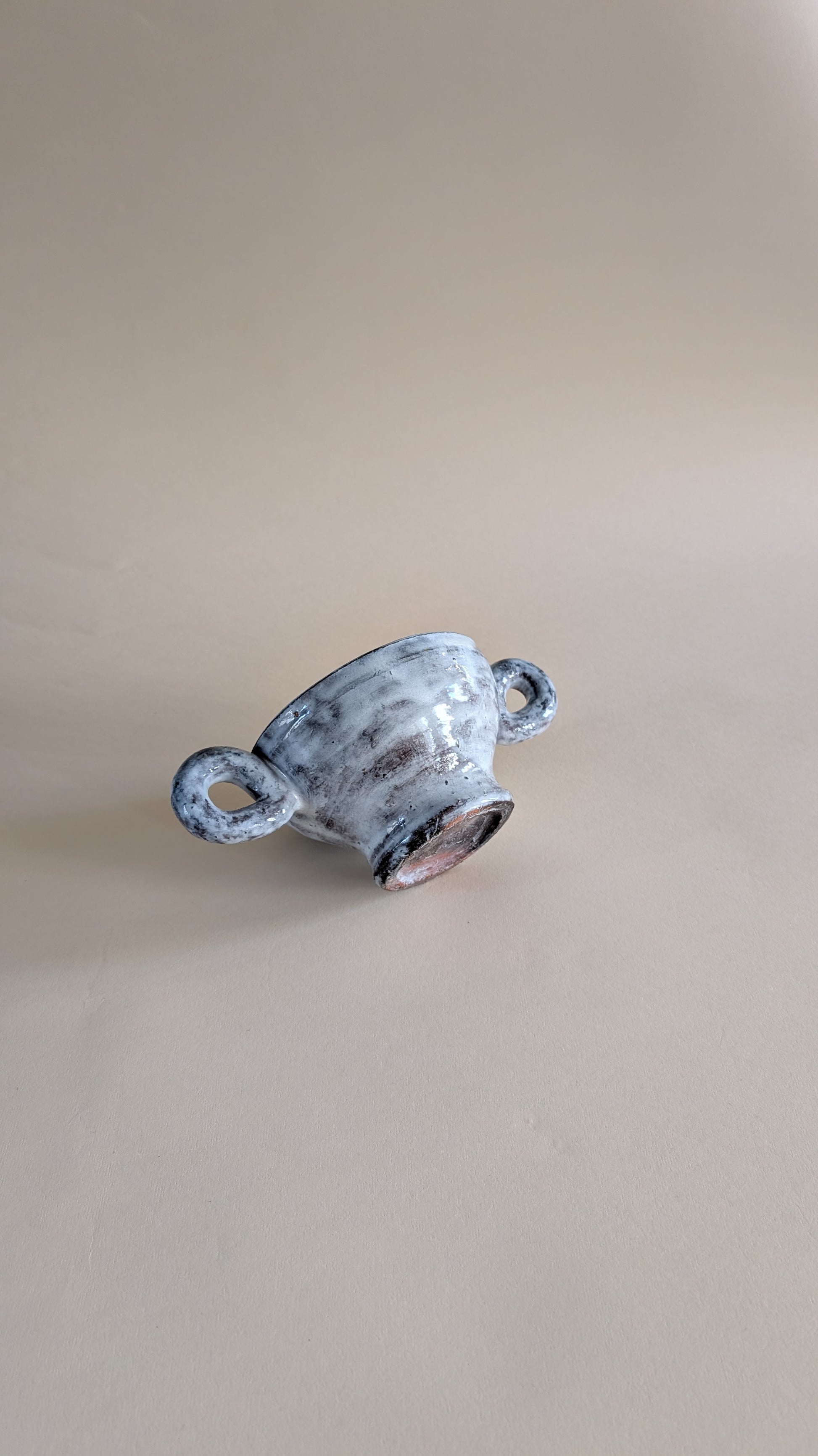 Coupe en céramique émaillée de couleur gris clair avec effet marbré. Elle possède deux grandes anses latérales en forme de boucle. La longueur totale, anses comprises, est de 24 cm. Le diamètre de l’ouverture est de 14 cm, celui du pied mesure 8 cm. Le poids est d’environ 700 grammes.