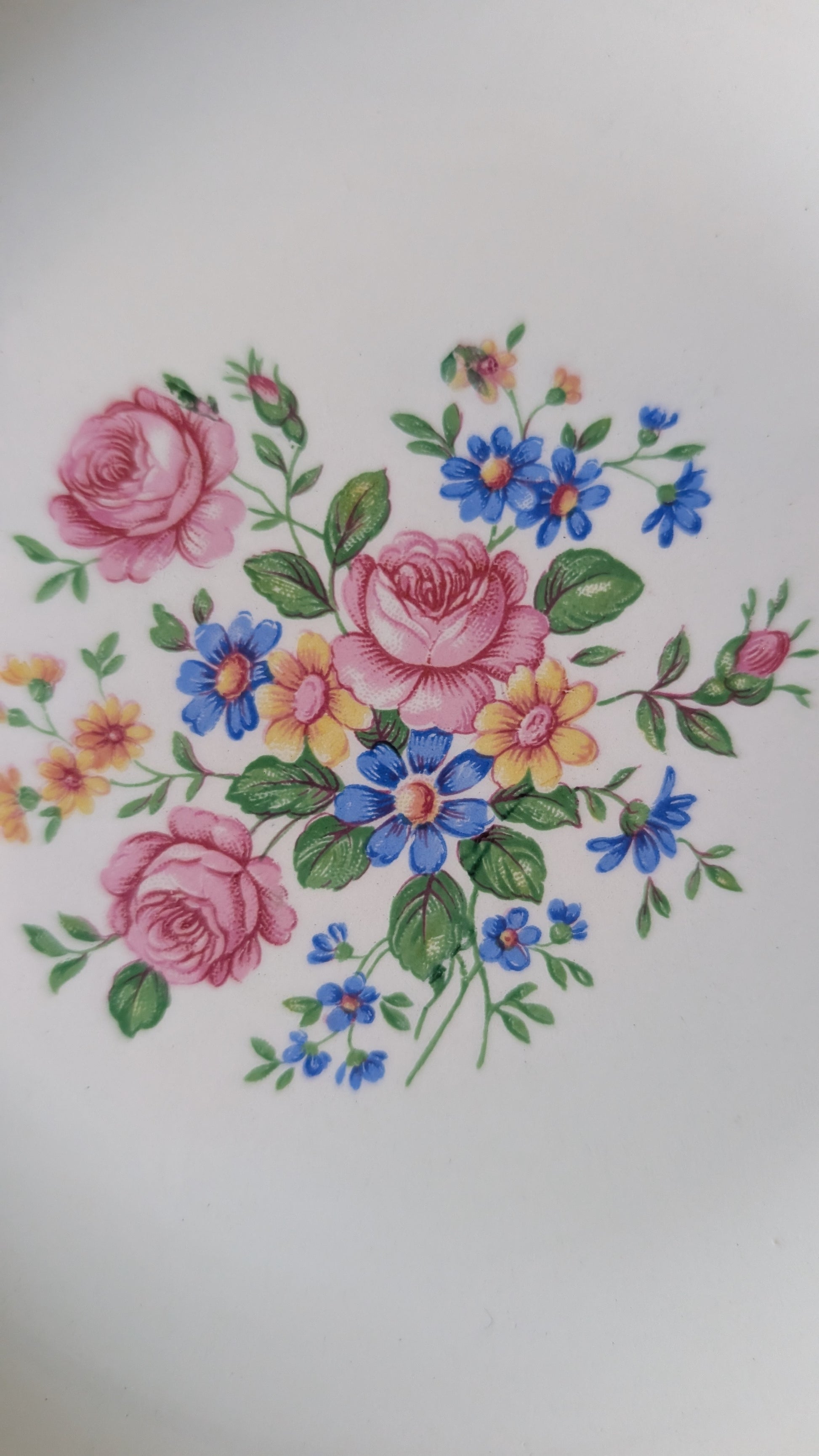 Ensemble de 12 assiettes creuses en faïence Orchies – Moulin des Loups. Elles présentent un décor floral central coloré et un marli vert tendre souligné d’un filet doré, typique du charme rétro de la manufacture. D’un diamètre de 23 cm, elles sont en bon état général avec quelques traces d’usage normales pour de la vaisselle ancienne. Poids total : 4,7 kg.