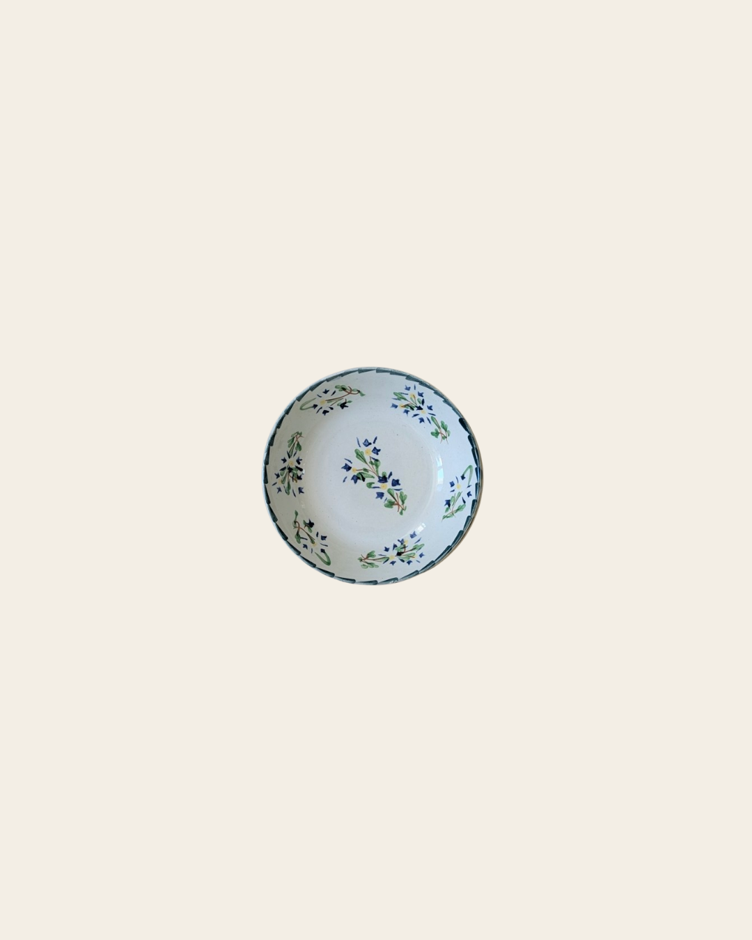 Lot de 3 assiettes creuses en faïence, décor peint à la main de petites fleurs bleues et feuillage.