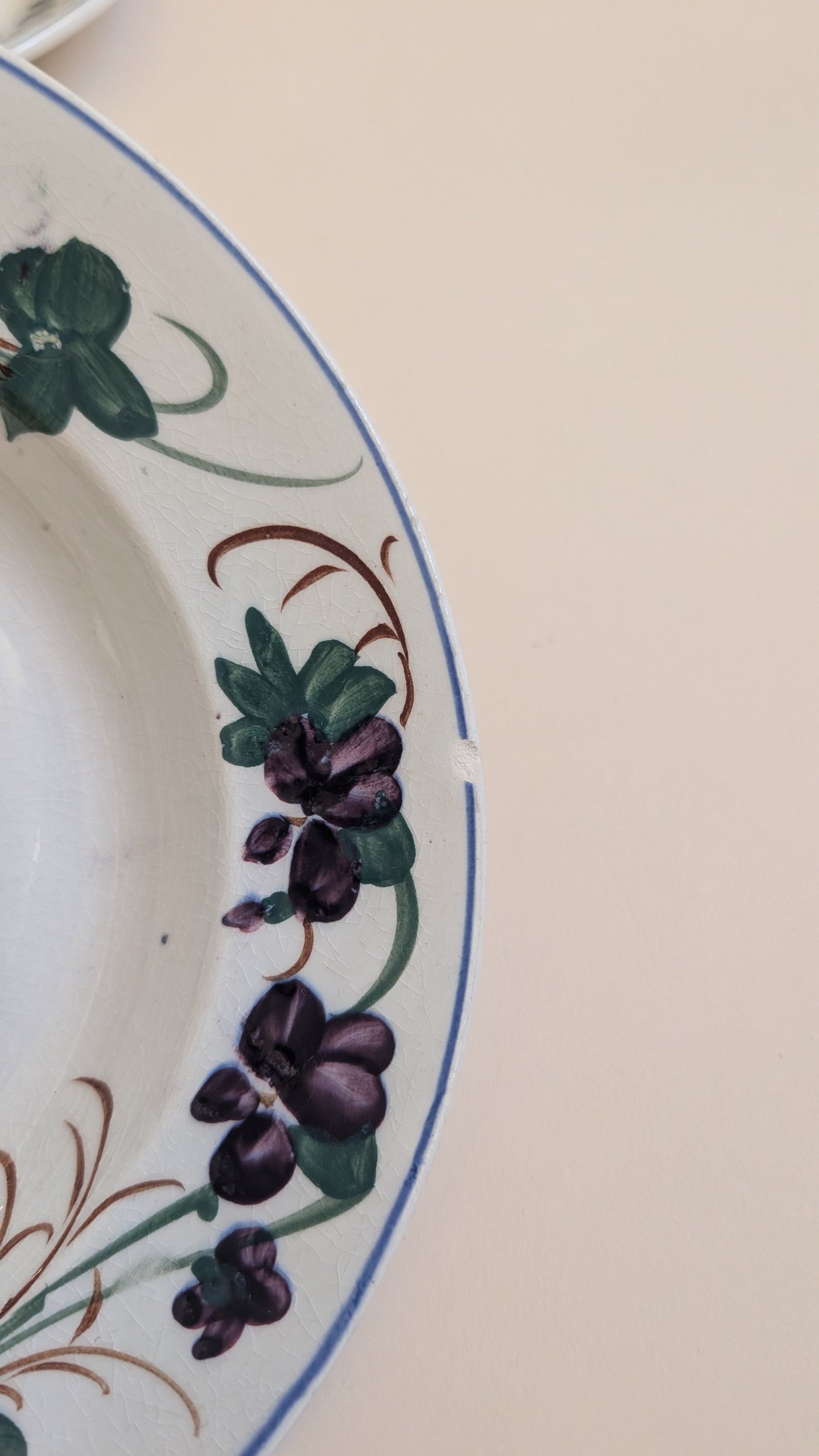 Lot de 4 assiettes creuses anciennes signées Gien, décor floral violet et feuillage vert au charme intemporel.
