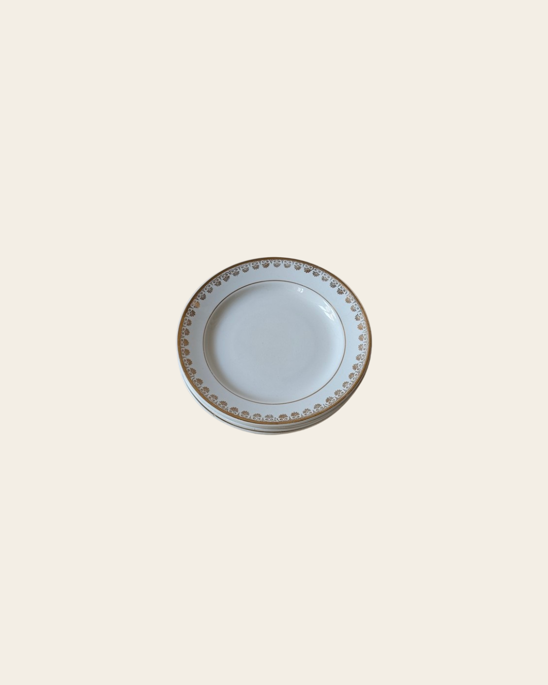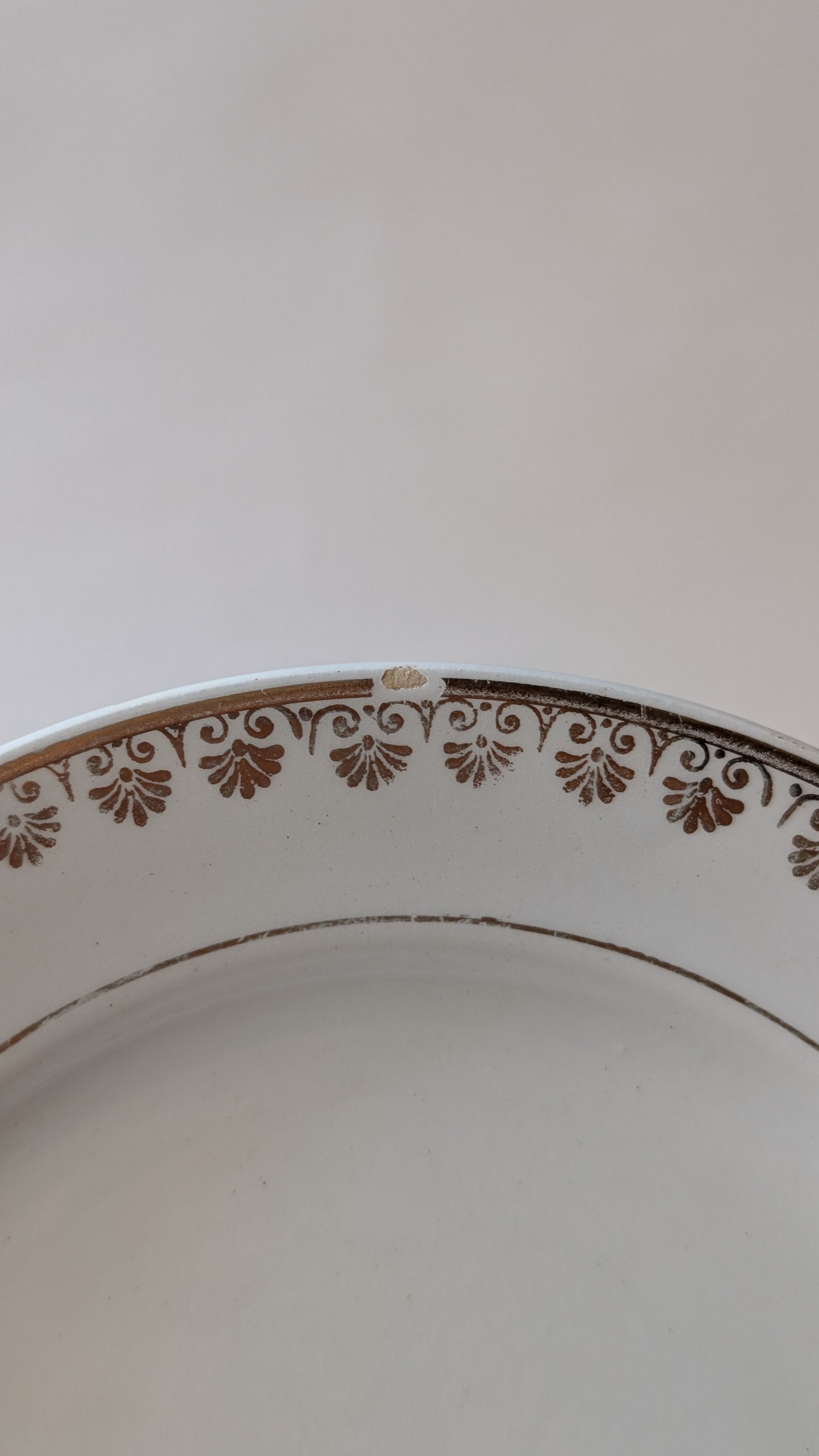Ensemble de 5 assiettes à dessert en terre de fer, manufacture L’Amandinoise. Décor classique doré sur l’aile, apportant une touche élégante et traditionnelle. Diamètre 19,5 cm. Poids total : 1,3 kg. Les assiettes présentent quelques défauts d’usage mais restent solides et parfaitement fonctionnelles.
