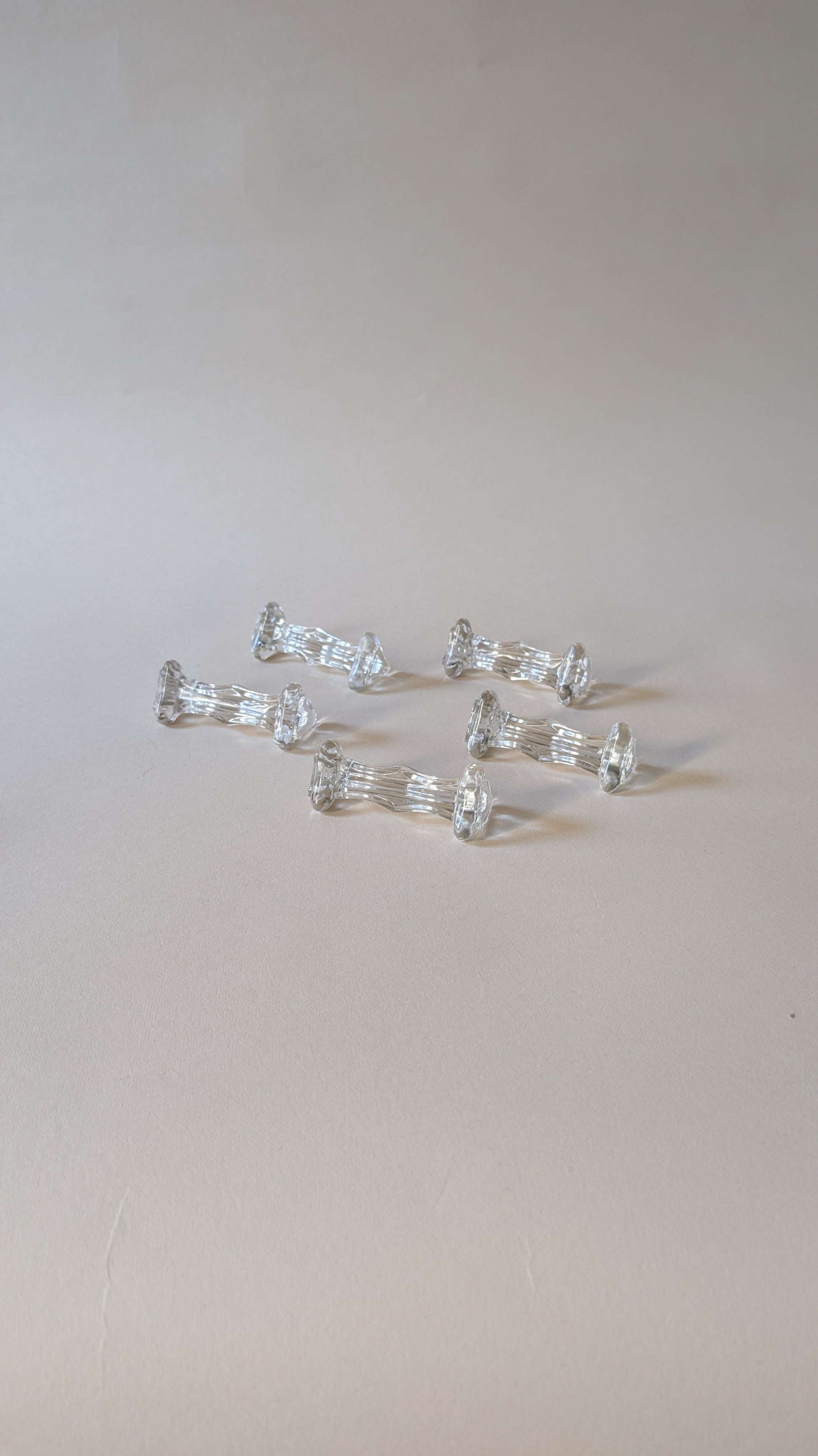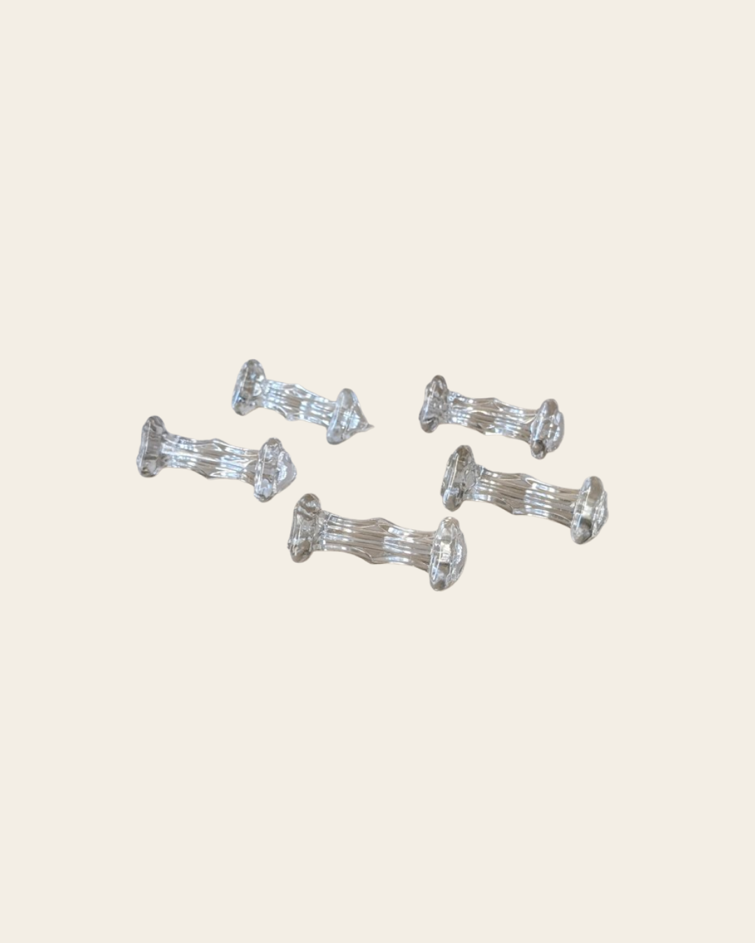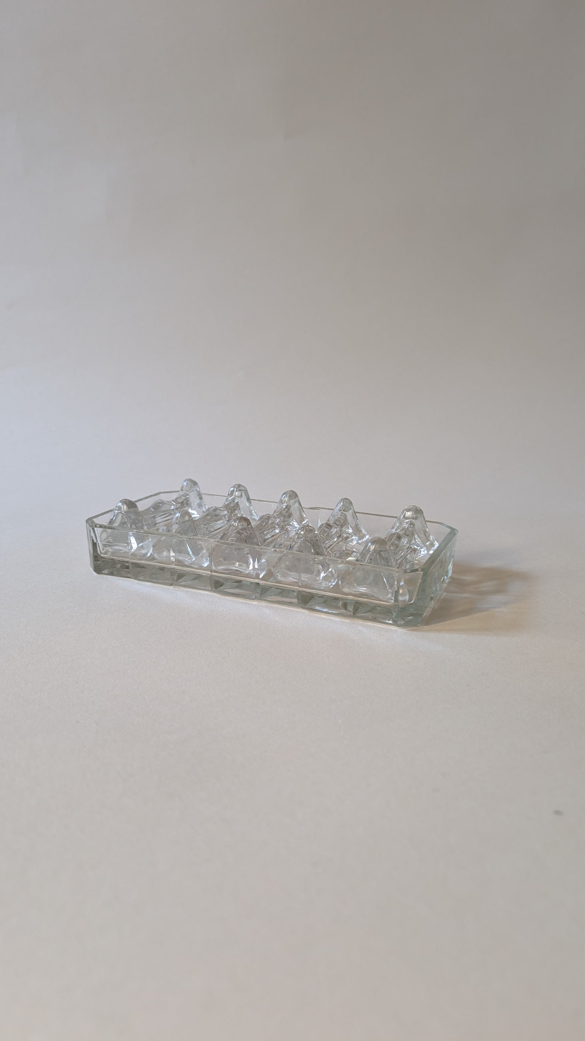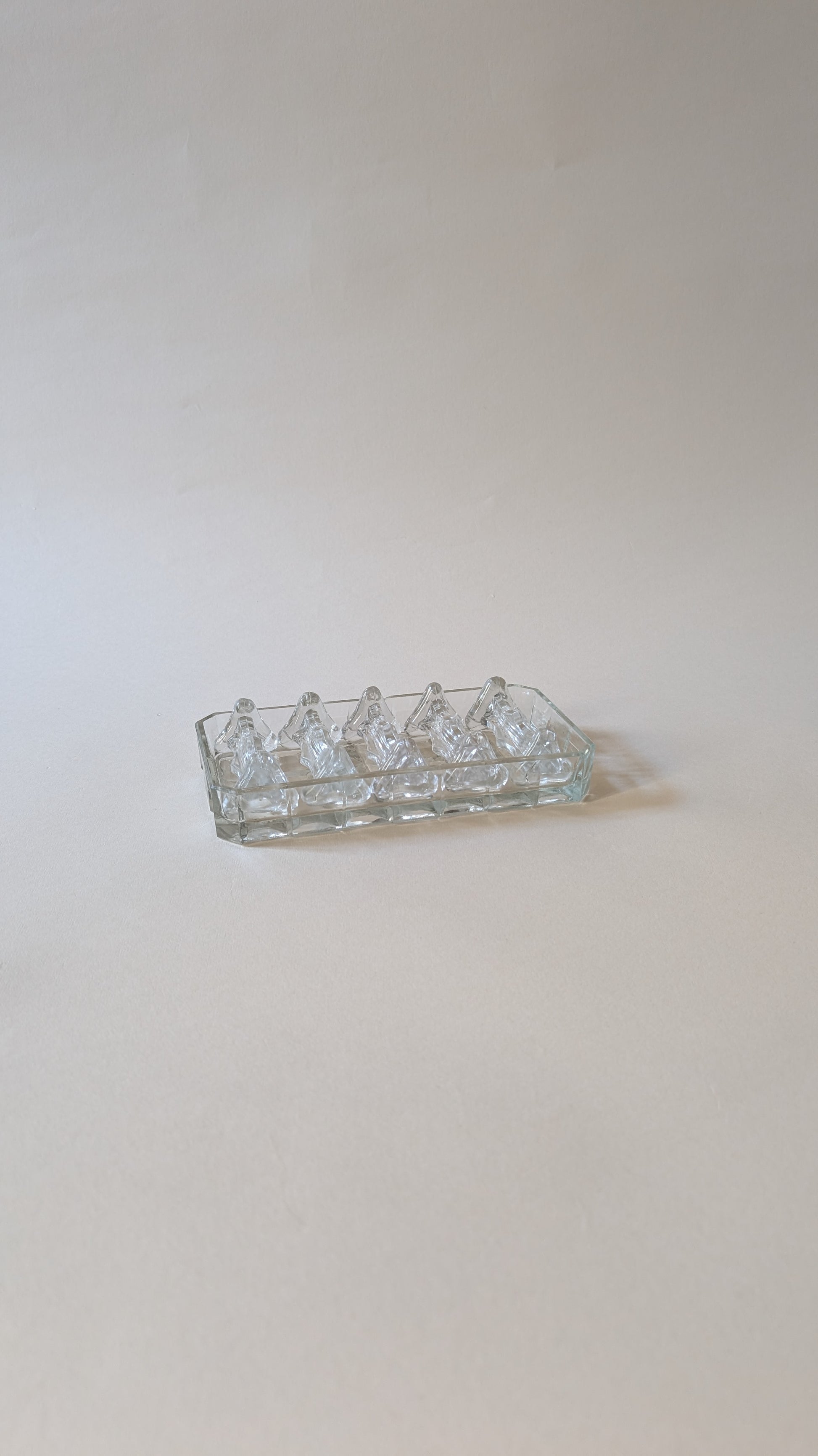 Ensemble de cinq porte-couteaux en verre pressé présentés dans leur plateau d’origine. Leur transparence et leurs lignes élégantes apportent une touche raffinée et intemporelle à la table.