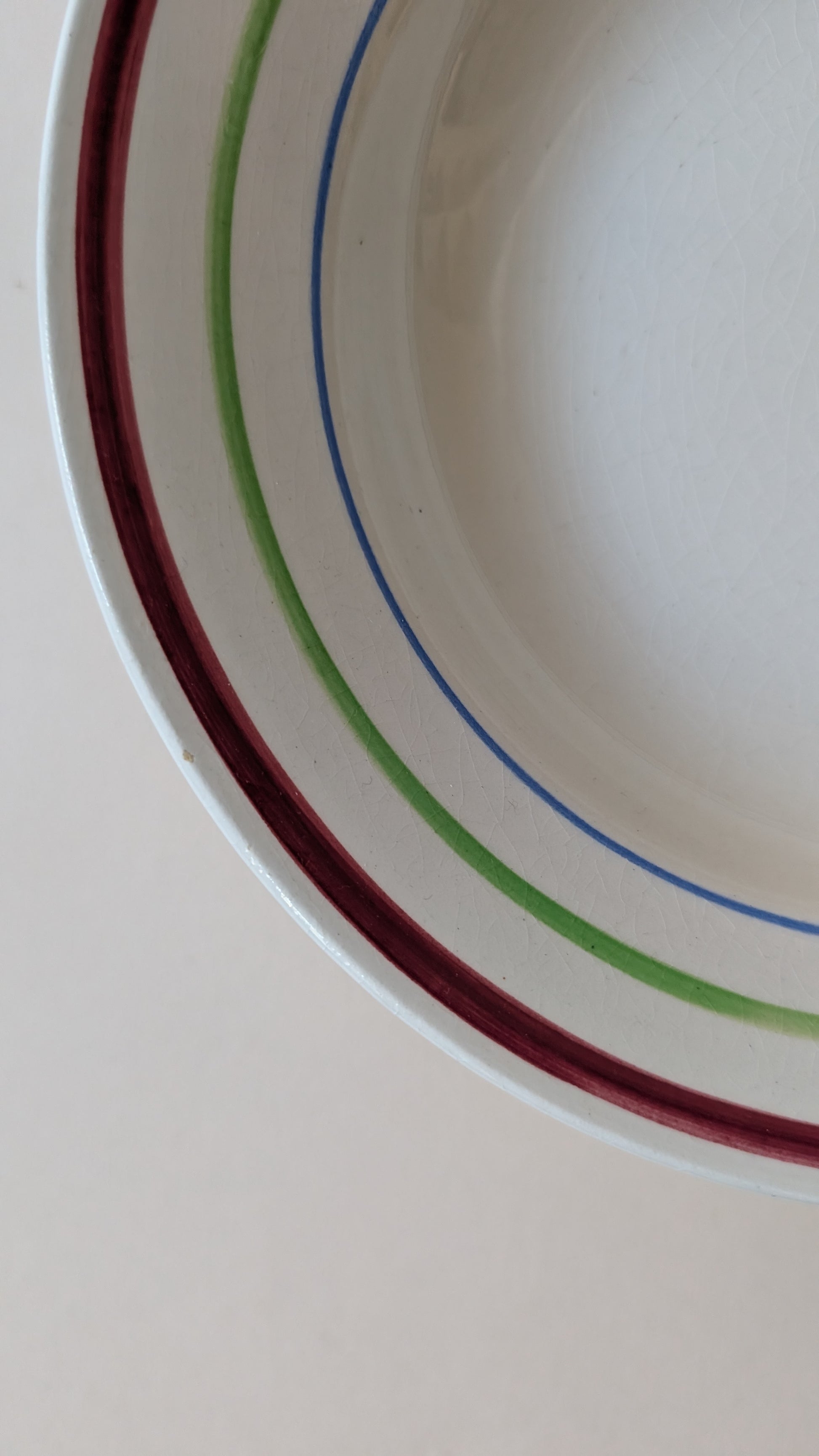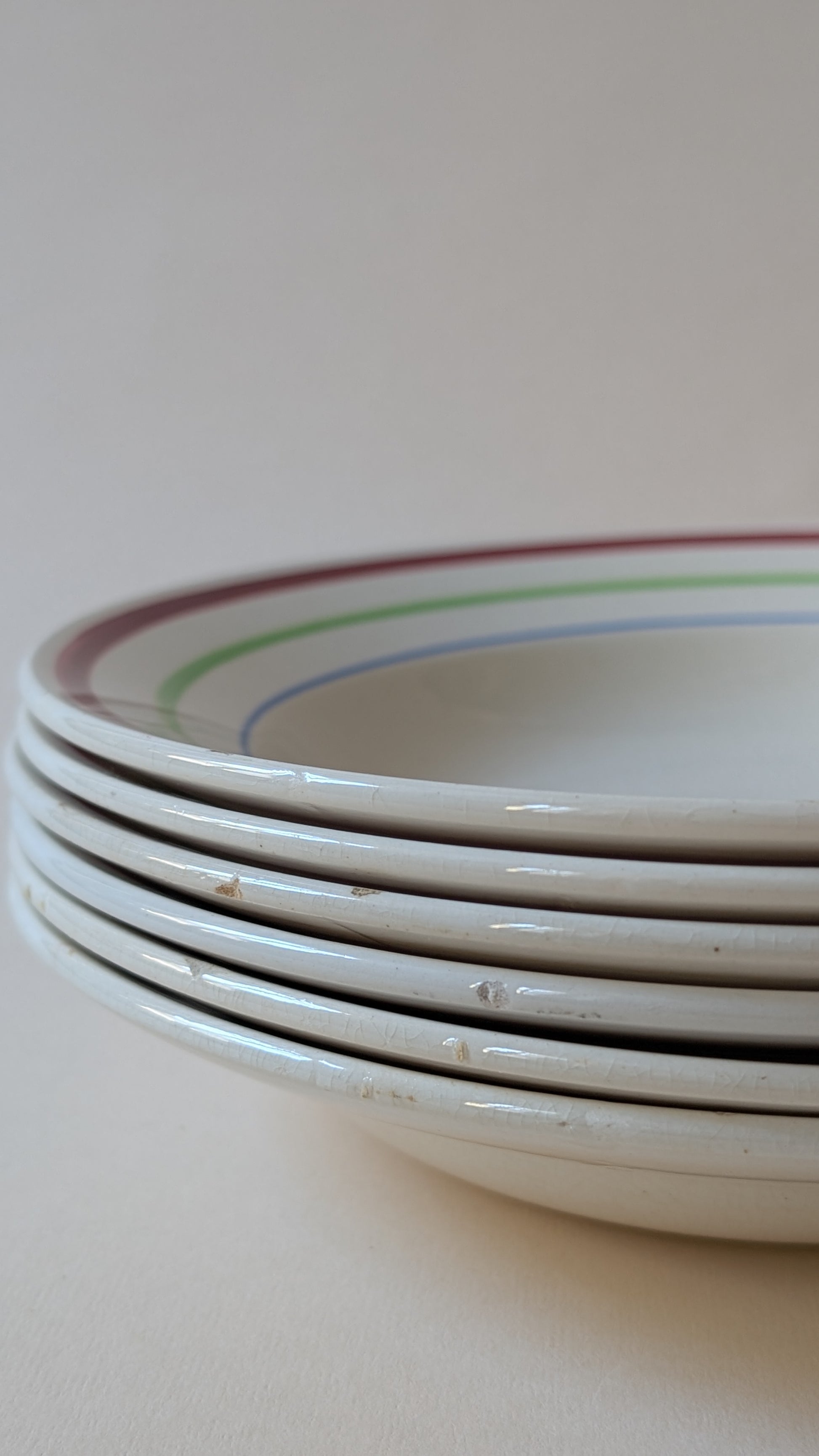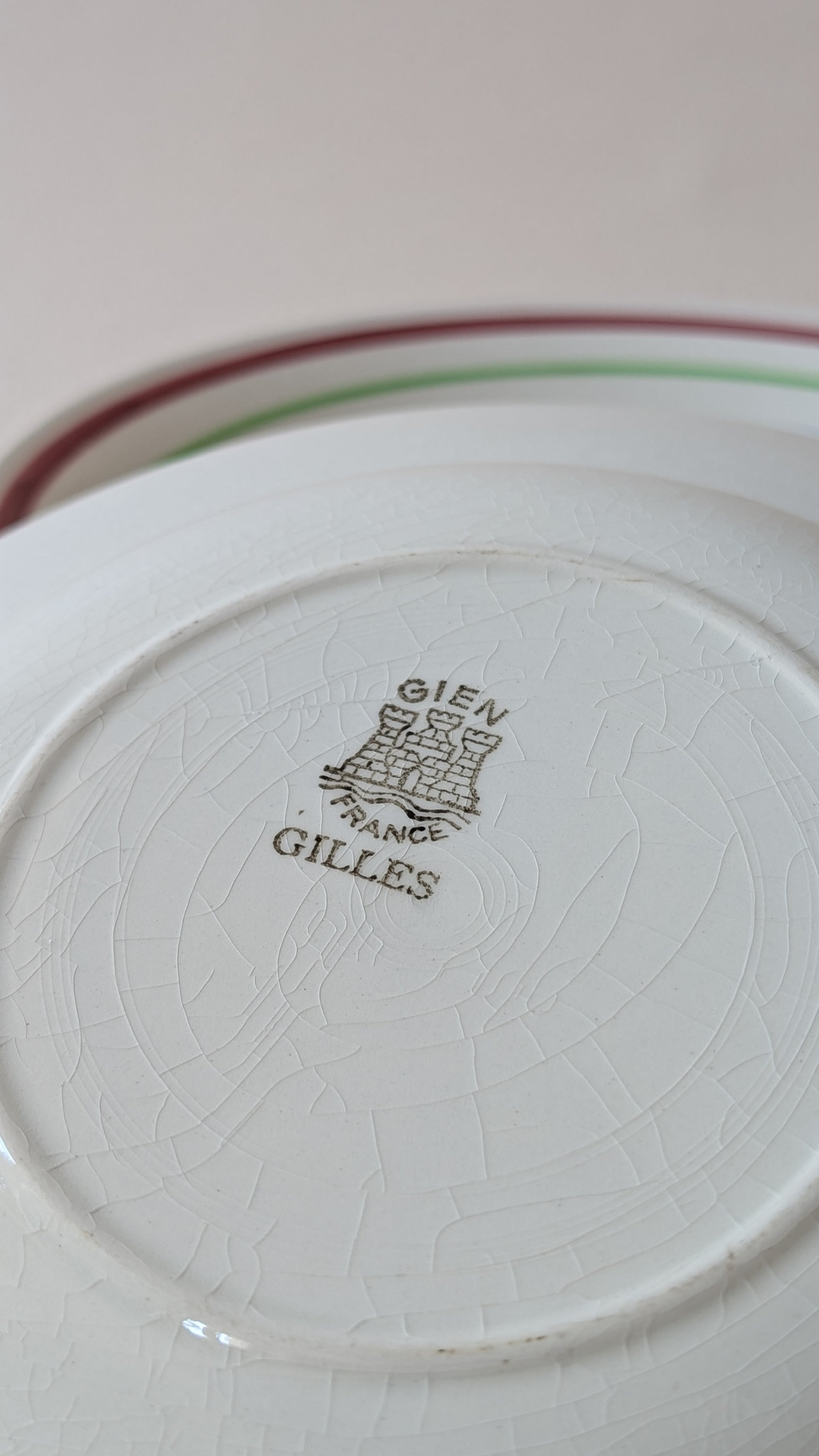 Ensemble de 6 assiettes creuses Gien – modèle Gilles, fabriqué en France. Décor à anneaux colorés dans des tons verts, bleus et rosés, typique de la série. Diamètre 22 cm. Poids total : 2,4 kg. Les assiettes présentent quelques défauts d’usage, mais restent parfaitement utilisables et homogènes.