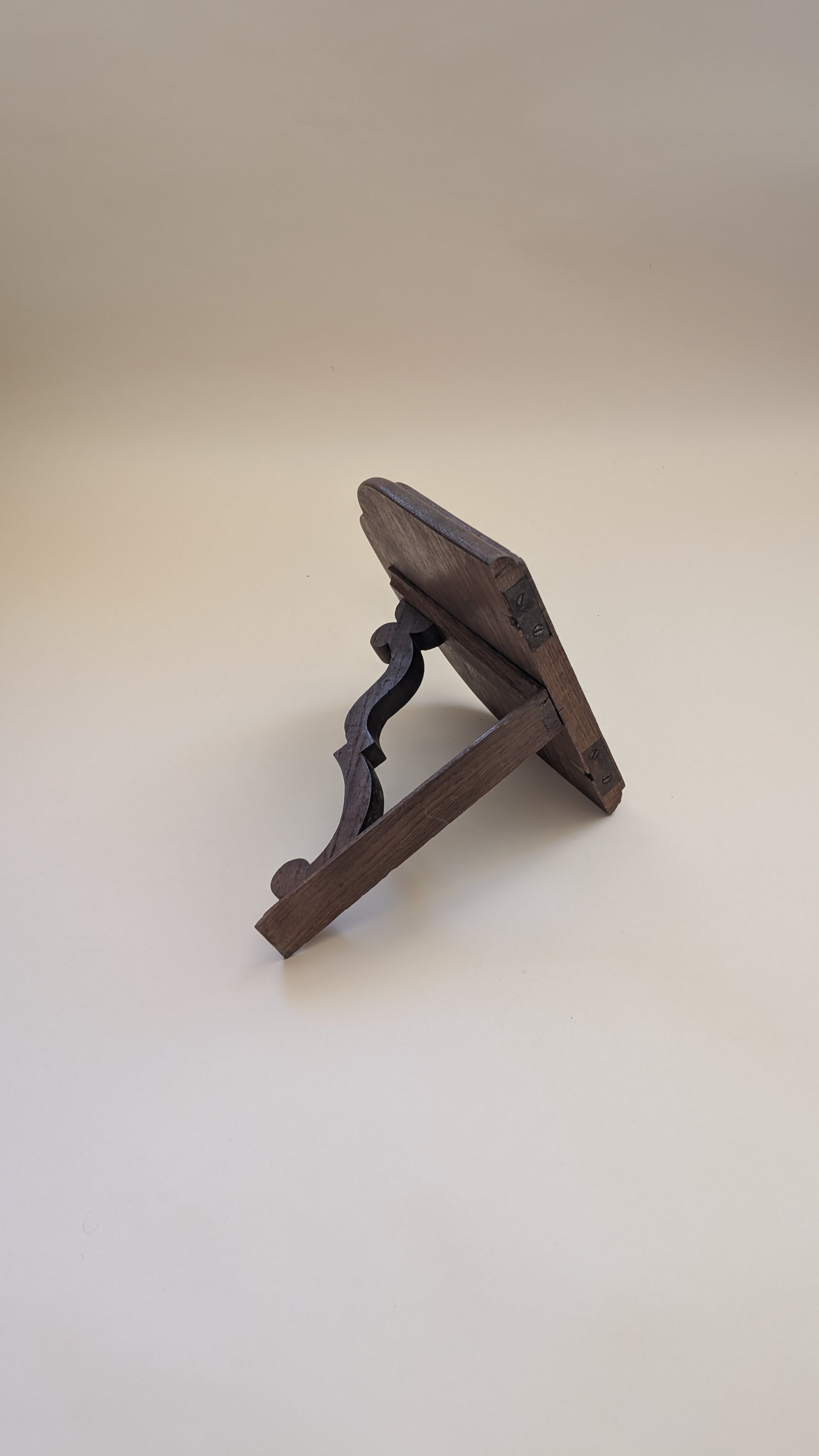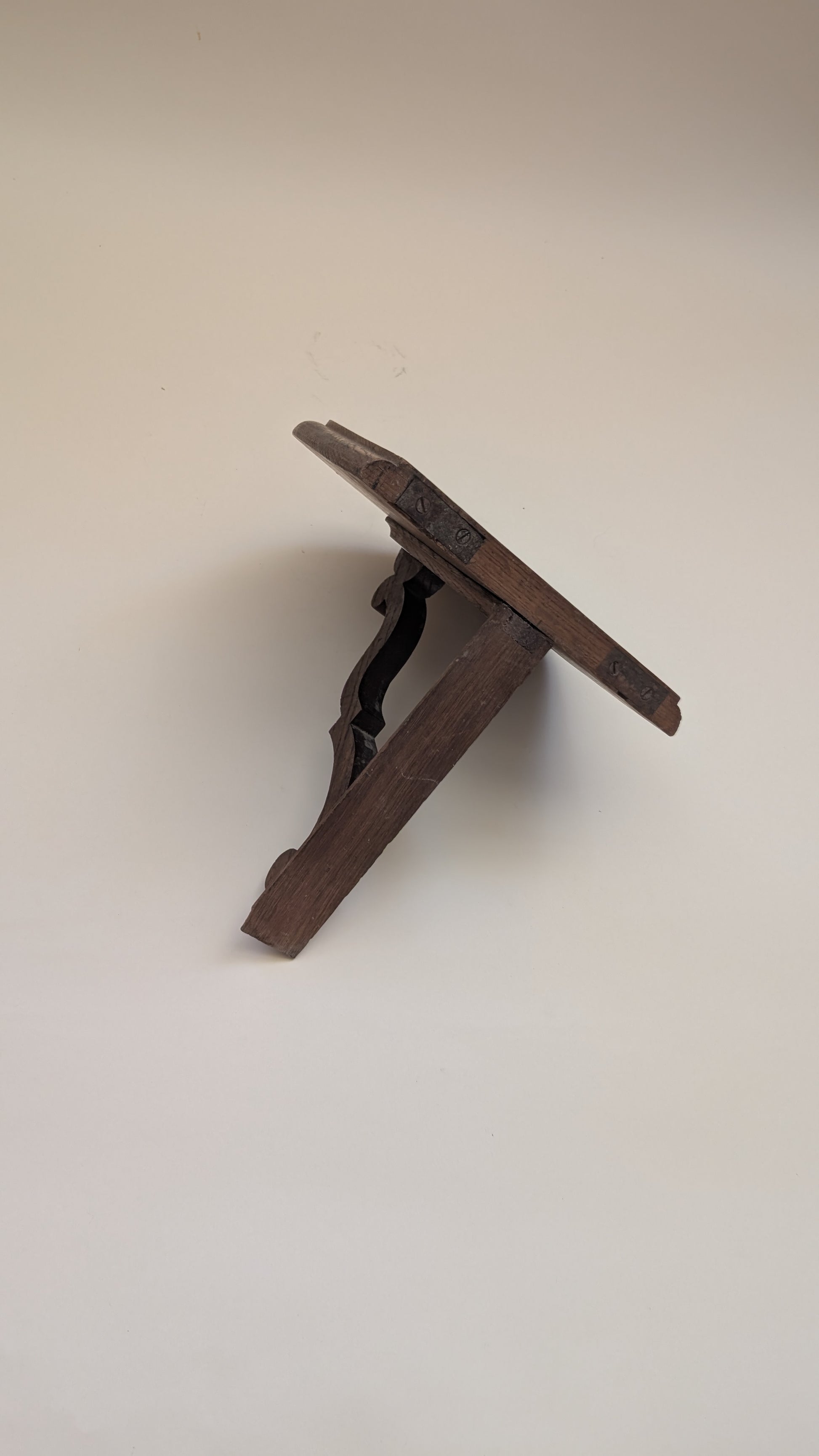 Étagère en bois avec un pied sculpté. Hauteur 29 cm, dimension du plateau 29 x 26,5 cm. Poids 1,300 gr.