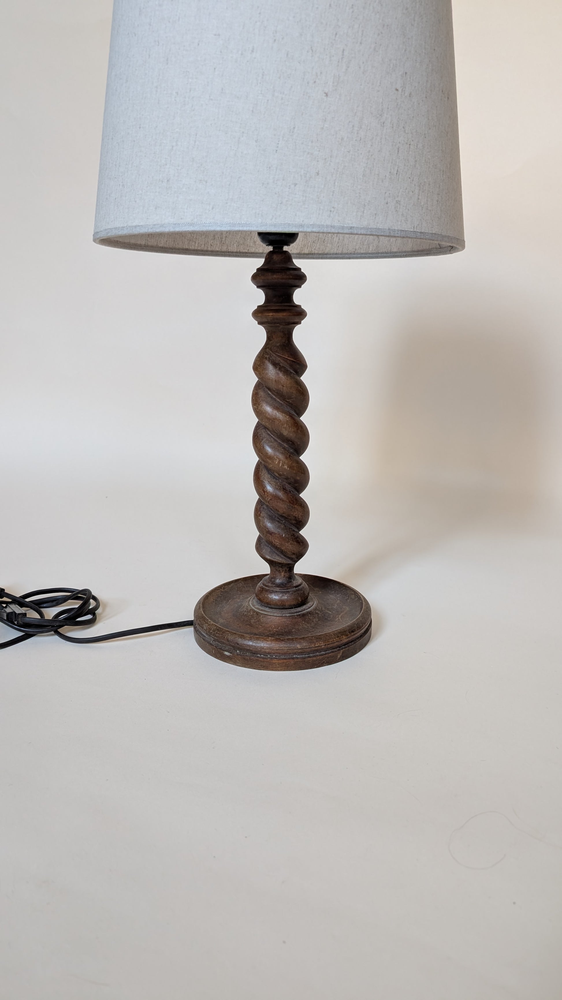 Lampe de table en bois torsadé. Son pied en bois foncé, sculpté d'une magnifique torsade en spirale (style "Barley Twist" ou colonne salomonique), est caractéristique des meubles classiques.