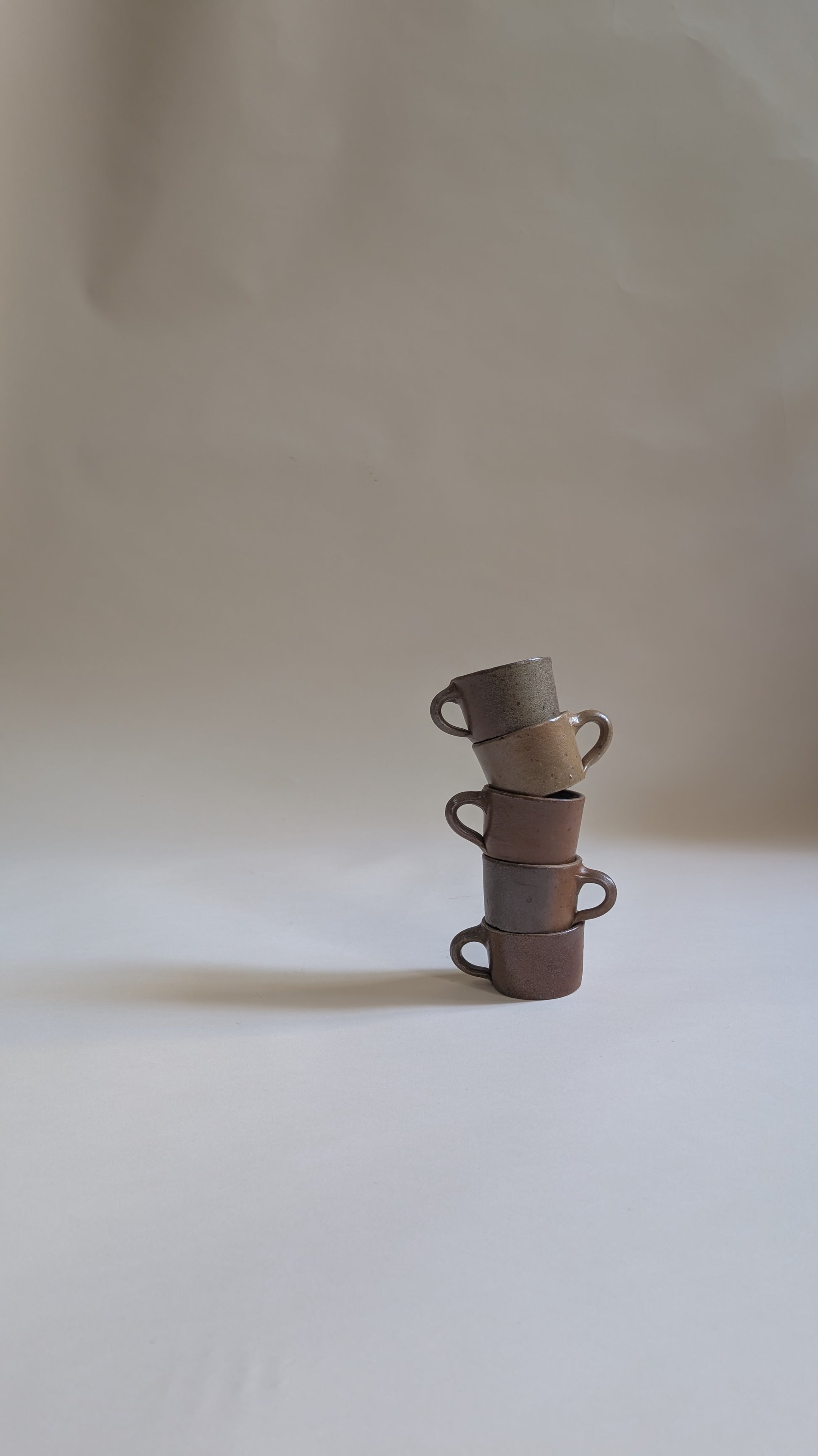 Ensemble de cinq tasses en grès, aux tons chaleureux marron, parfaites pour le café. Leur texture artisanale et leur forme simple apportent une touche authentique et conviviale à votre table ou à votre coin café.