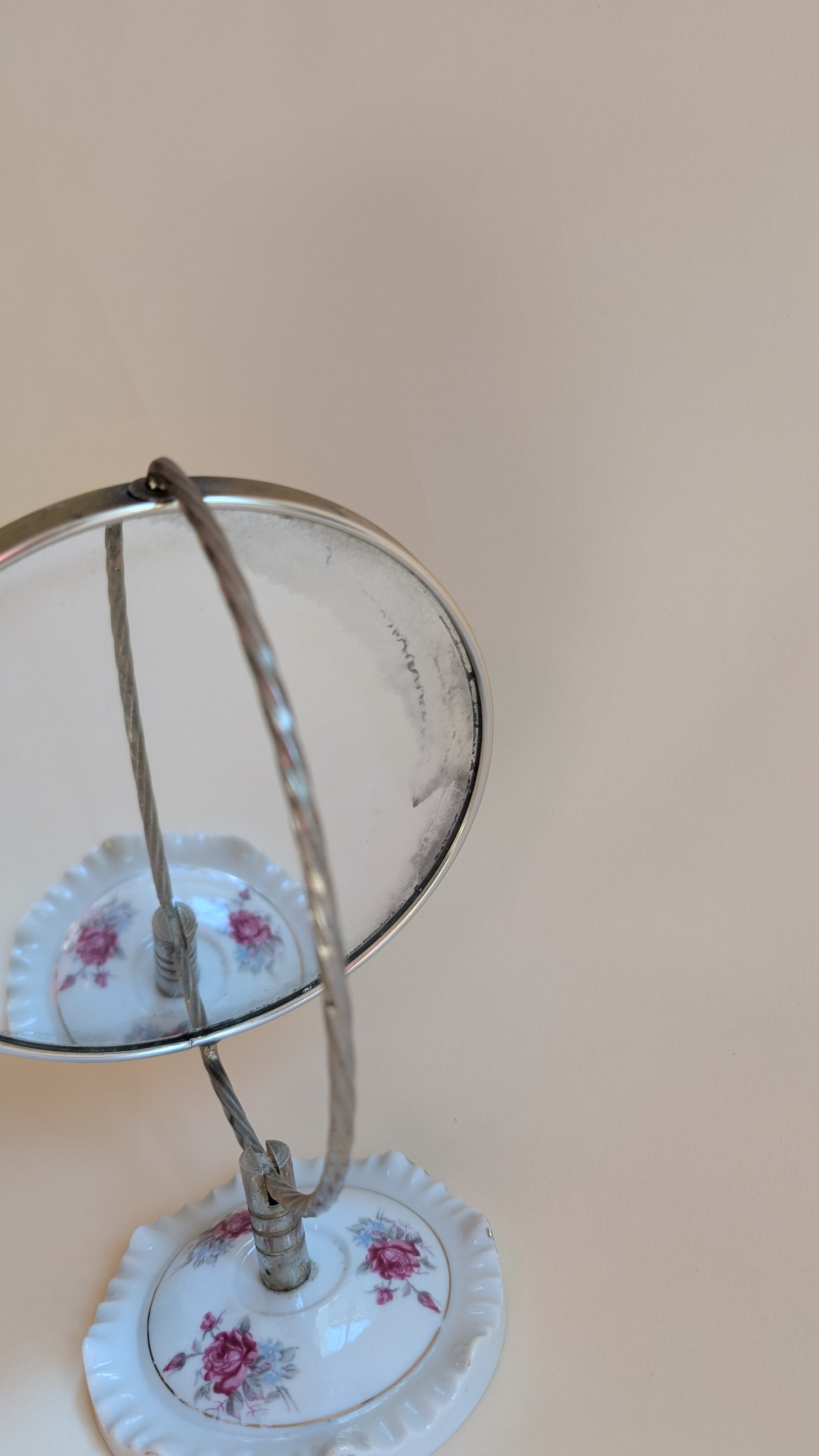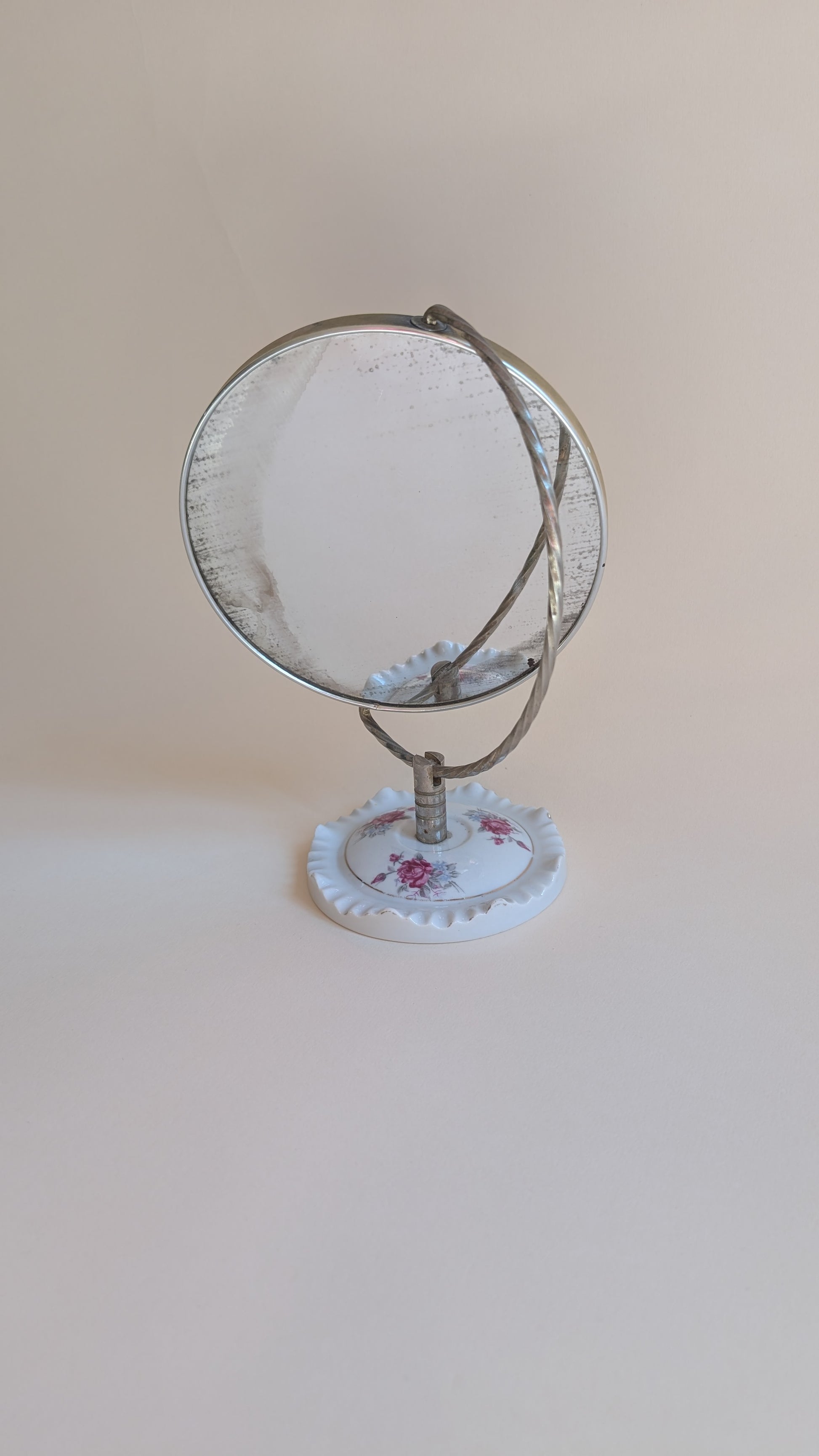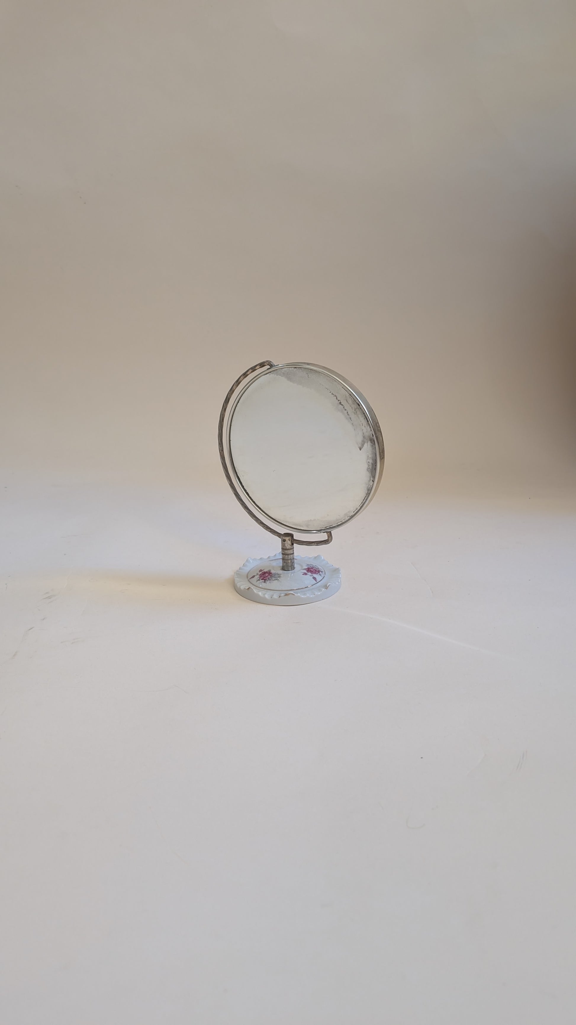 Miroir pivotant avec pied en céramique, dans son jus. Miroir légèrement piqué.