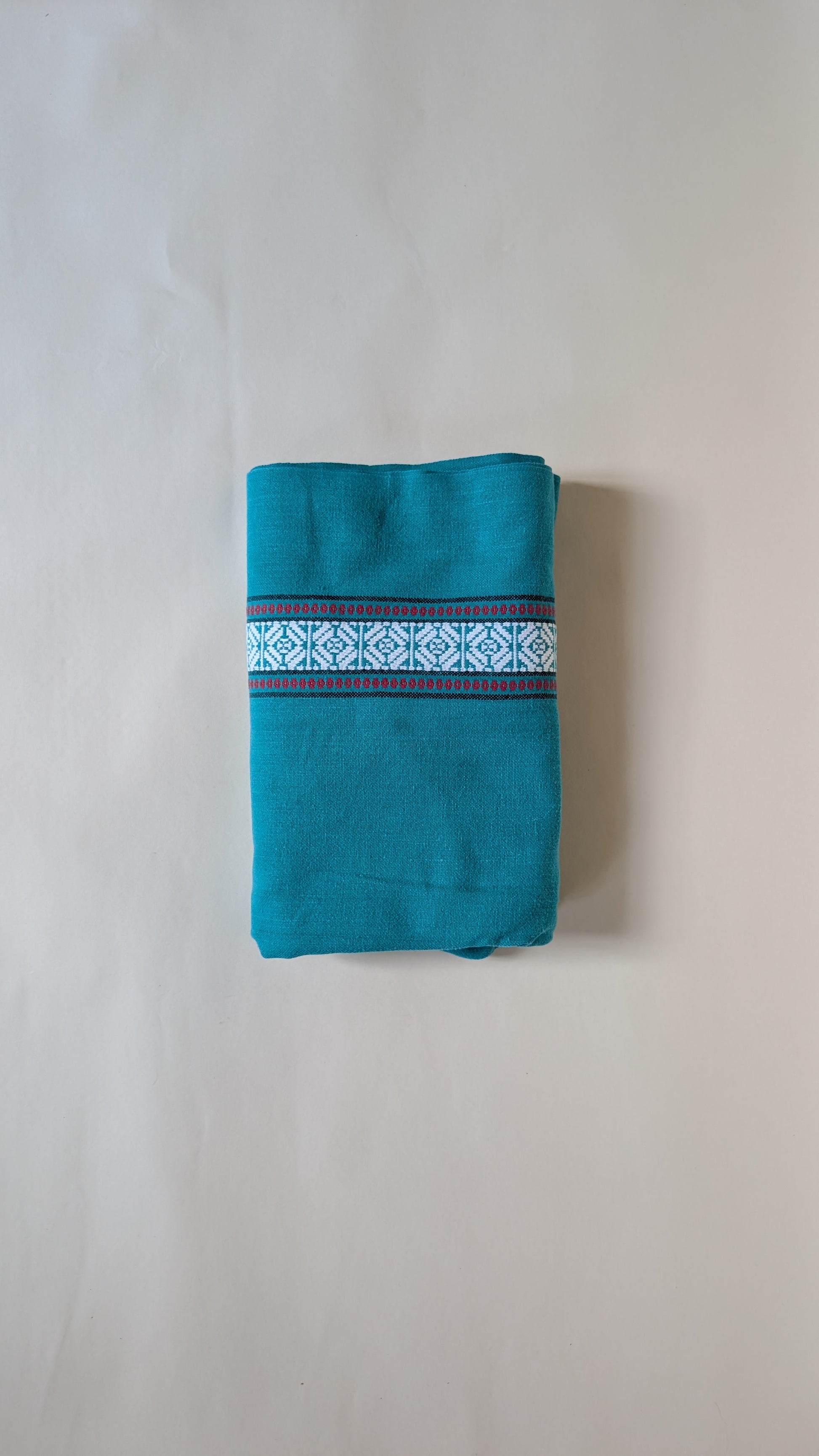 Nappe vert canard intense. Elle est ornée d'une bande tissée centrale à motifs géométriques ethniques en blanc, noir et rouge.