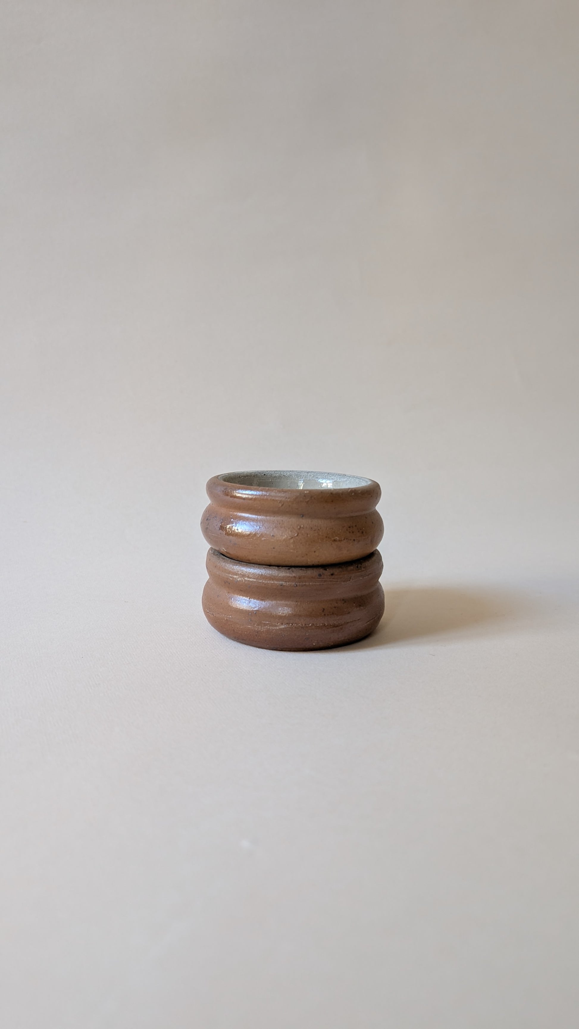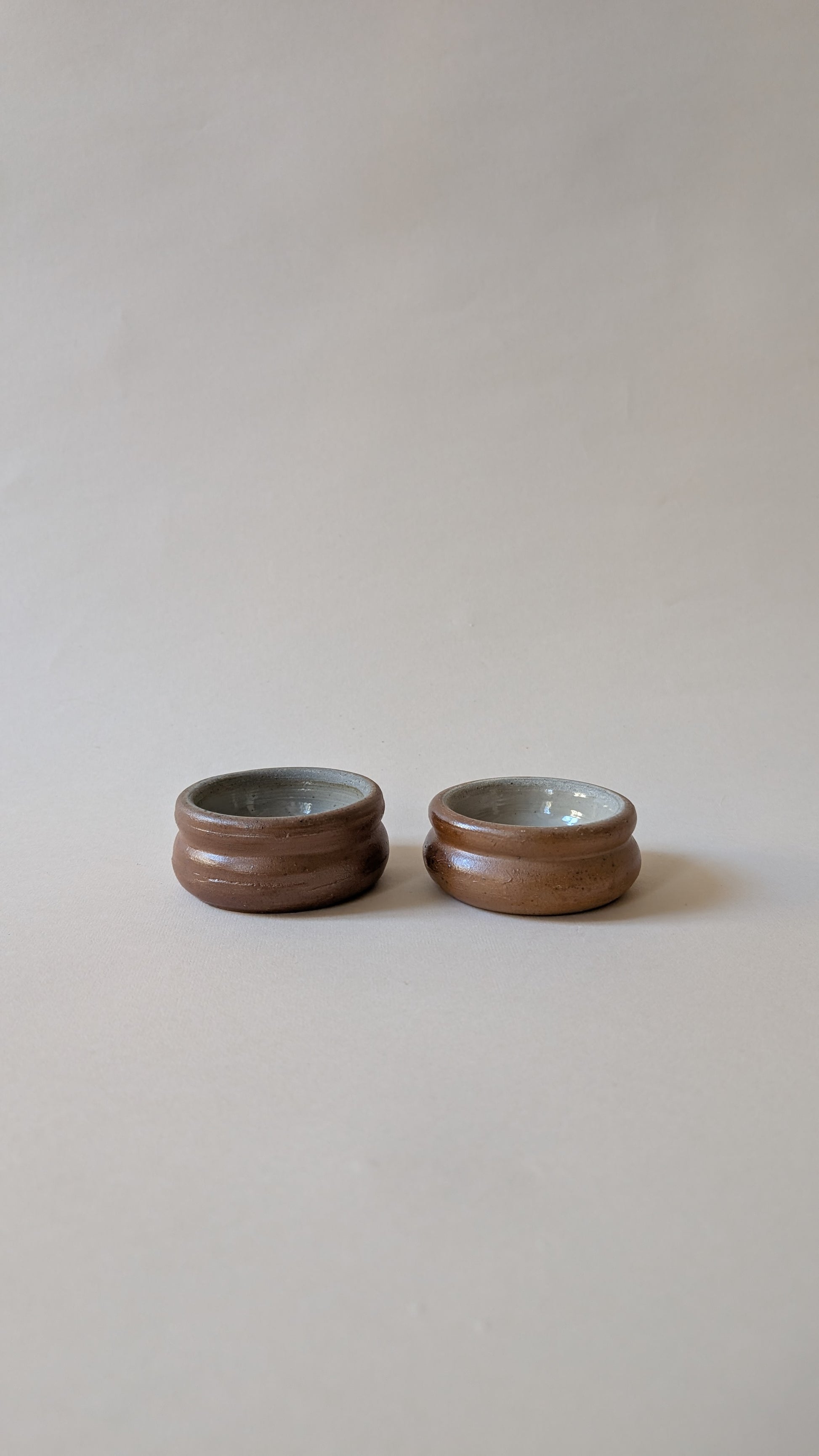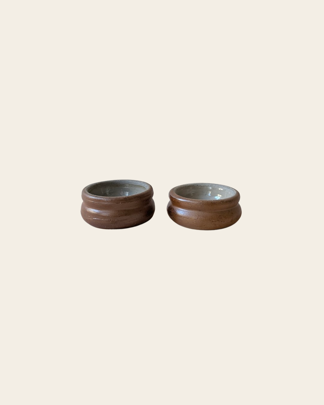 Paire de petites coupelles en grès, au design simple et chaleureux, avec une base légèrement galbée et un intérieur émaillé clair. Leur format compact les rend idéales pour les sauces, épices ou petites portions.