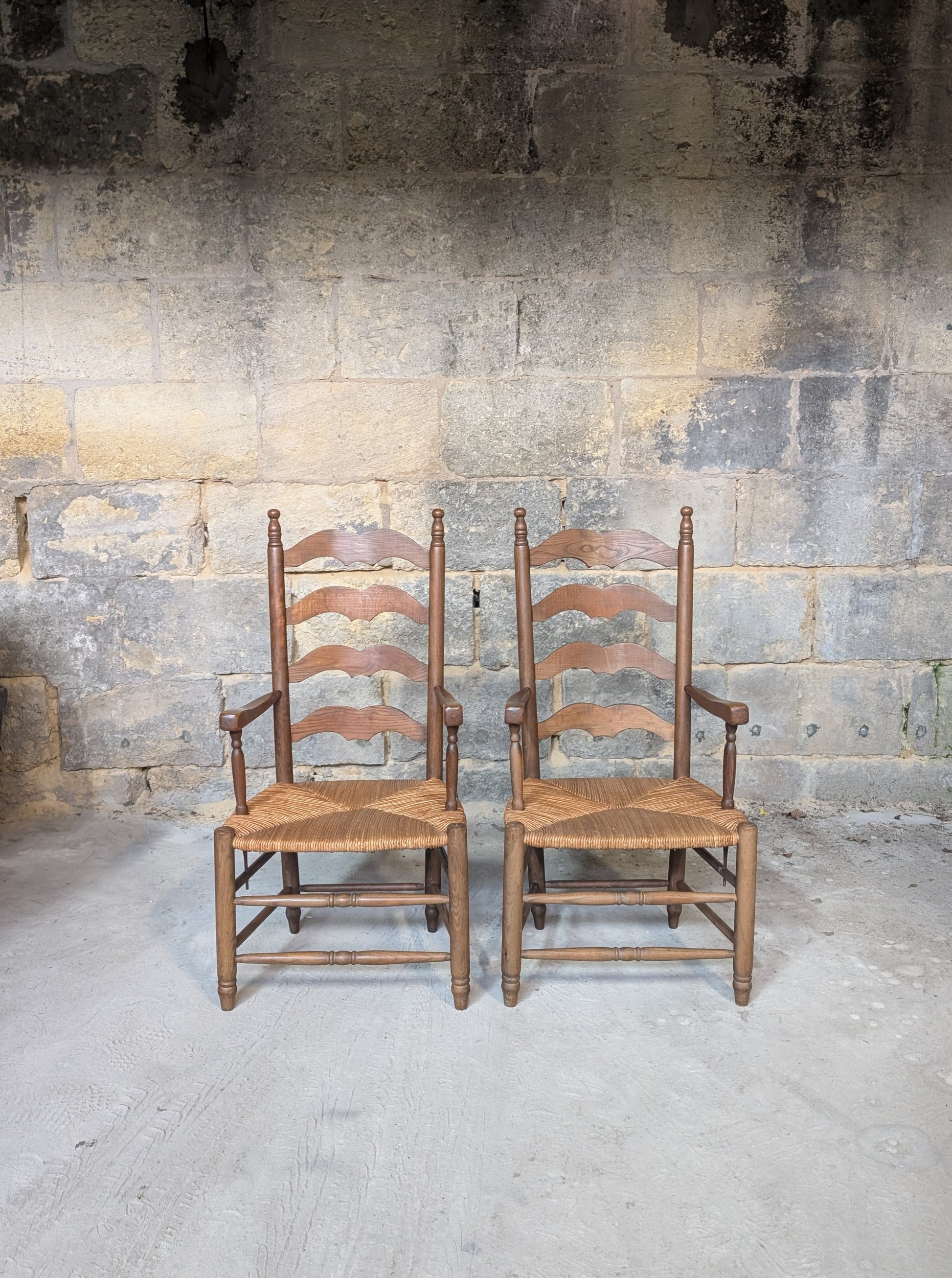 Paire de fauteuils en bois avec assise paillée, parfaits pour apporter une touche rustique et chaleureuse à votre intérieur.