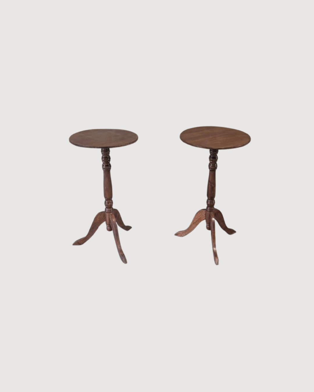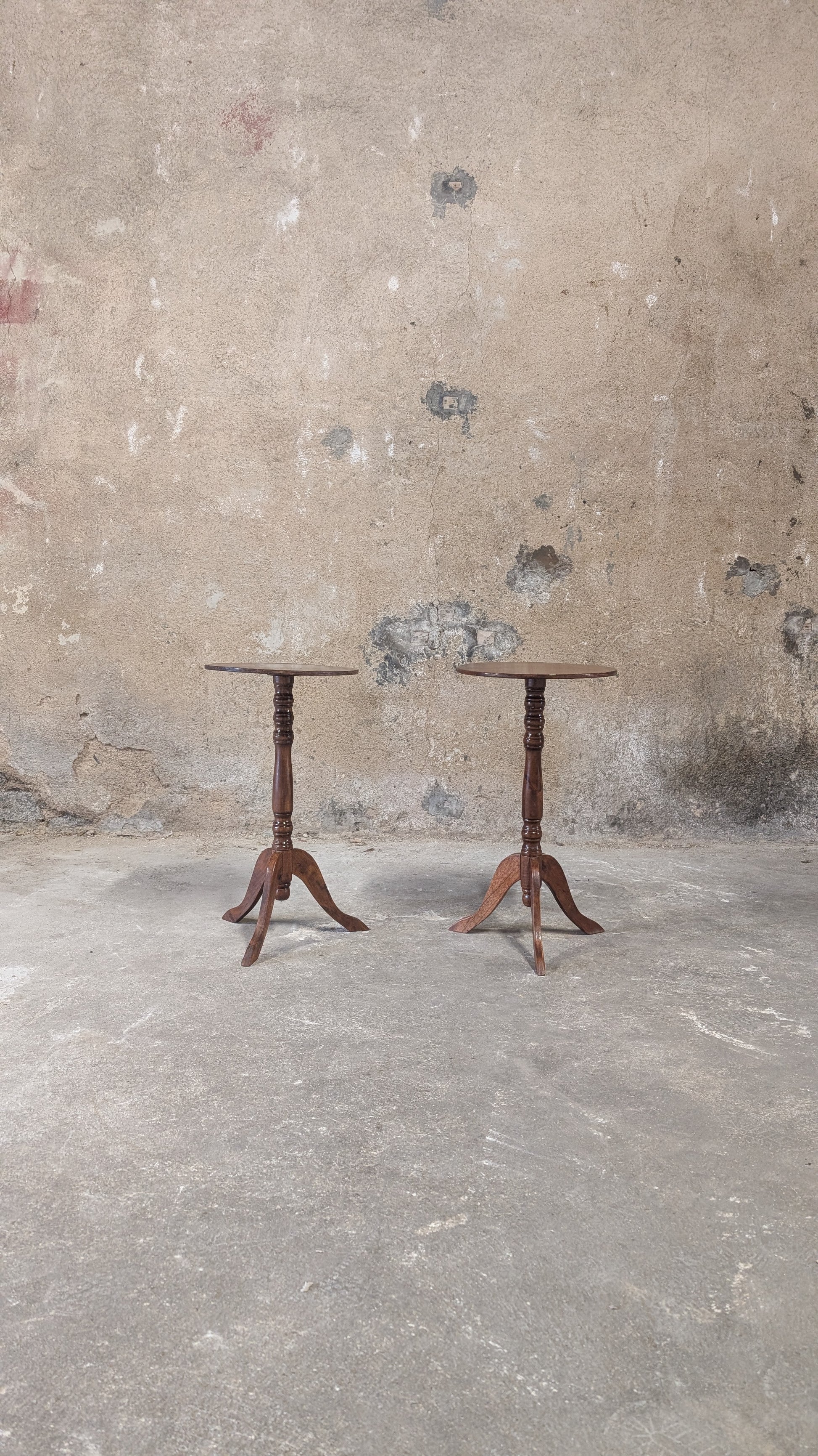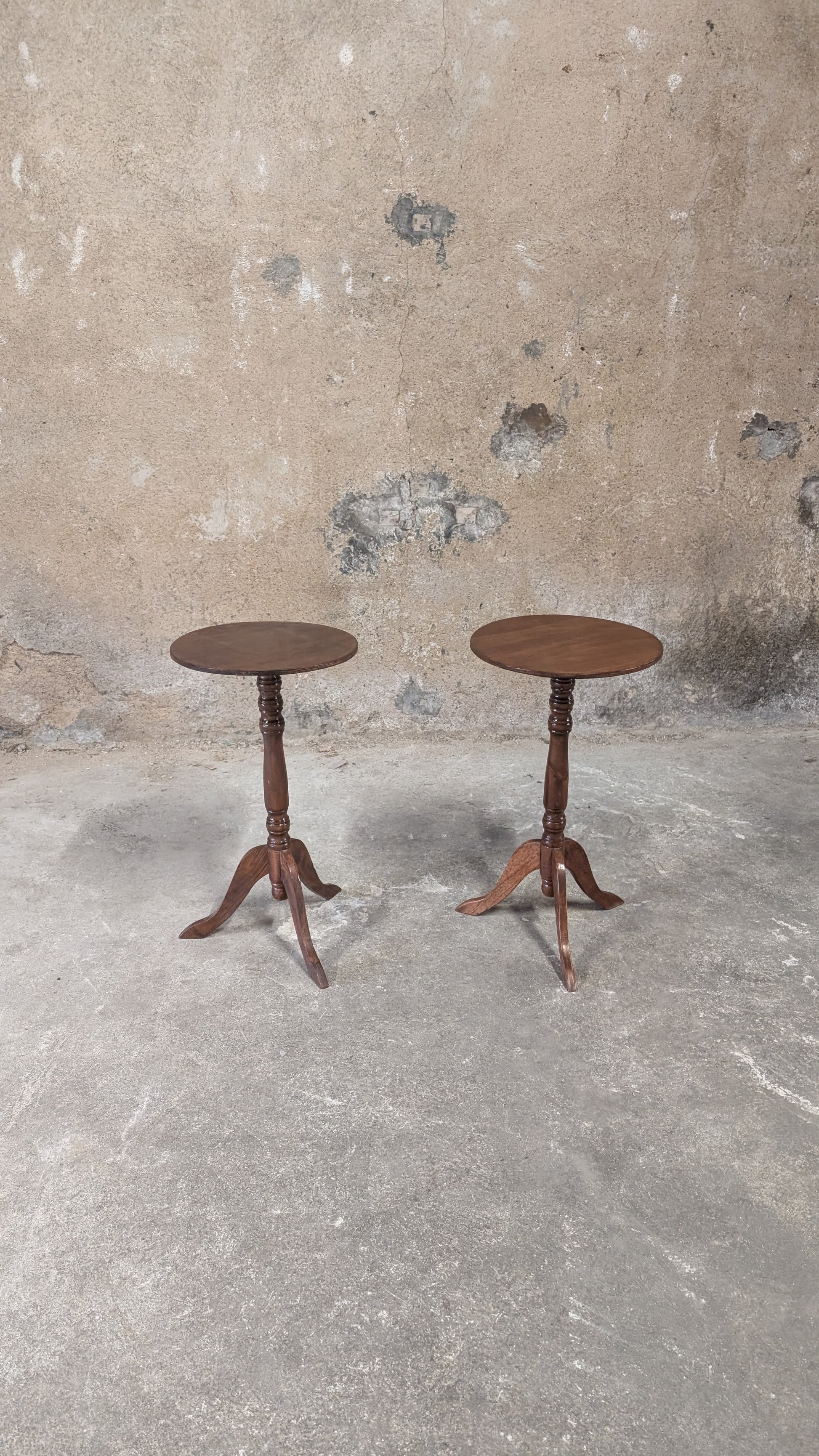 Paire de guéridons en bois, élégants et en bon état. Parfaits comme table d'appoint, supports pour plantes, lampes ou objets déco. Hauteur 53,5 cm, diamètre du plateau 29 cm.