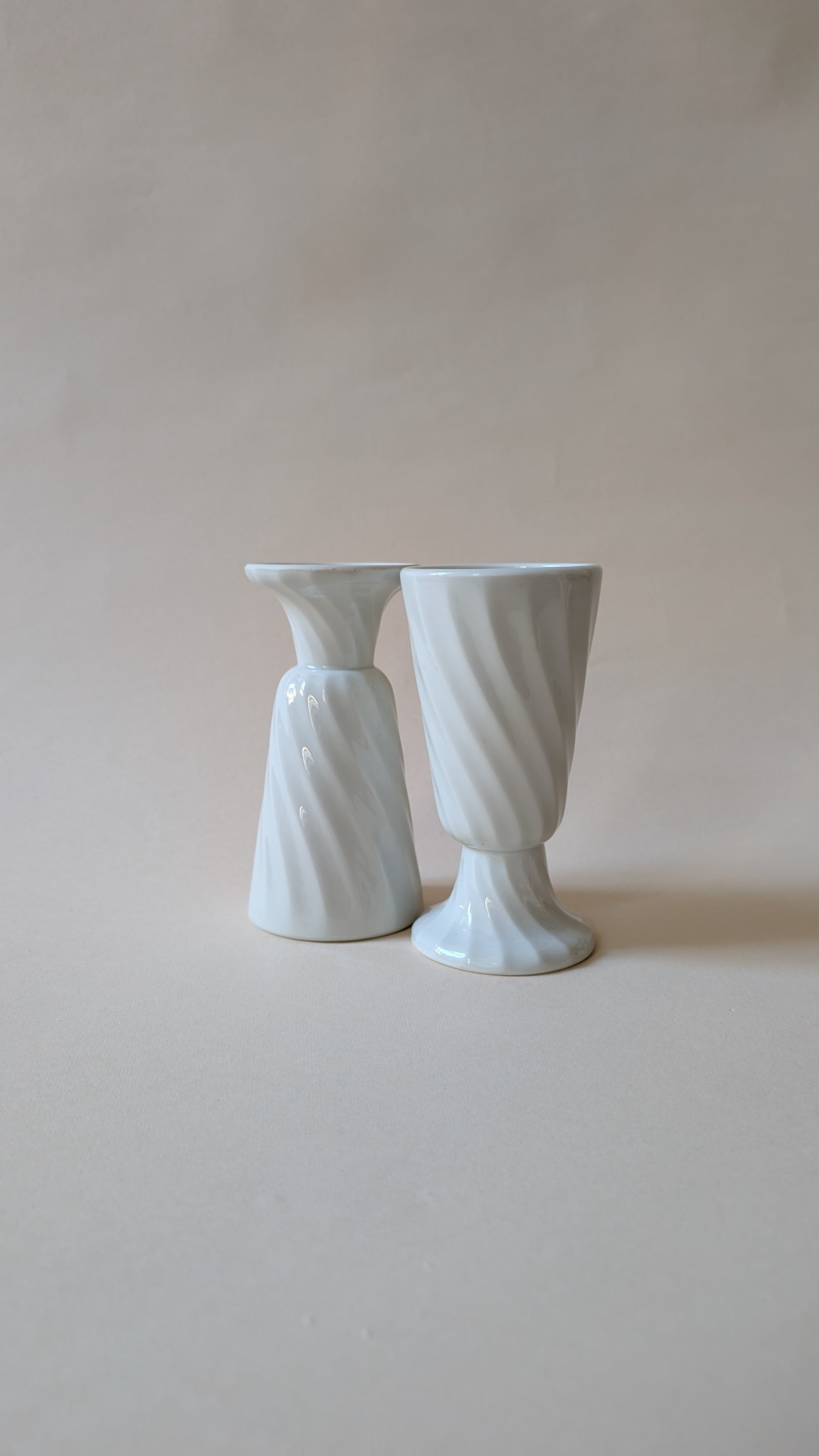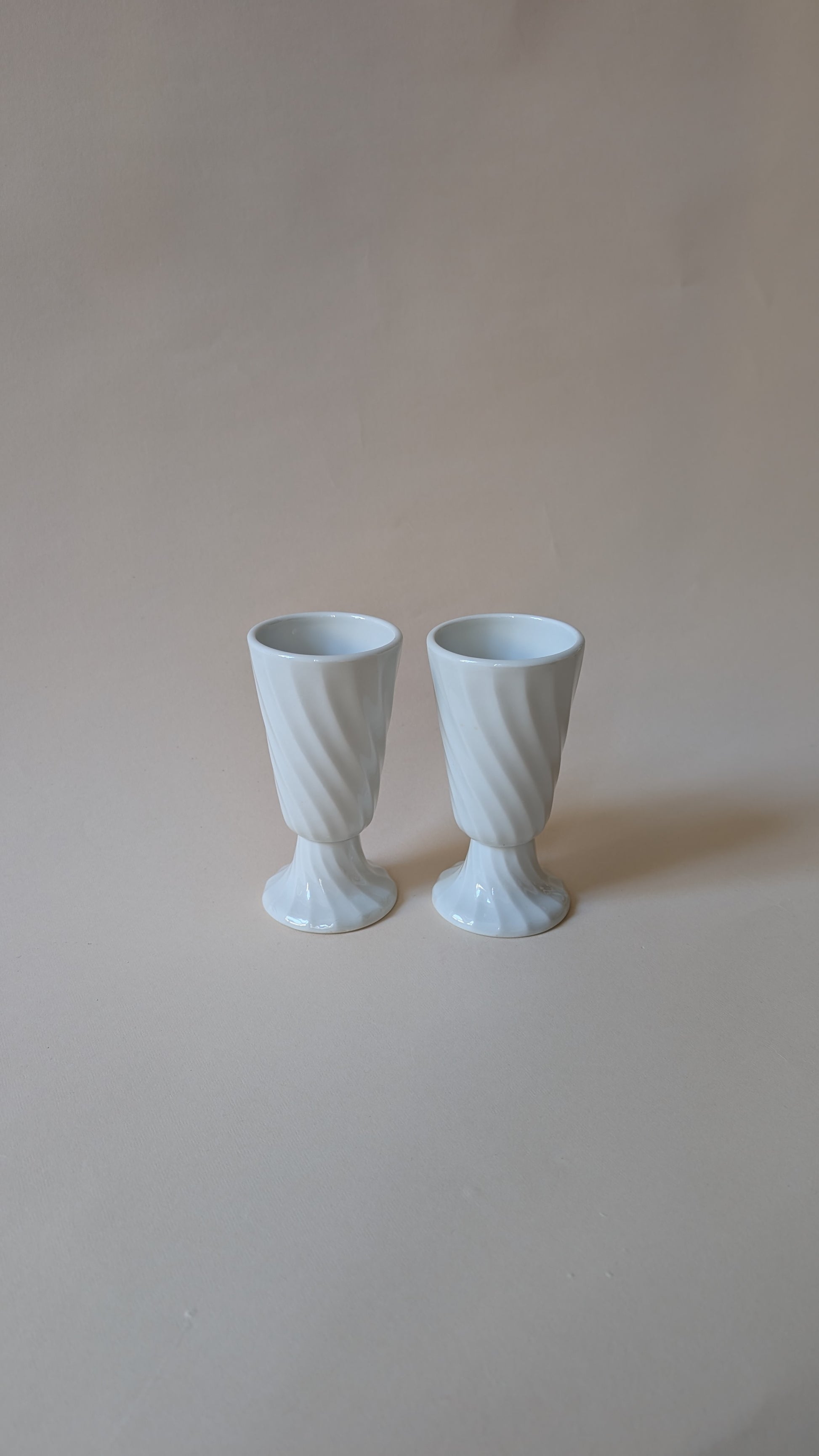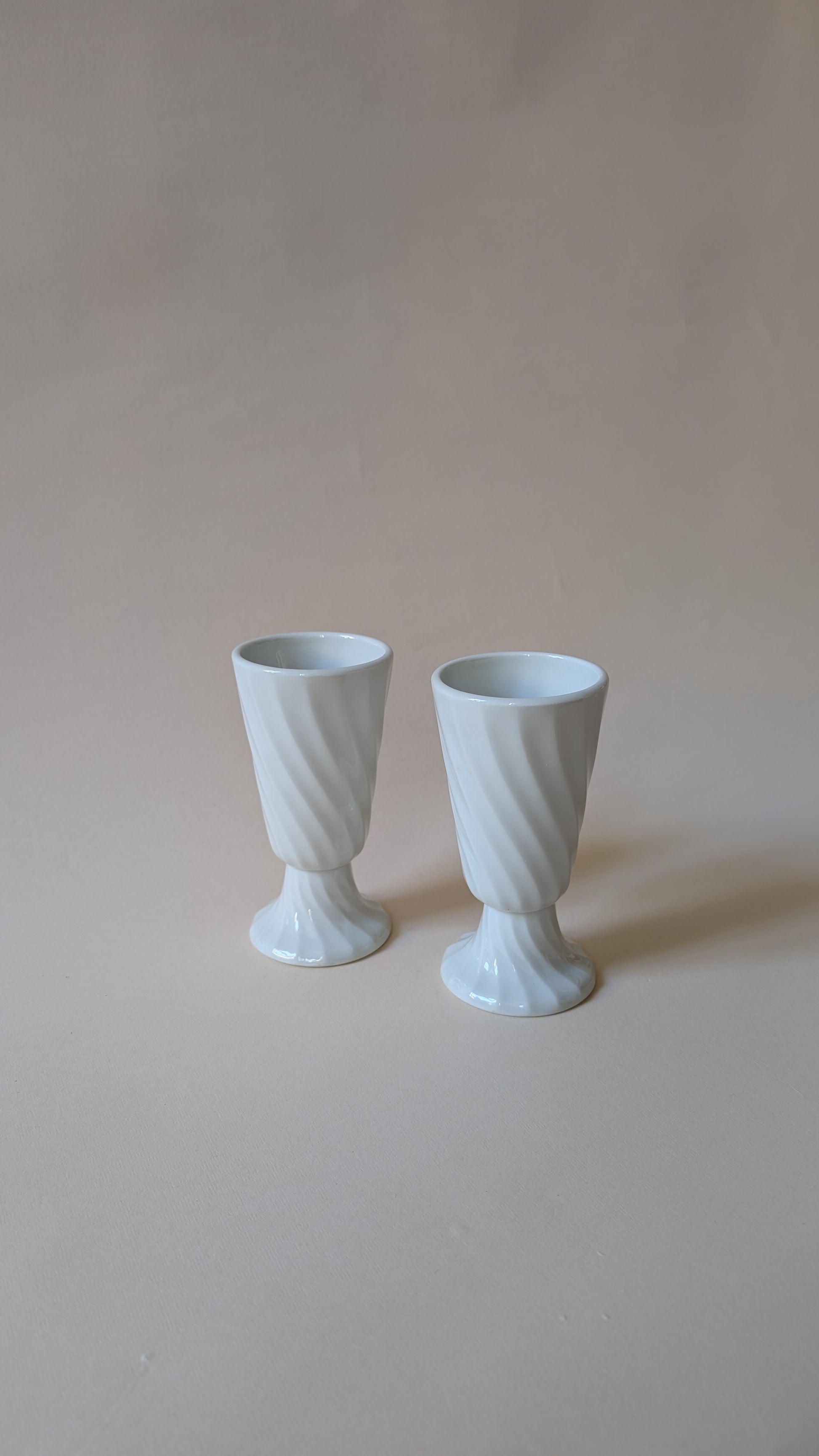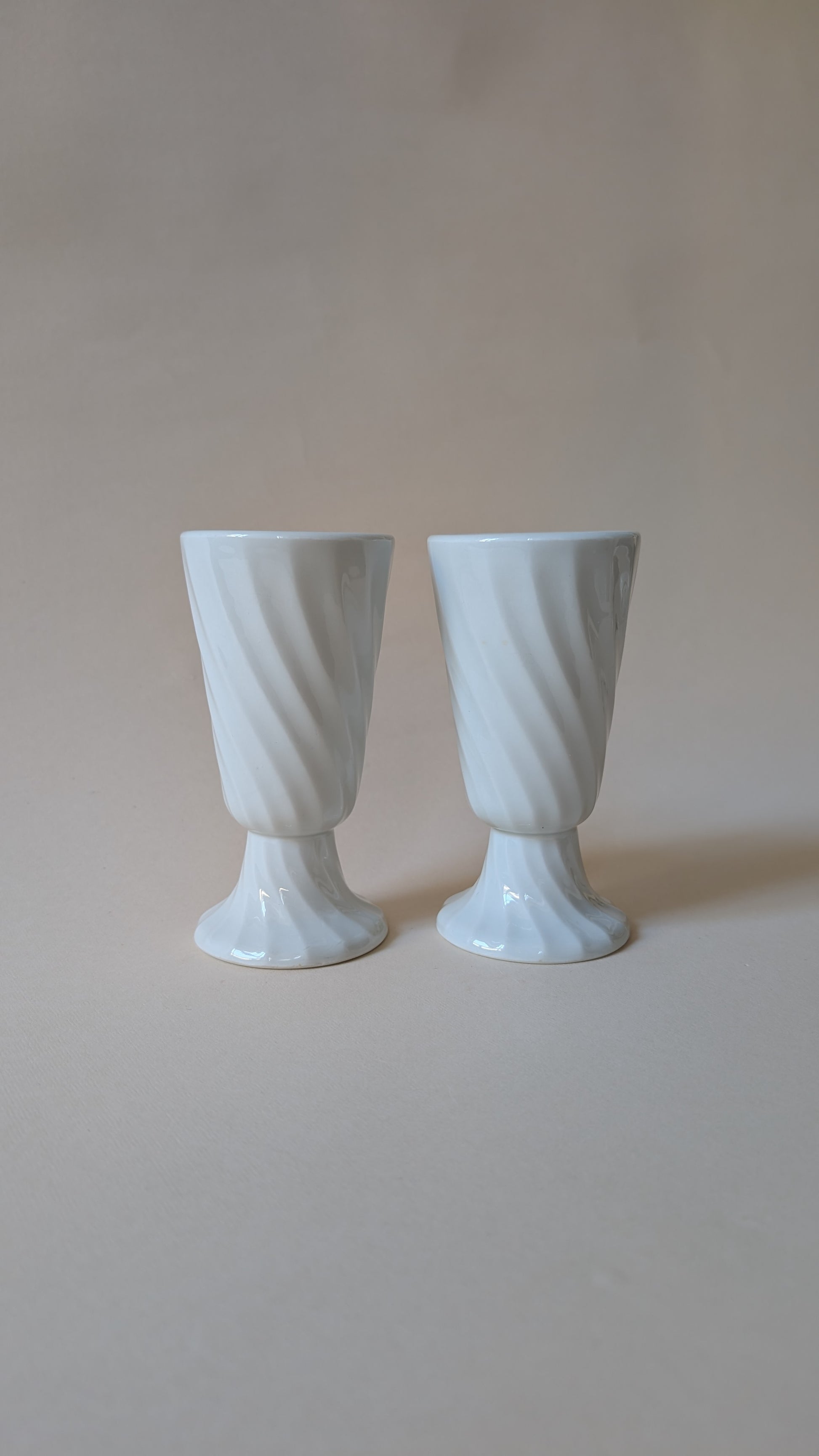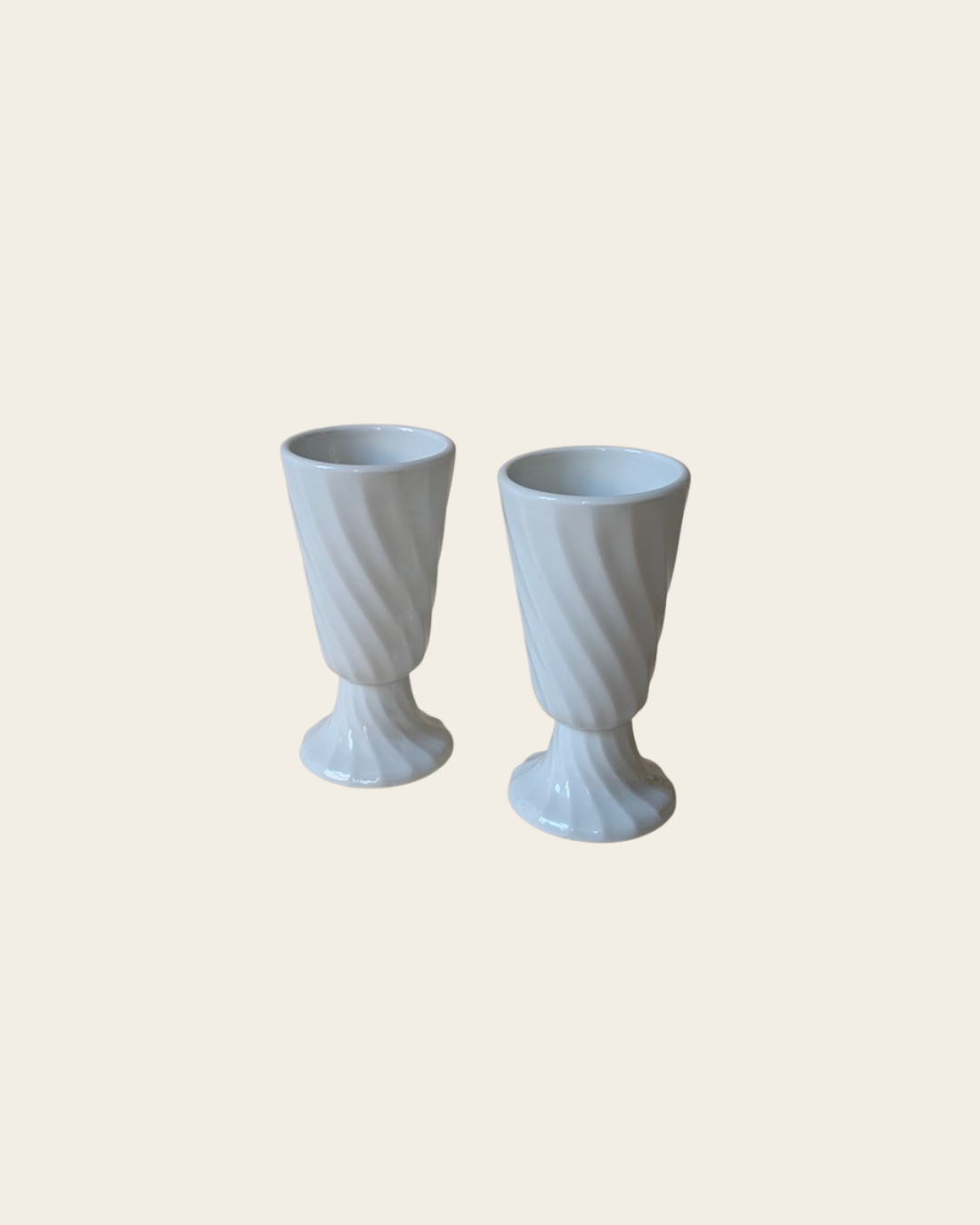 Paire de mazagrans en céramique blanche, au joli relief torsadé qui leur donne une allure raffinée et vintage. Ils mesurent environ 14 cm de hauteur pour 7 cm de diamètre. L’ensemble est en bon état, parfait pour compléter un service ancien ou pour une utilisation décorative. Poids total : 500 g.
