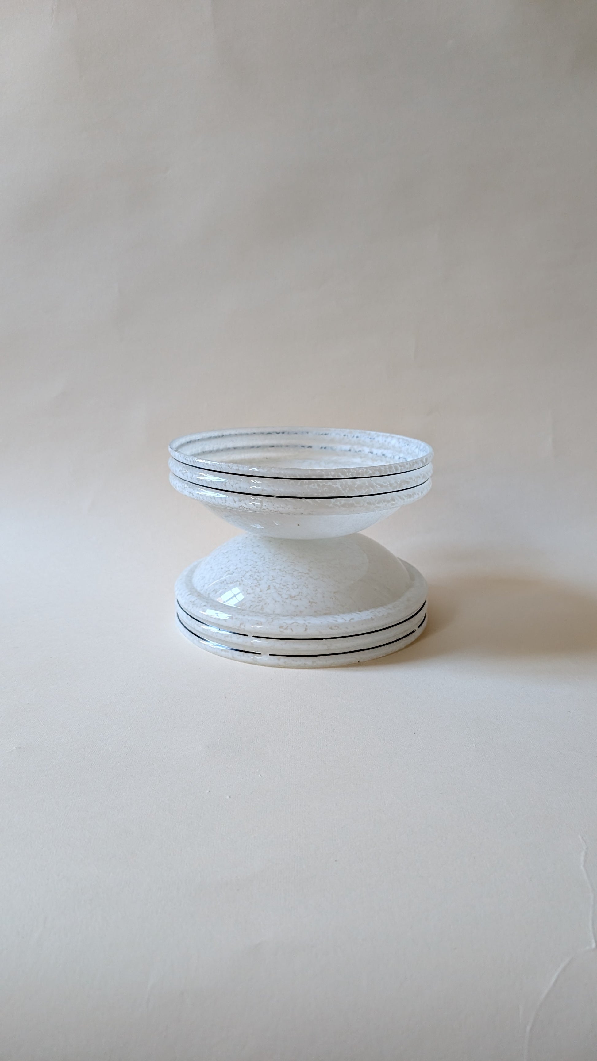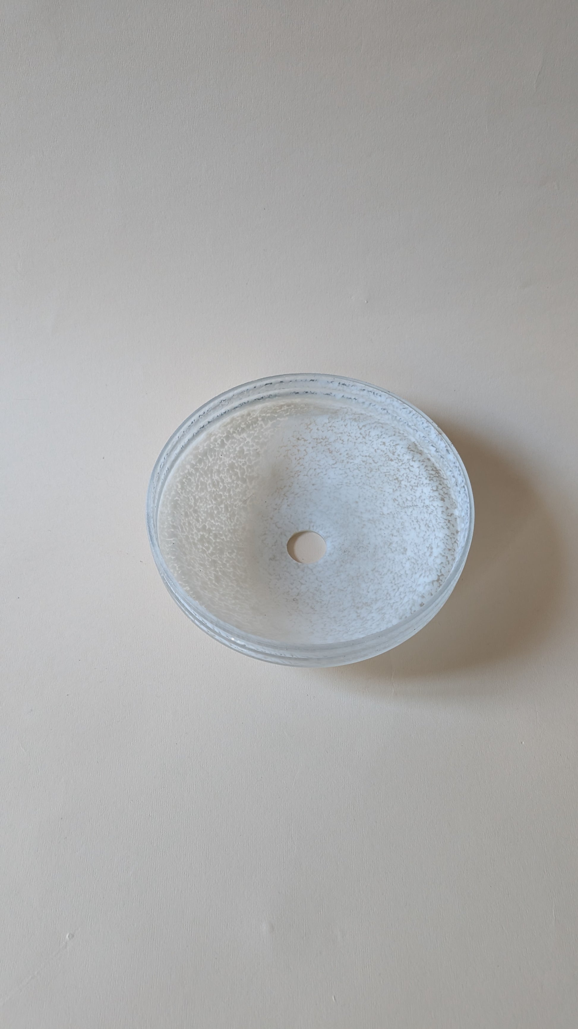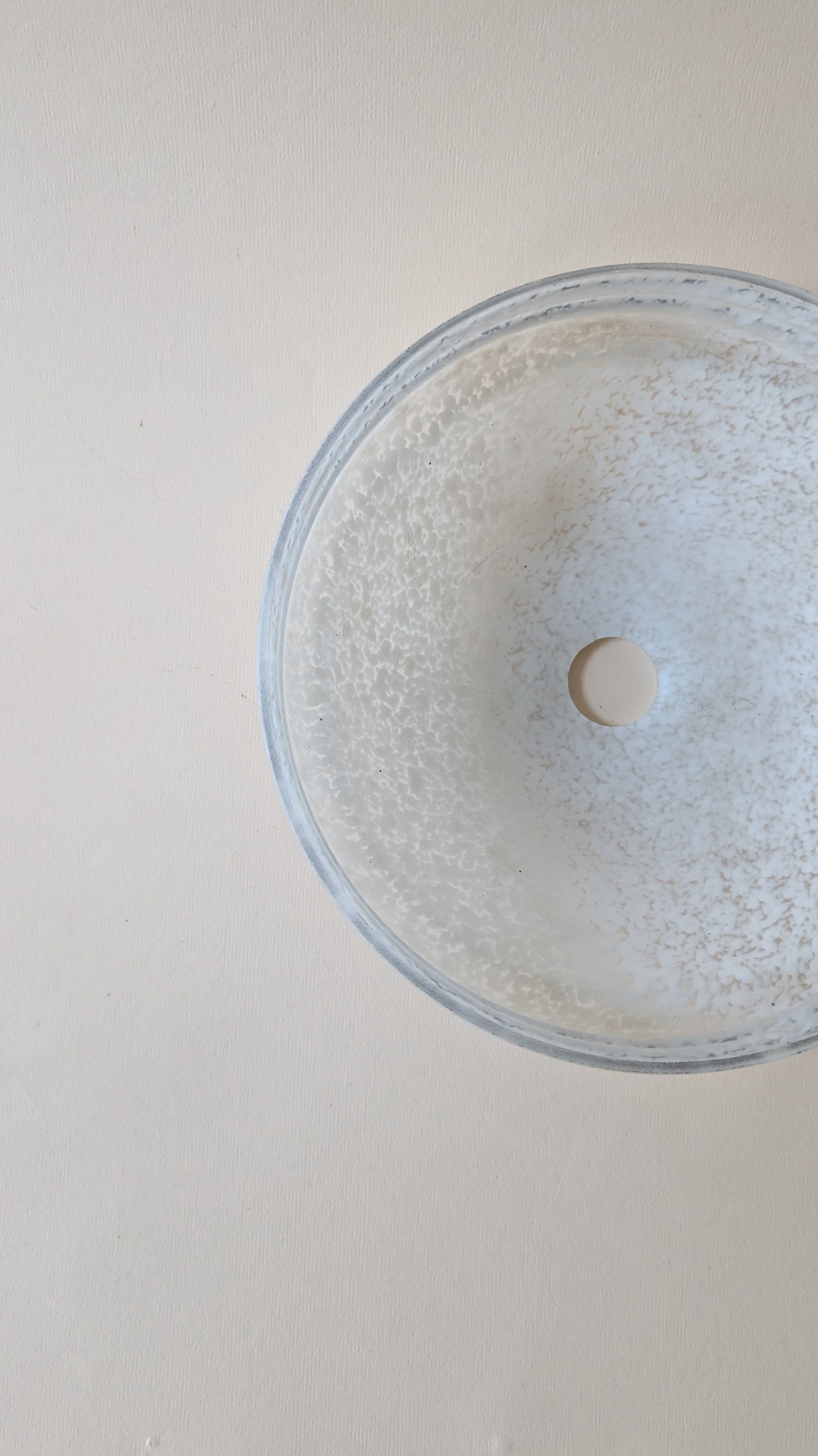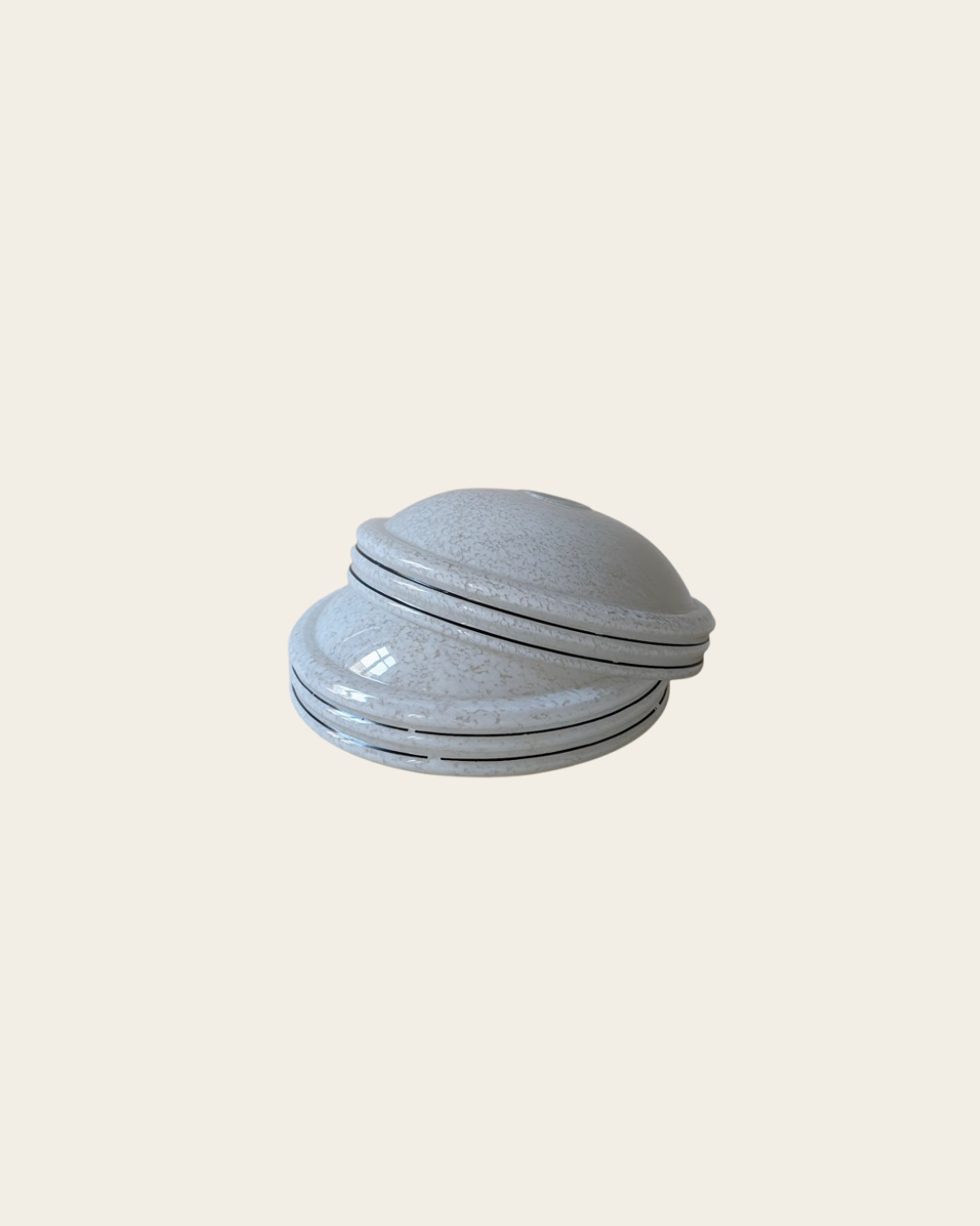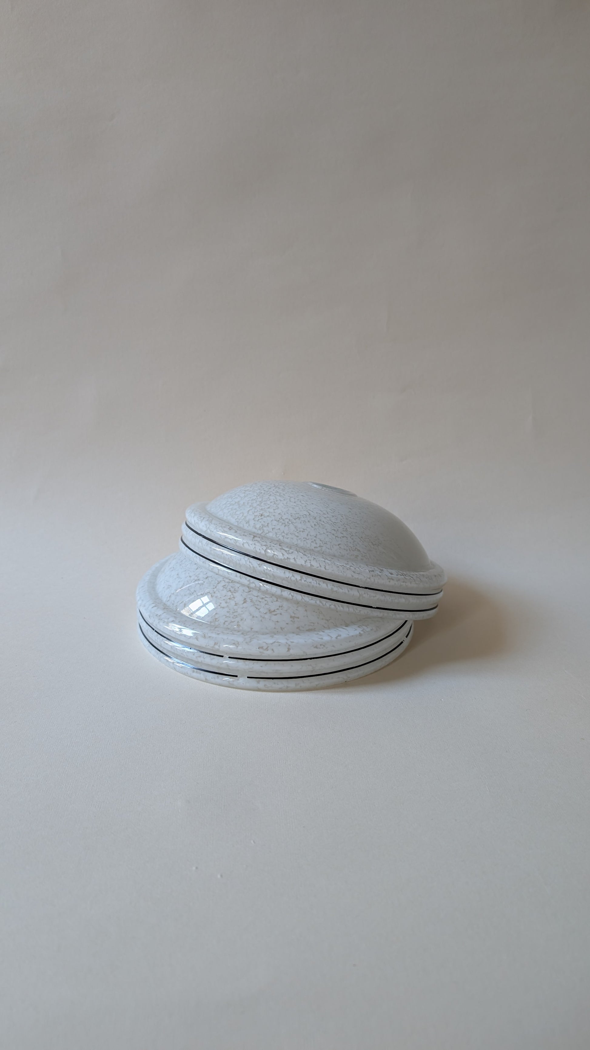 Paire de suspensions Art déco en verre opalin moucheté. Hauteur 7 cm, diamètre 20 cm. Poids total : 1,1 kg. Modèles classiques à lignes fines, idéals pour une ambiance rétro et lumineuse.