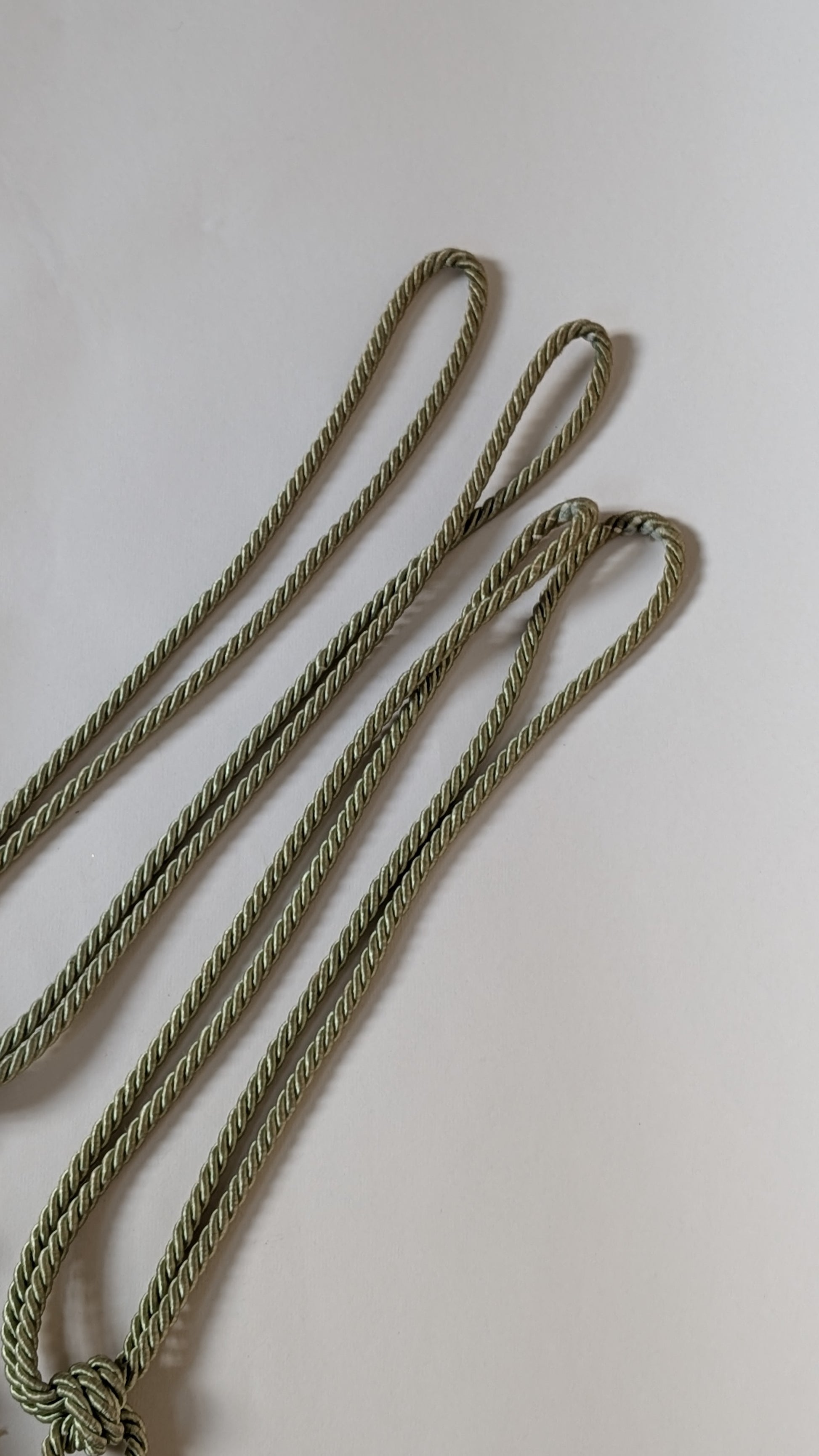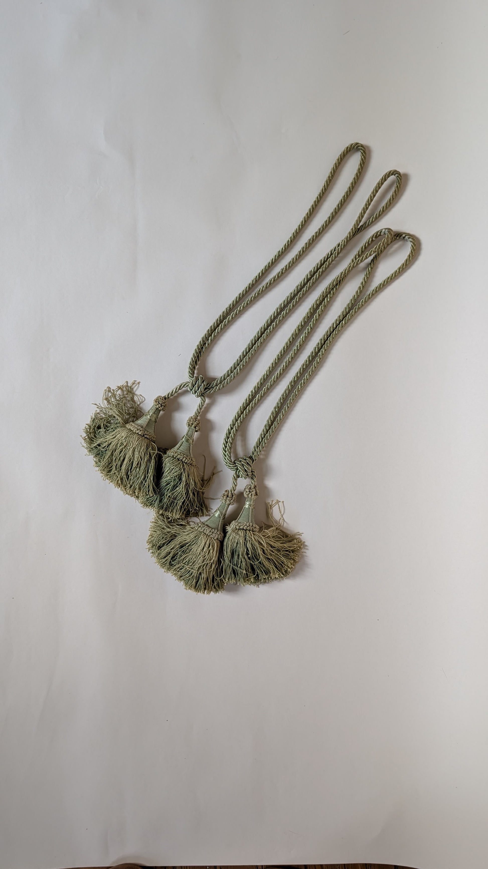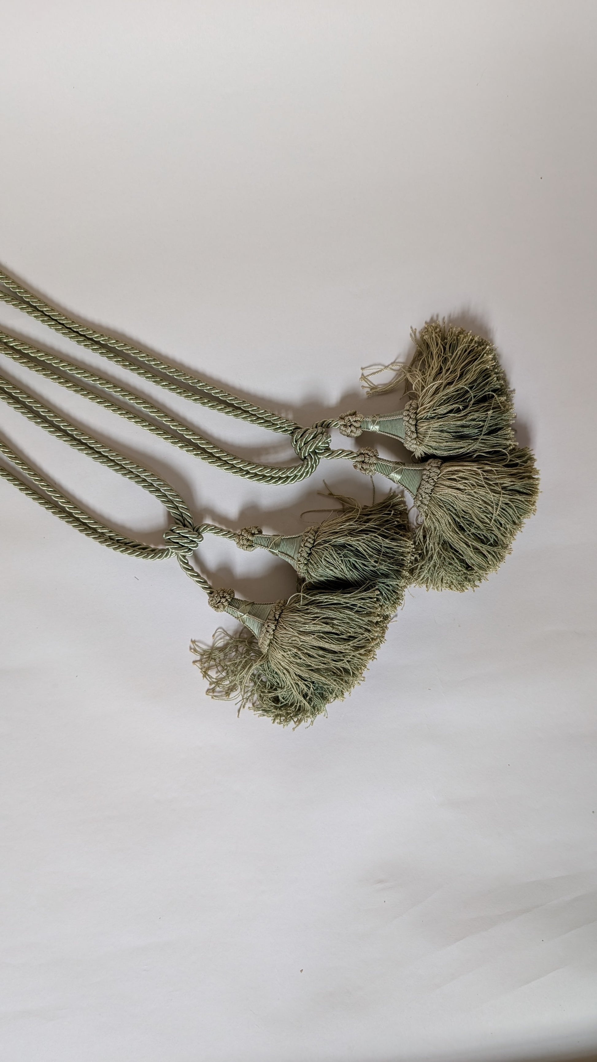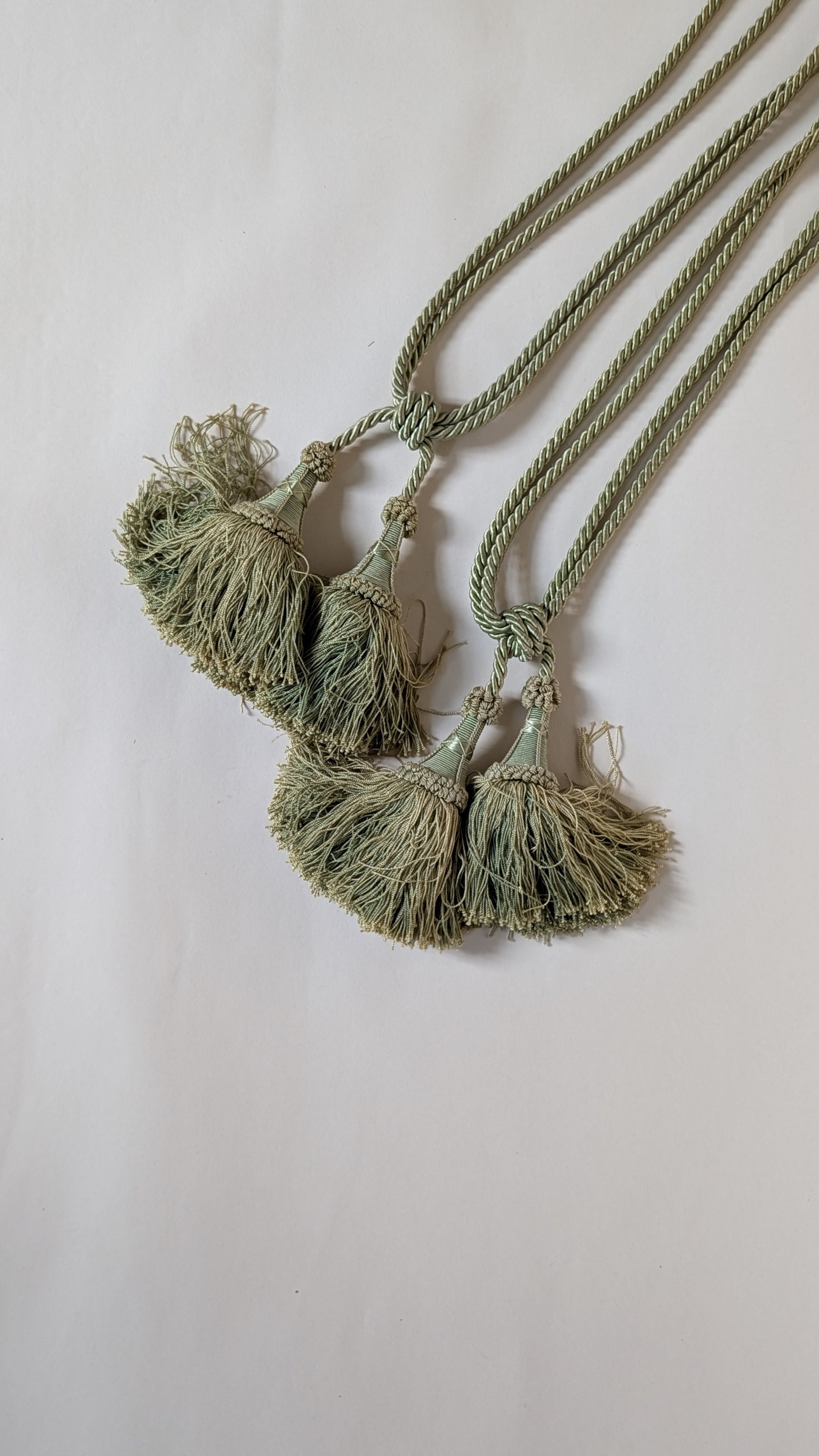 Paire d'embrasses idéales pour draper les rideaux. Elles sont de couleur vert sauge clair et se composent de pompons fournis et d'un cordon tressé. Leur longueur totale est d'environ 60 cm. Elles ajoutent une touche classique et sophistiquée à la décoration de fenêtre.