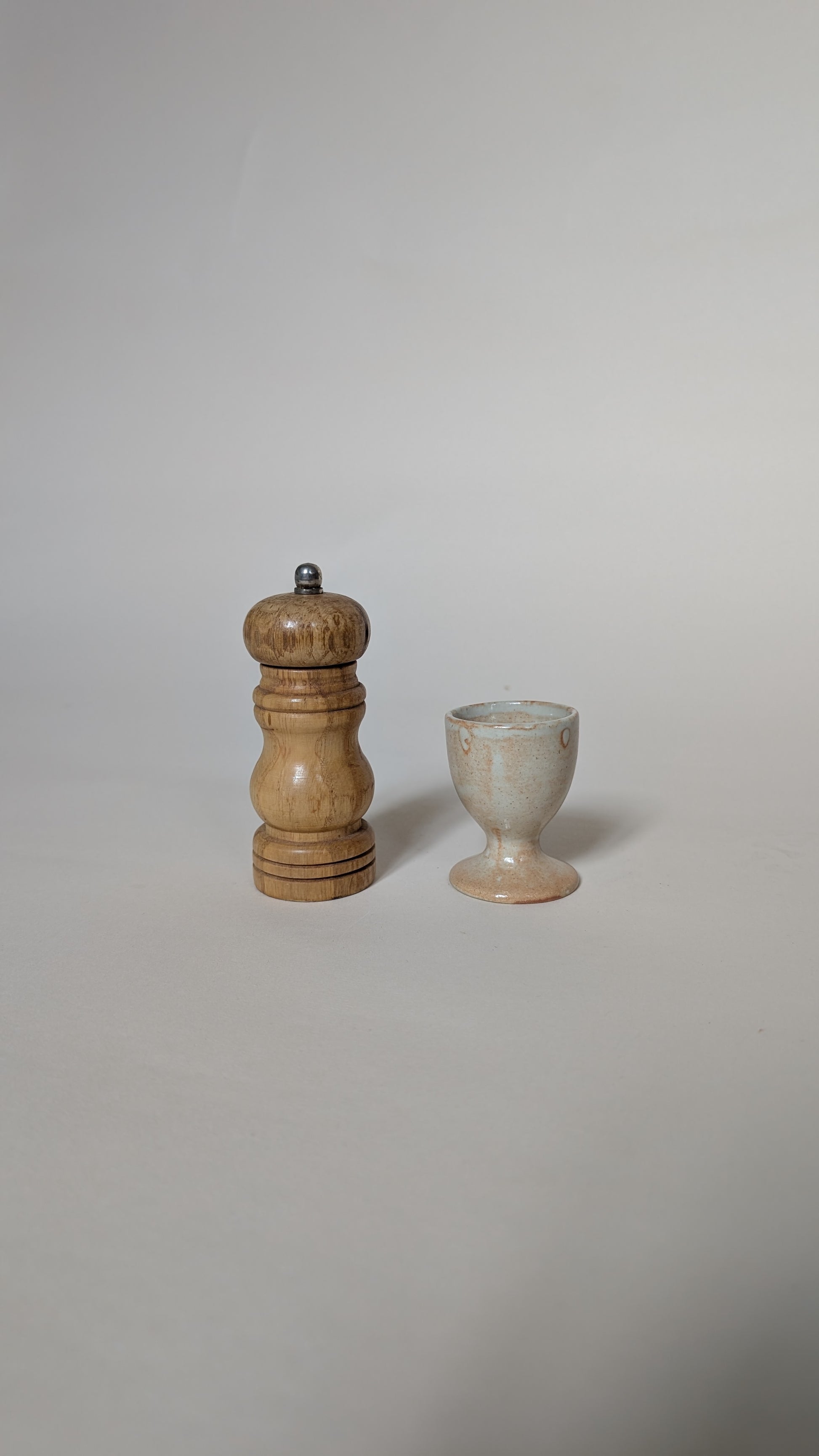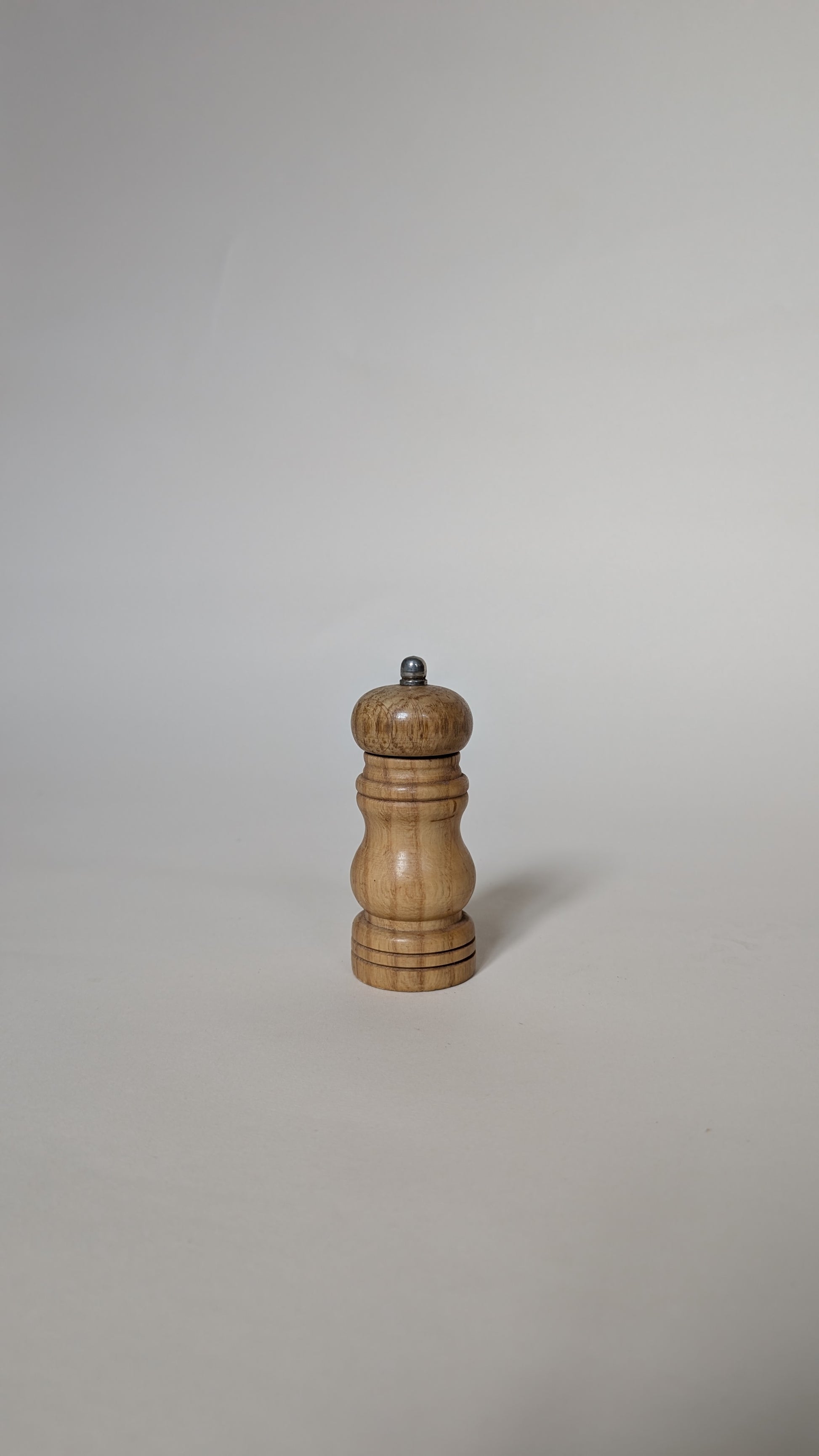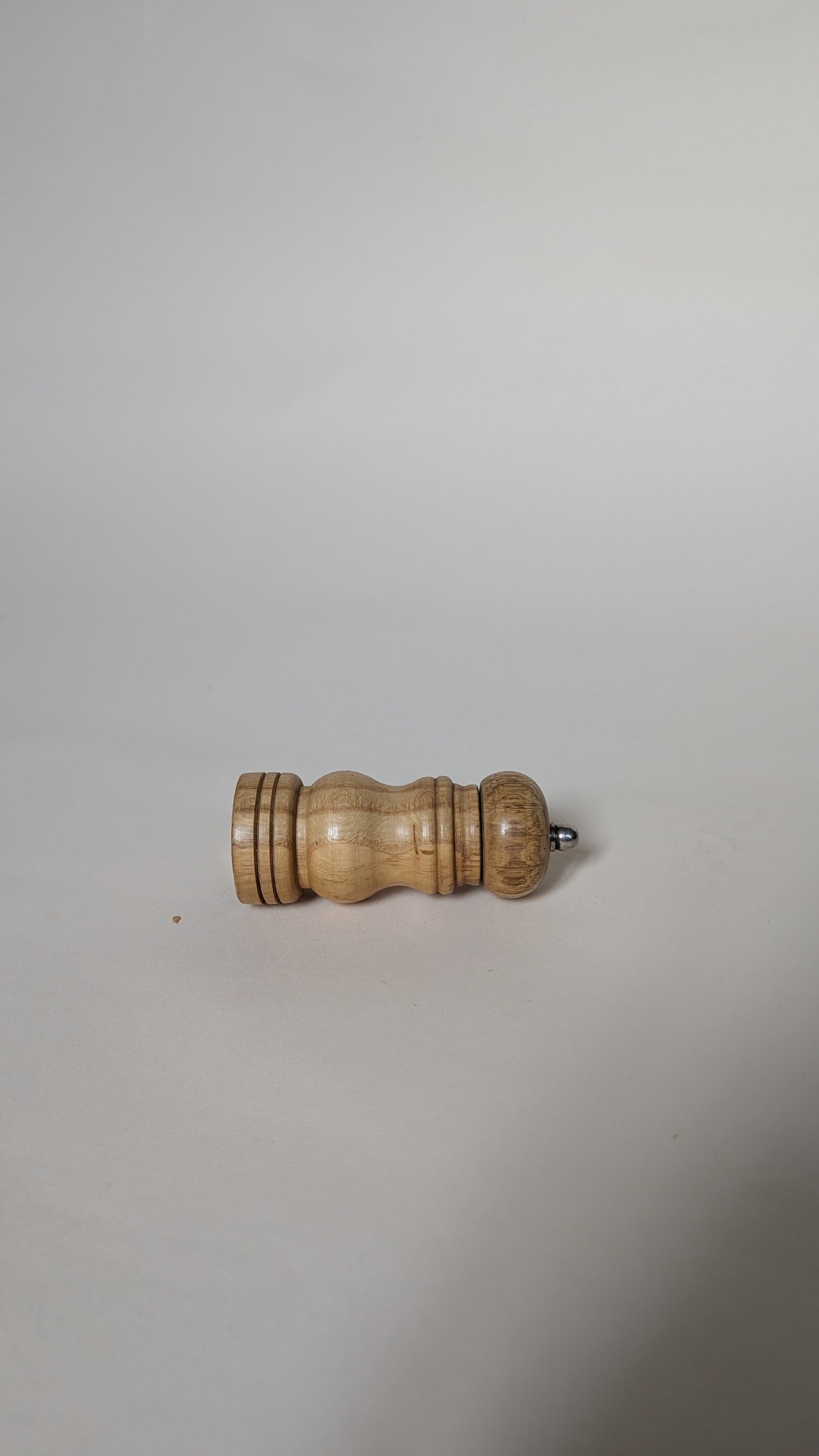 Petit moulin à épices présente une silhouette classique et galbée, accentuée par des rainures décoratives. Il est confectionné en bois clair et naturel, apportant une touche rustique et conviviale à toute table. Le sommet est fini par un bouton métallique qui permet d'ajuster le mécanisme de mouture. Ce moulin est remarquablement compact et léger, idéal pour une manipulation aisée.
