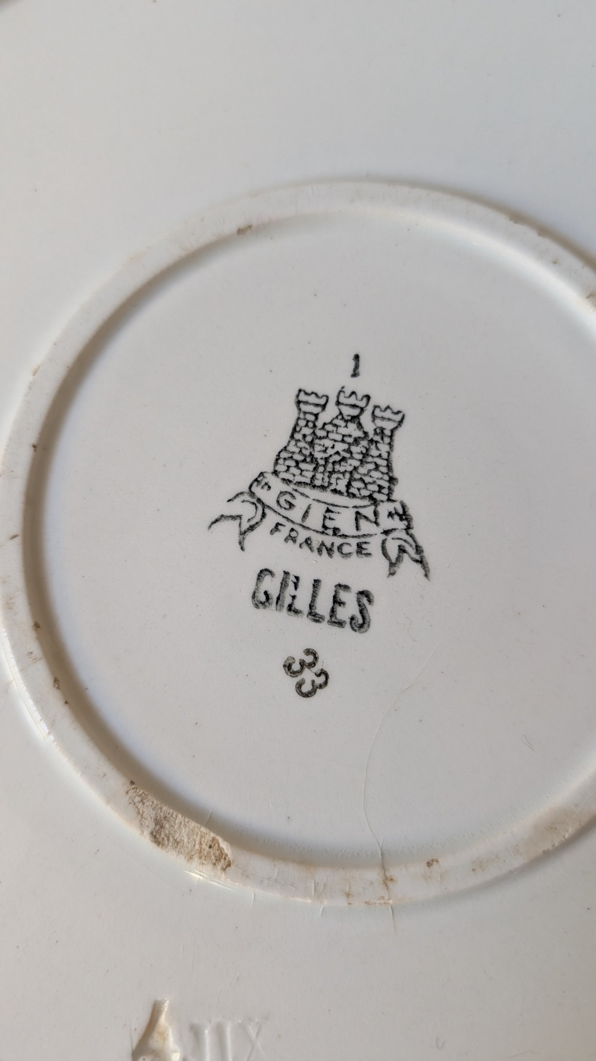Plat de la manufacture Gien (France), modèle Gilles. Décorée de trois filets colorés – rouge, vert et bleu – pour un style sobre et classique. Diamètre 31 cm, poids 900 g. Le plat présente quelques défauts d’usage, mais reste solide et parfaitement fonctionnelle. Idéale pour compléter un service ancien ou pour un usage quotidien.