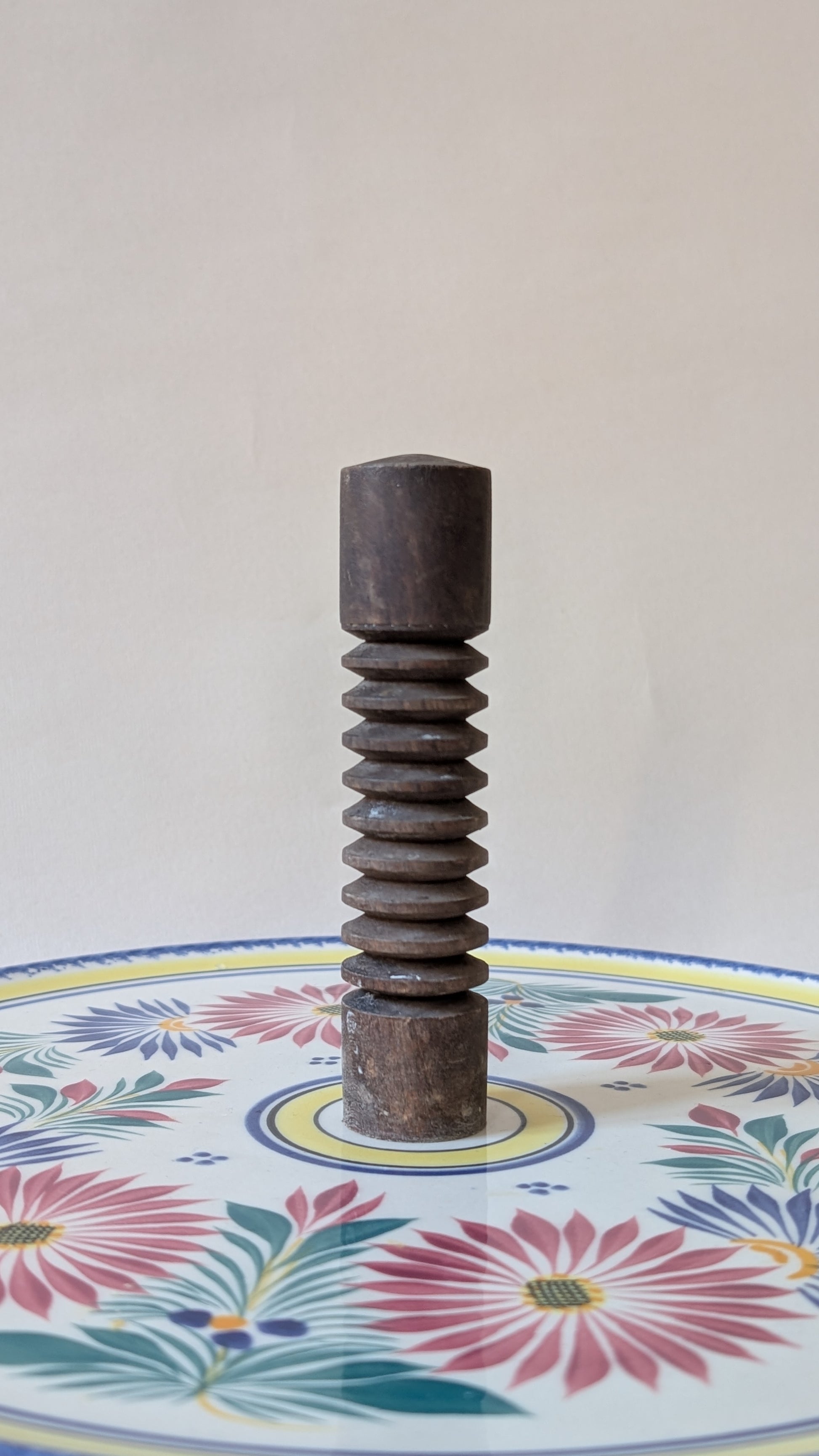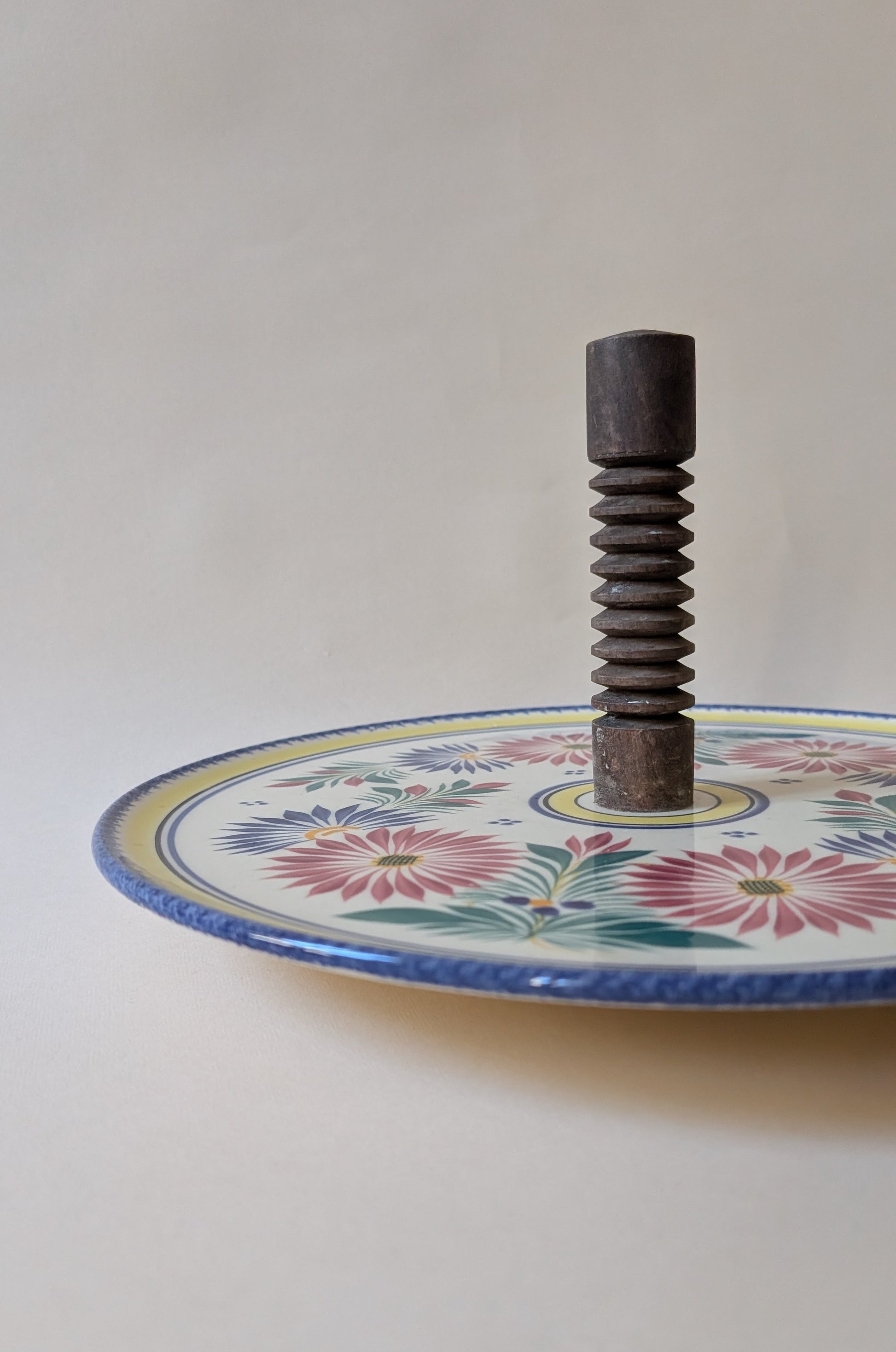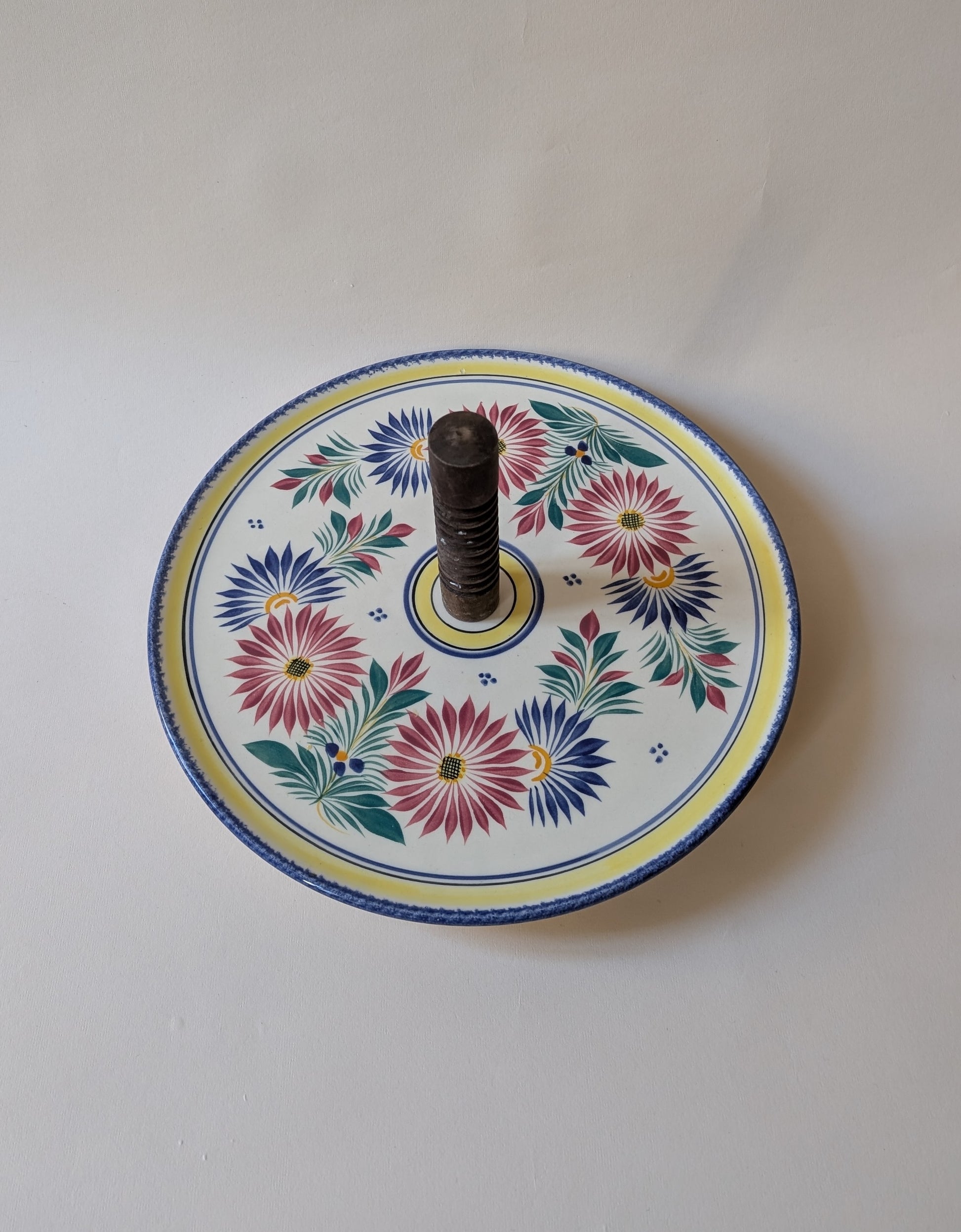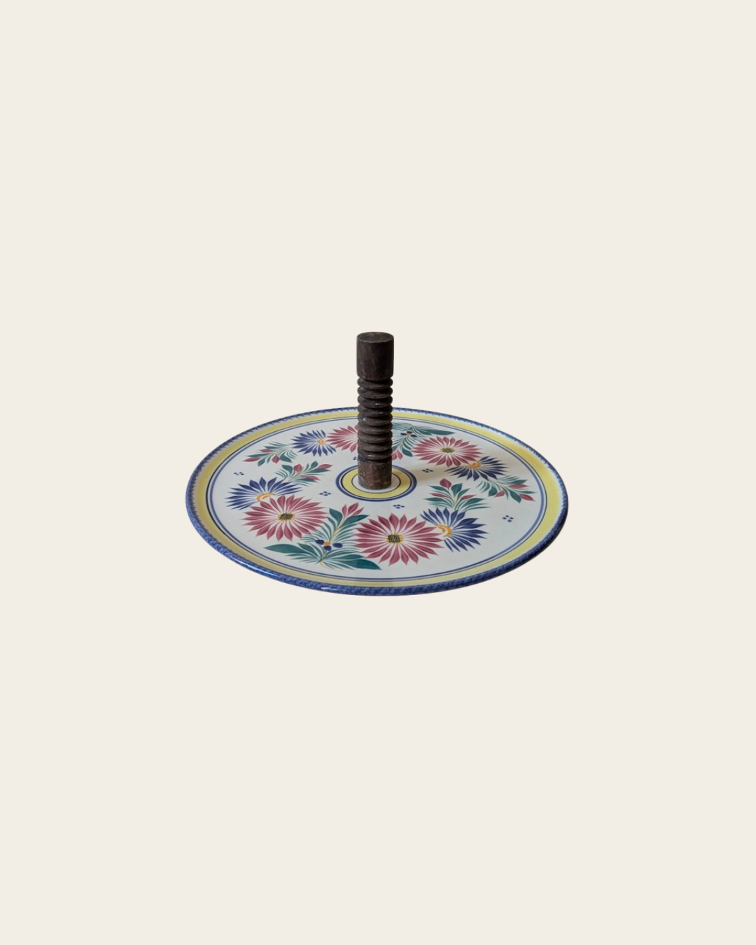 Plateau à fromage Henriot Quimper en faïence décorée, orné de motifs floraux colorés typiques de l’atelier. Sa large surface de 33 cm accueille aisément une belle sélection de fromages, avec une poignée centrale en bois tournée pour une prise en main pratique. Poids : 1,2 kg.