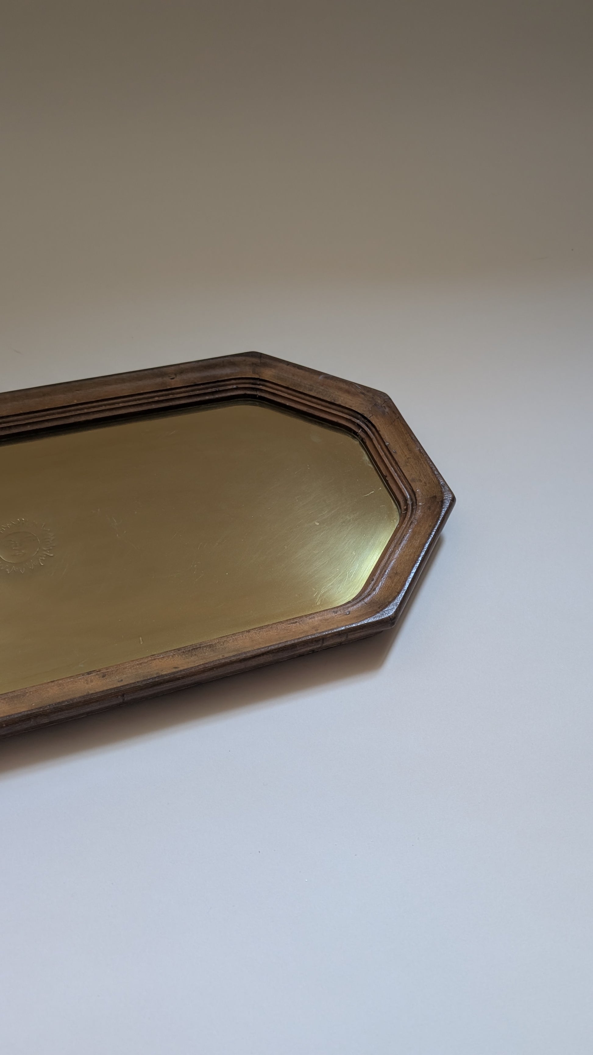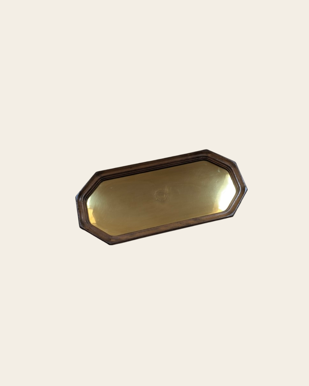 Plateau ancien rectangulaire aux angles biseautés, en laiton poli avec encadrement en bois.