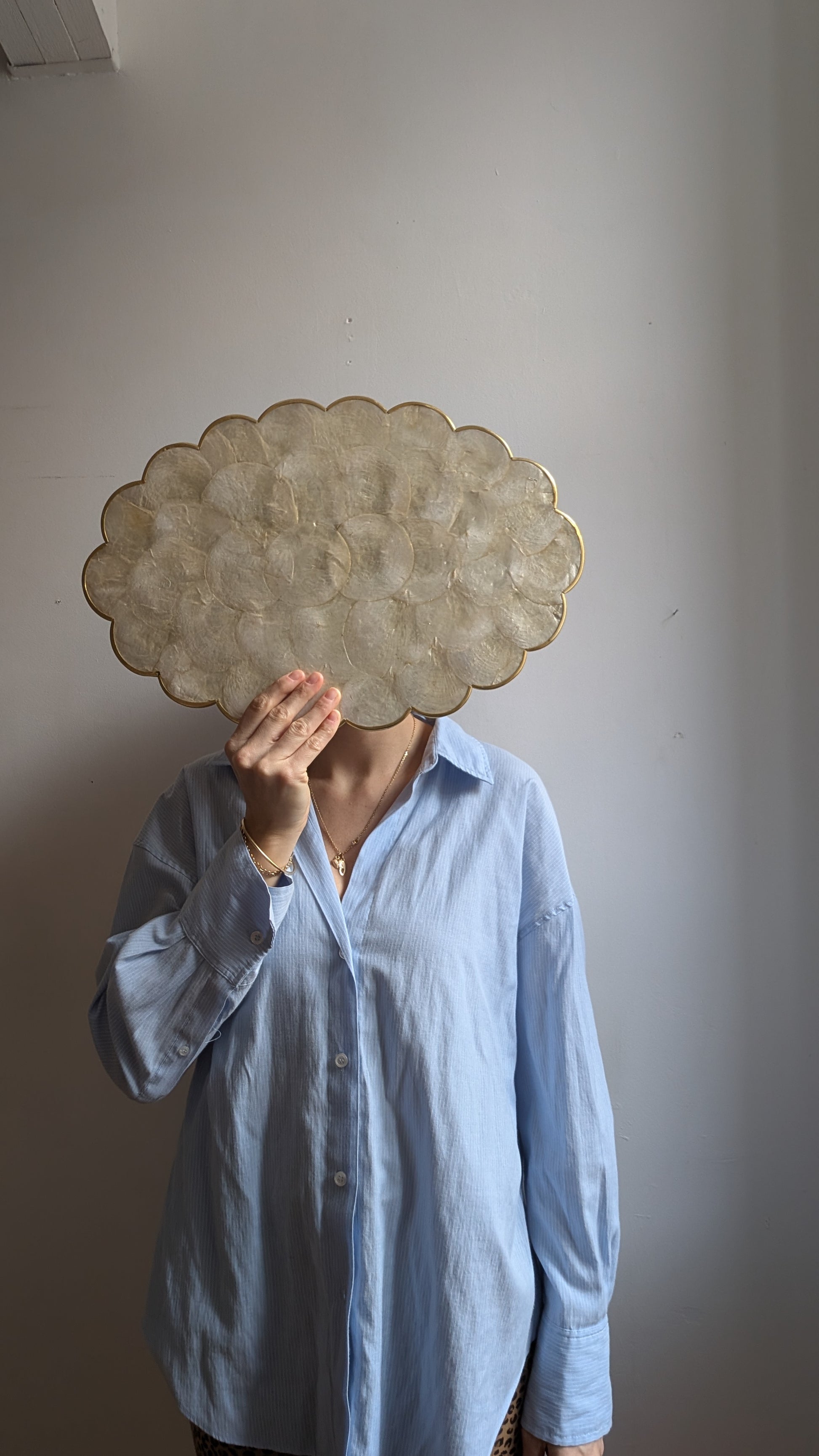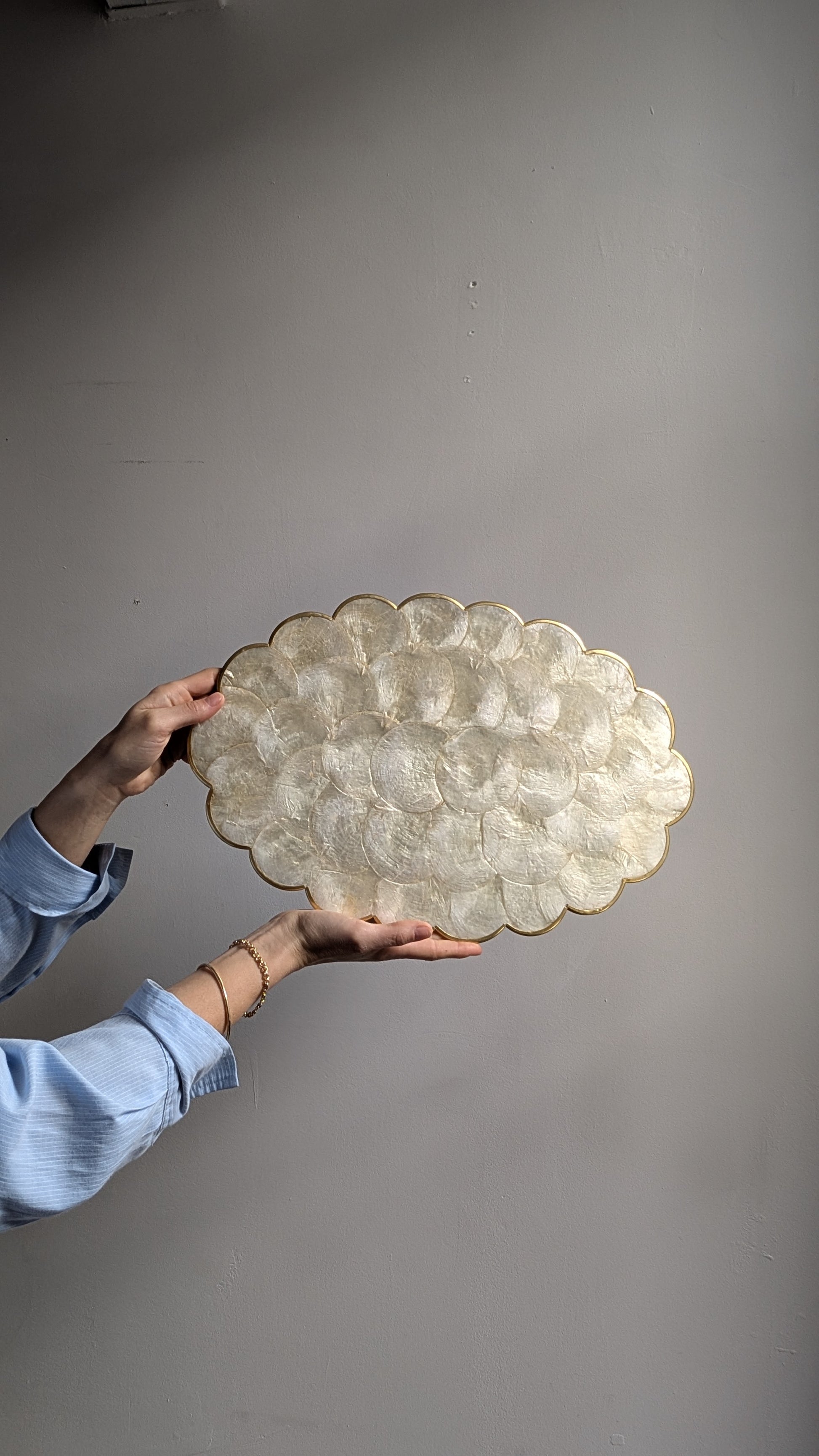 Ce plateau ovale se distingue par son bord polylobé (festonné) et son revêtement en marqueterie de nacre aux reflets nacrés. Un fin cerclage doré vient souligner son contour élégant.