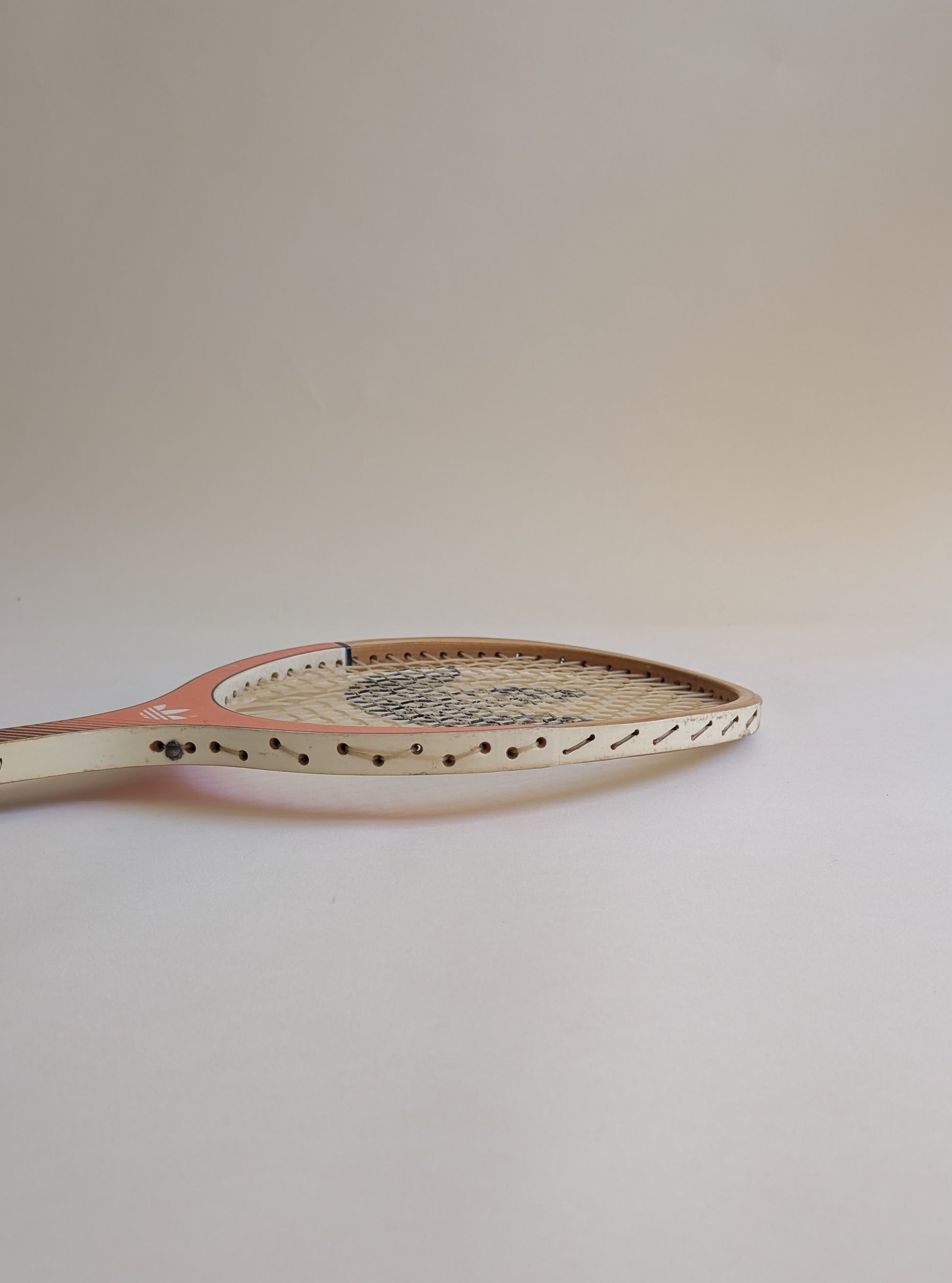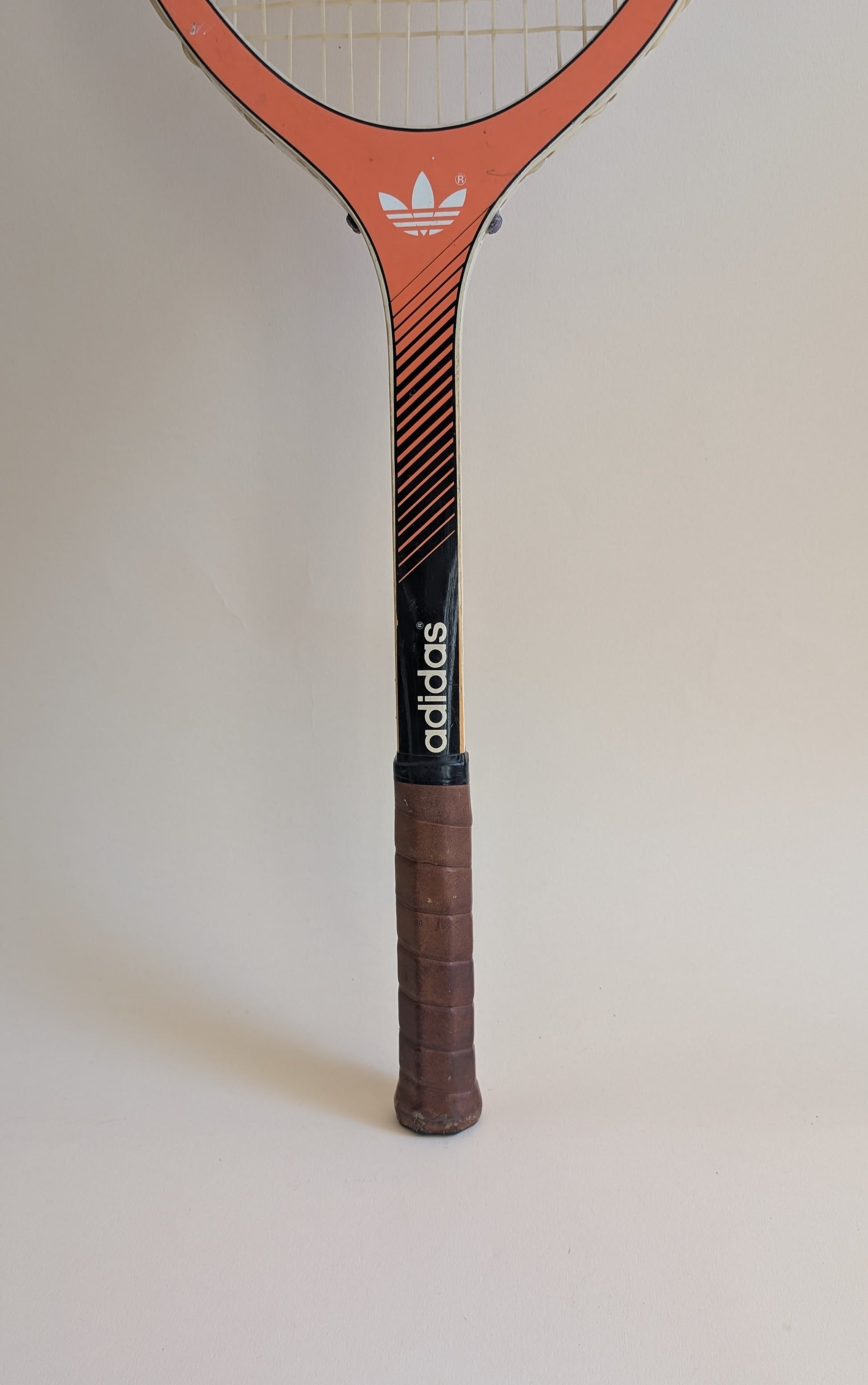 Raquette de tennis Adidas, marquage sur le côté "ADS 020 Lady". La tête de la raquette n'est pas plate.