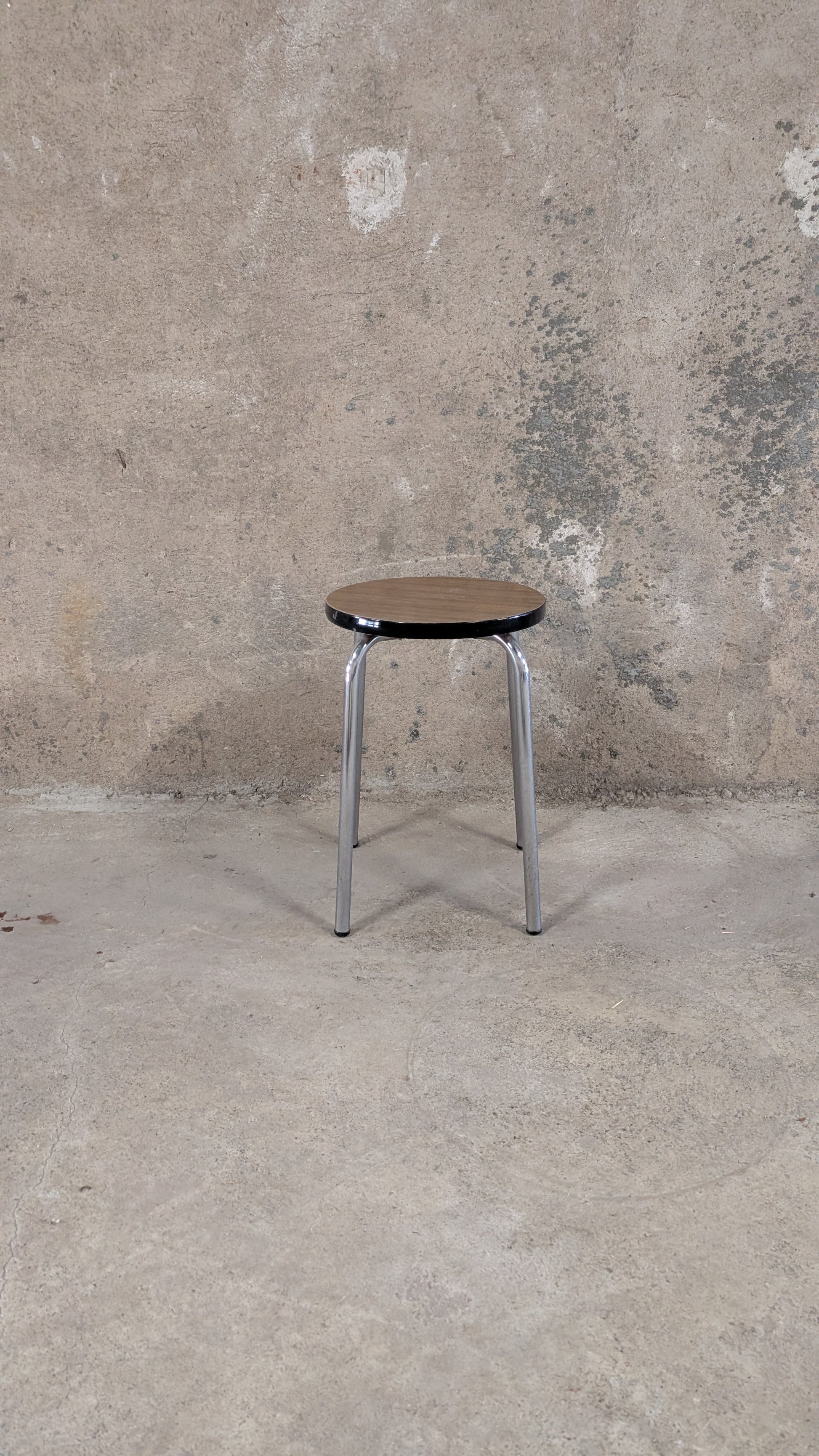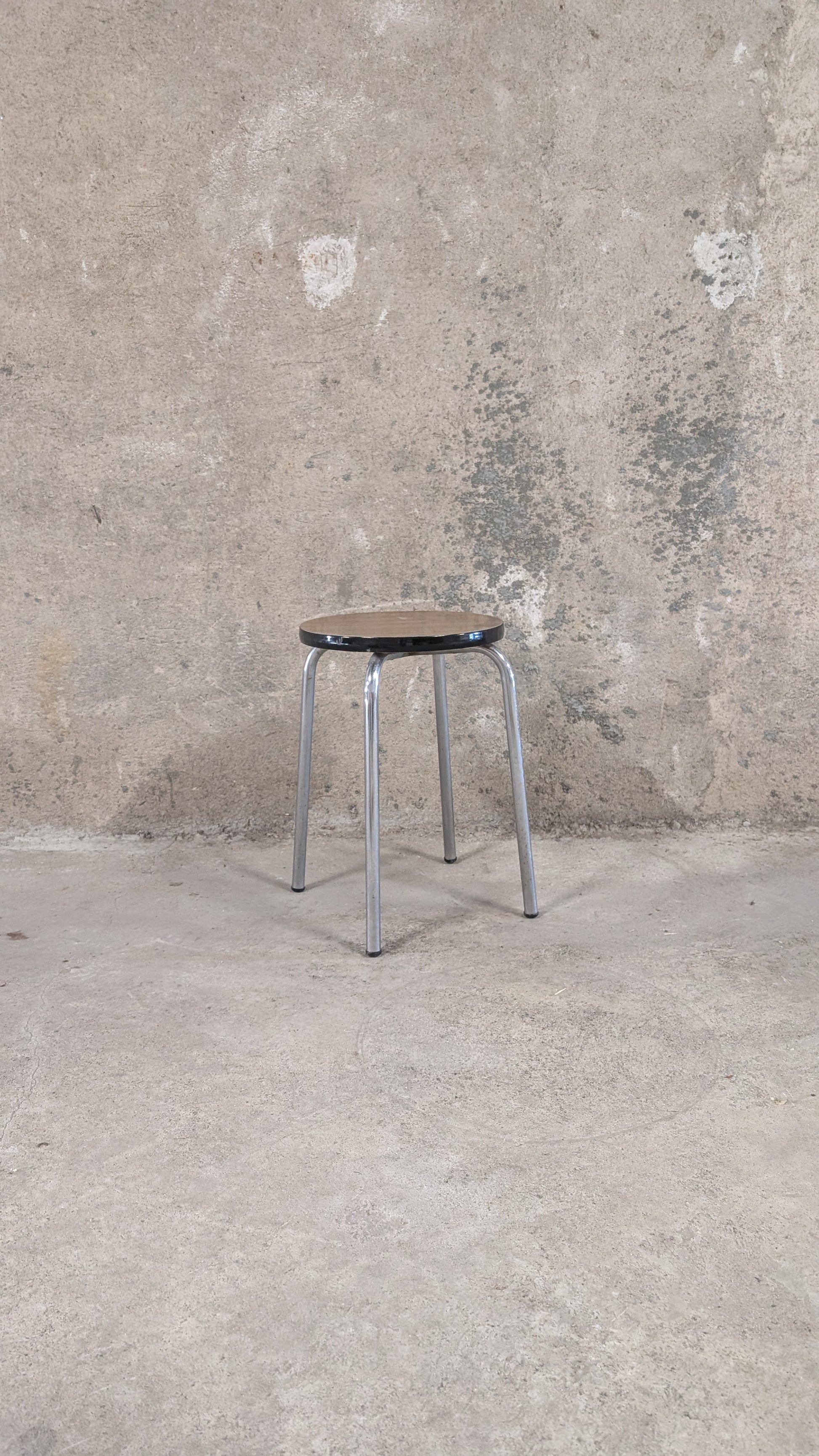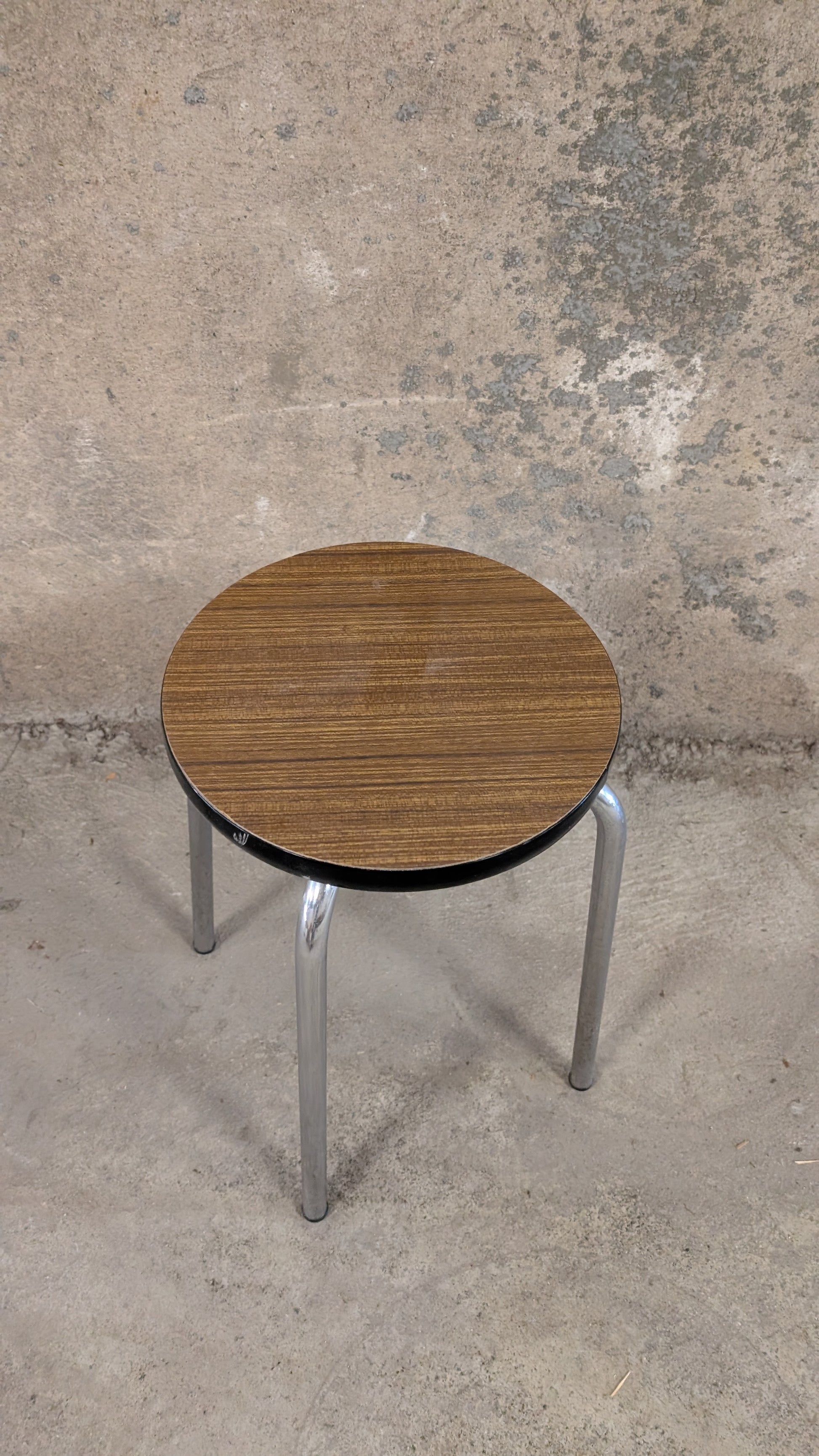 Tabouret au design sobre et typique des années 50-60, avec une assise ronde en formica. Idéal en appoint dans une cuisine, une entrée ou comme petite table d’appoint.