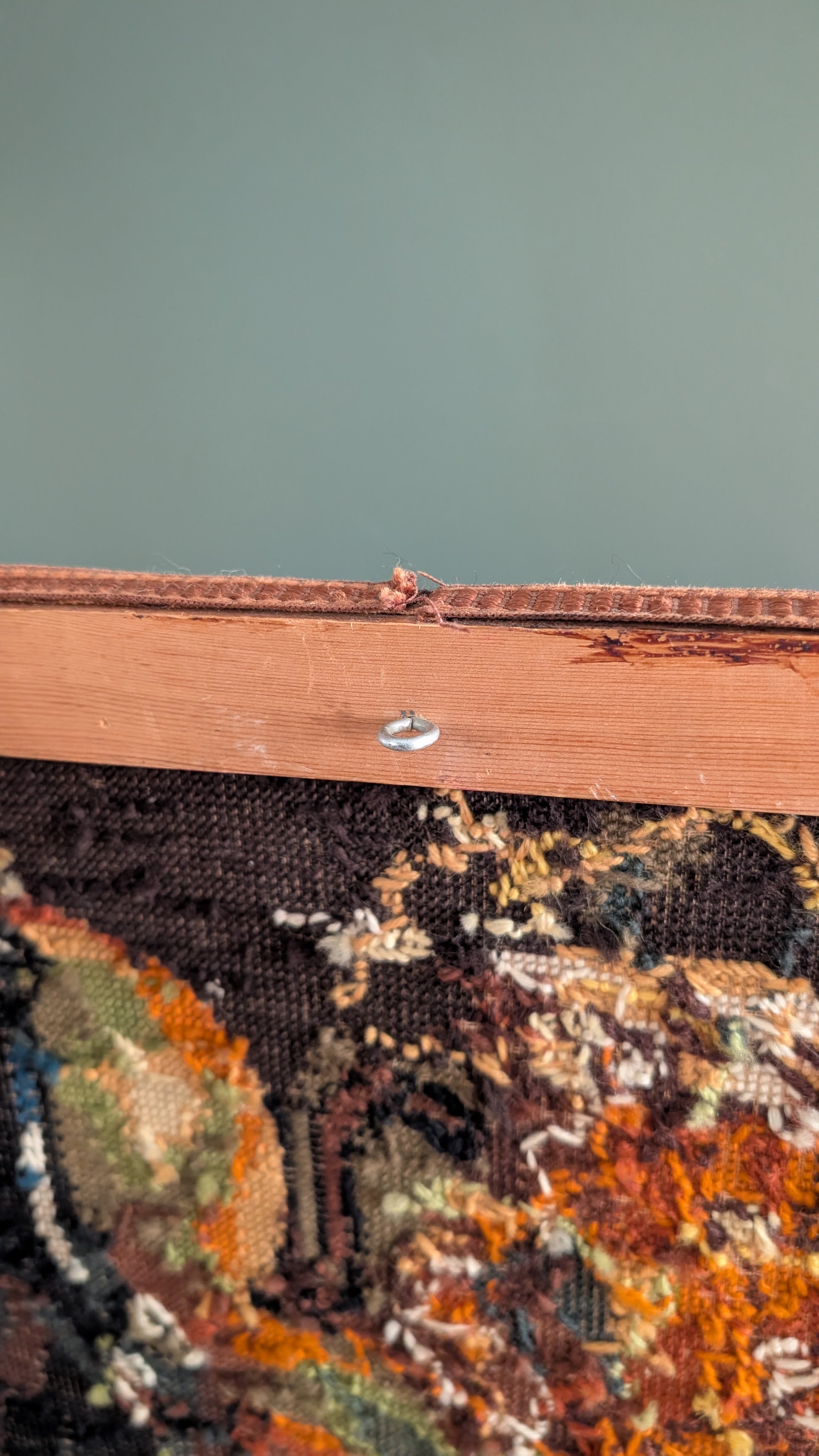 tapisserie représentant une nature morte avec des fruits, du pain, une bouteille de vin et des feuillages disposés sur une table. Les couleurs sont chaudes et contrastées, avec des tons bruns, verts et orangés qui mettent en valeur les formes et les détails. L’ensemble évoque une scène rustique et classique, typique des compositions de nature morte.