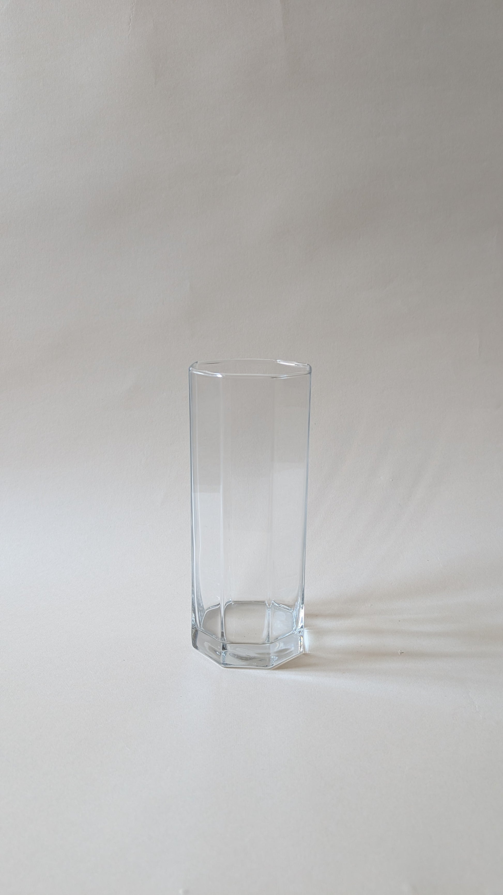 Vase en verre octogonal. Hauteur : 21 cm. Diamètre : 8,5 cm. Poids : 600 g. Sa silhouette fine est adaptée pour une tige unique, quelques fleurs ou de petites compositions. Stable et discret, il convient aussi bien pour un usage quotidien que comme élément décoratif minimaliste.